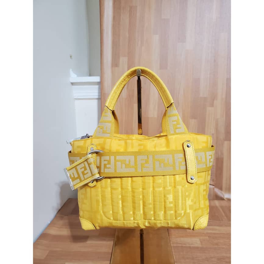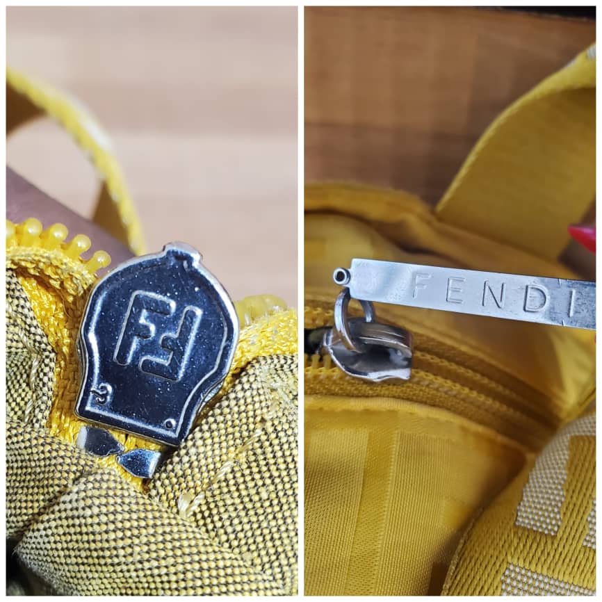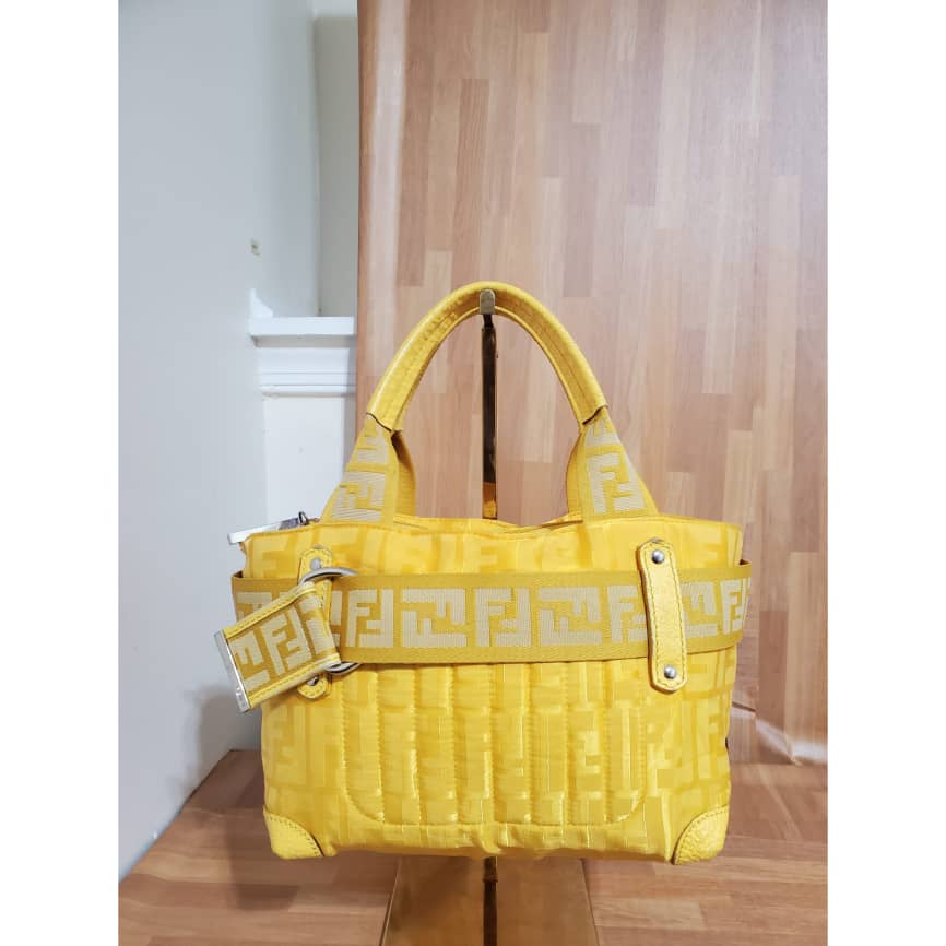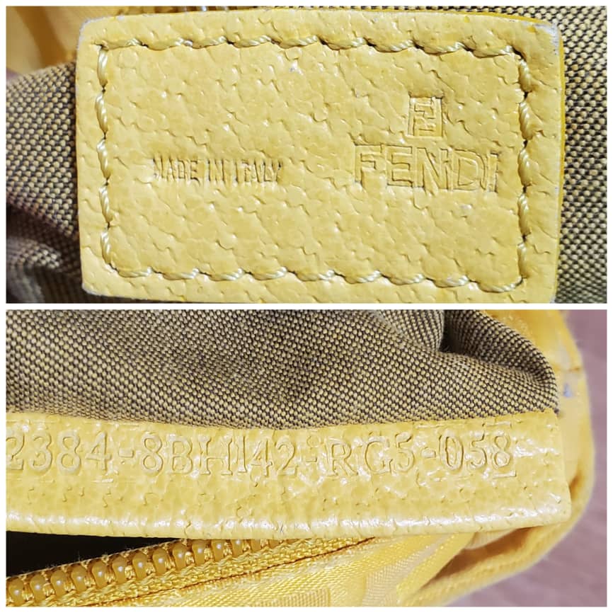 This authentic FENDI Zucca Zip Code Shoulder Yellow Bag is in it’s pre-owned good condition. The exterior us clean and beautiful. The edges shows scratches on the leather. Handles shows sign of scratch on the leather. Interior is clean and beautiful.