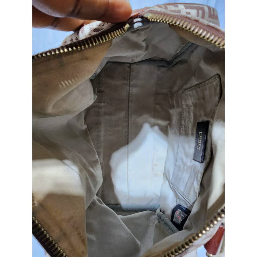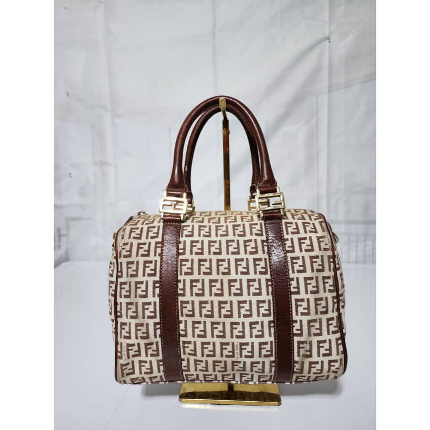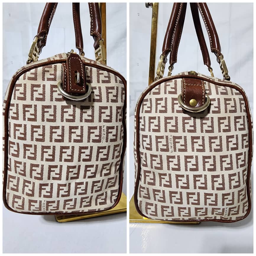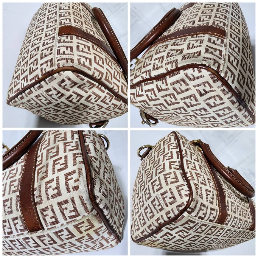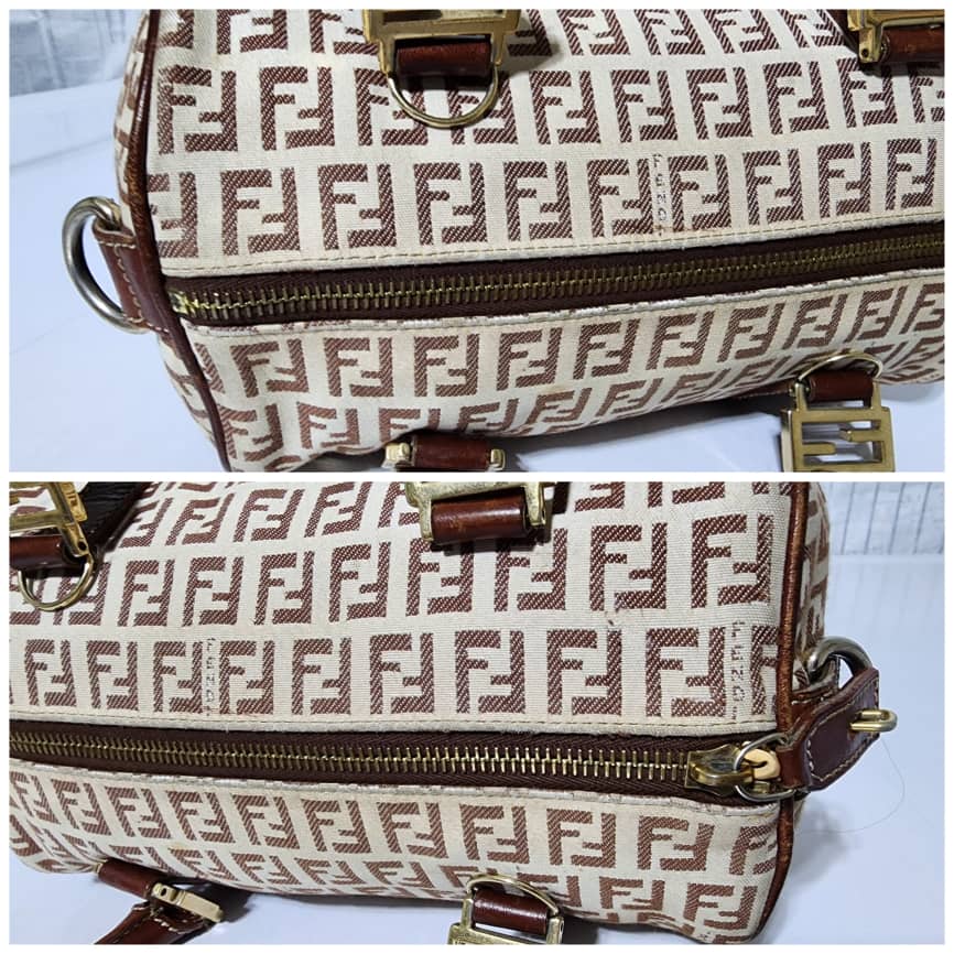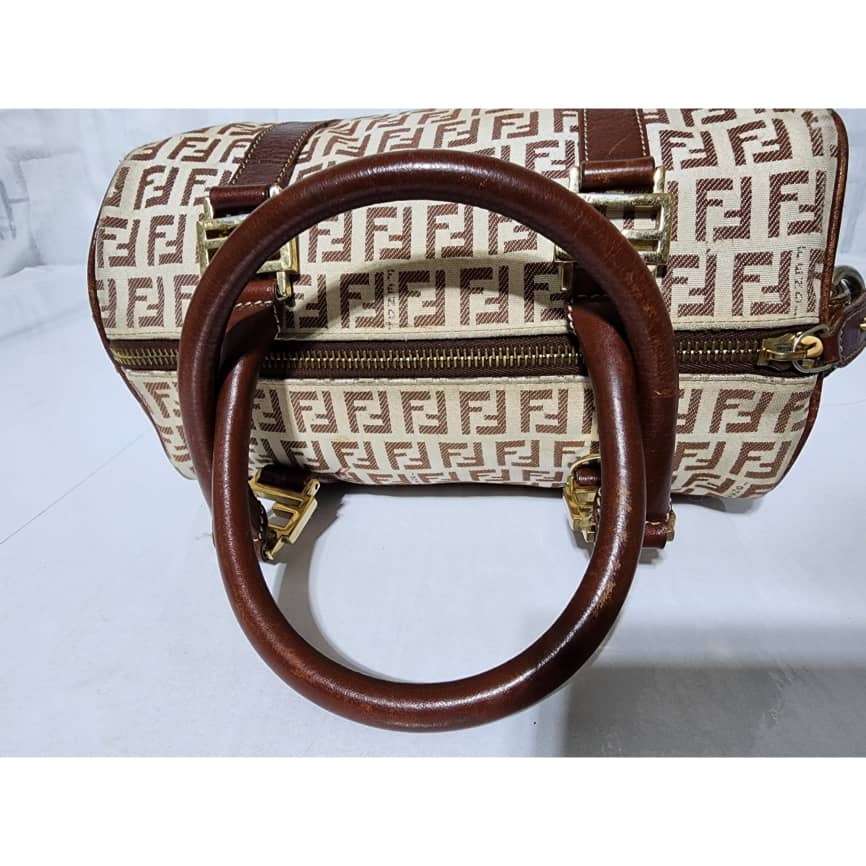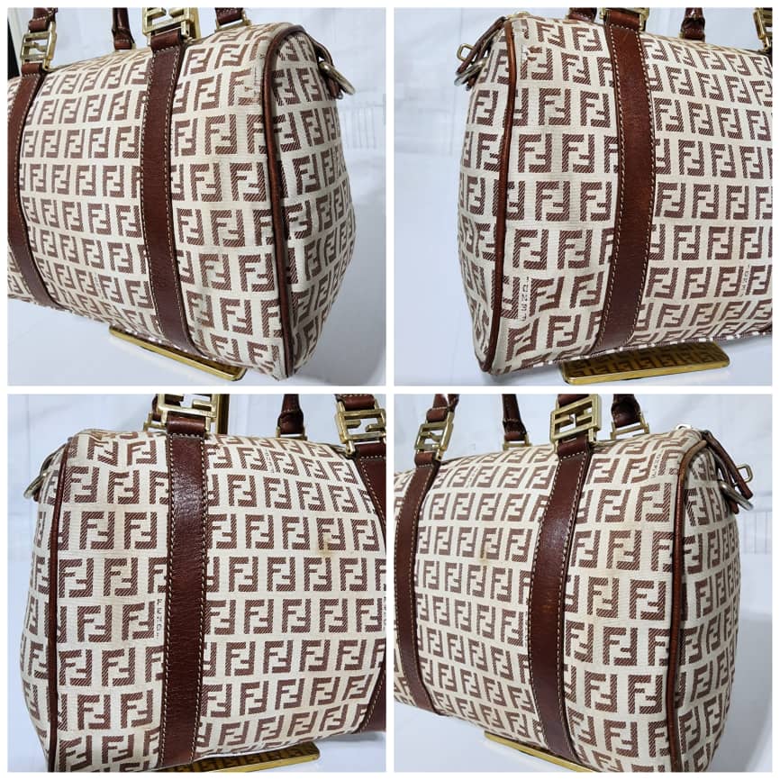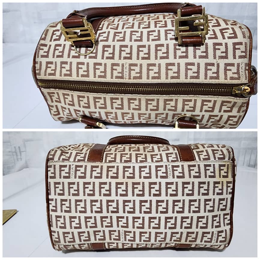 This authentic Fendi Zucchino Canvas Bauletto Boston Bag Brown/Beige is in it’s pre-owned condition. The exterior shows sign of wear to it, it shows some stains to the FF fabric. Interior is clean however, it shows sign of wear to it. Interior is clean however, it shows sign of wear. The edges shows scratches to it.