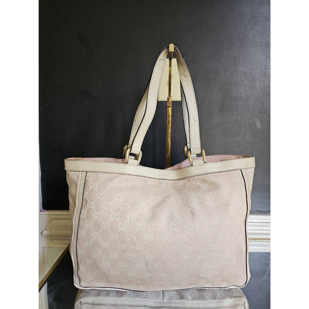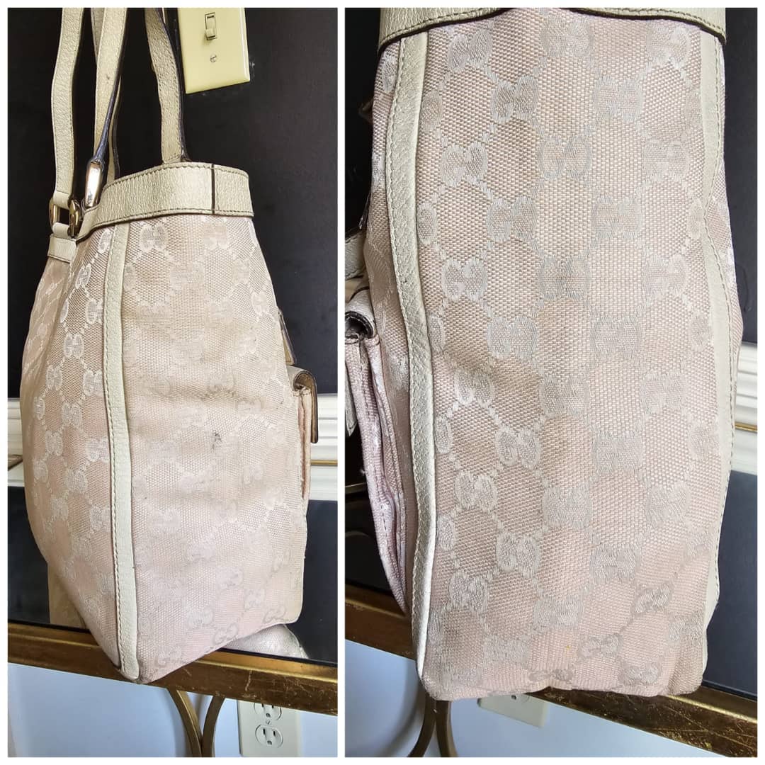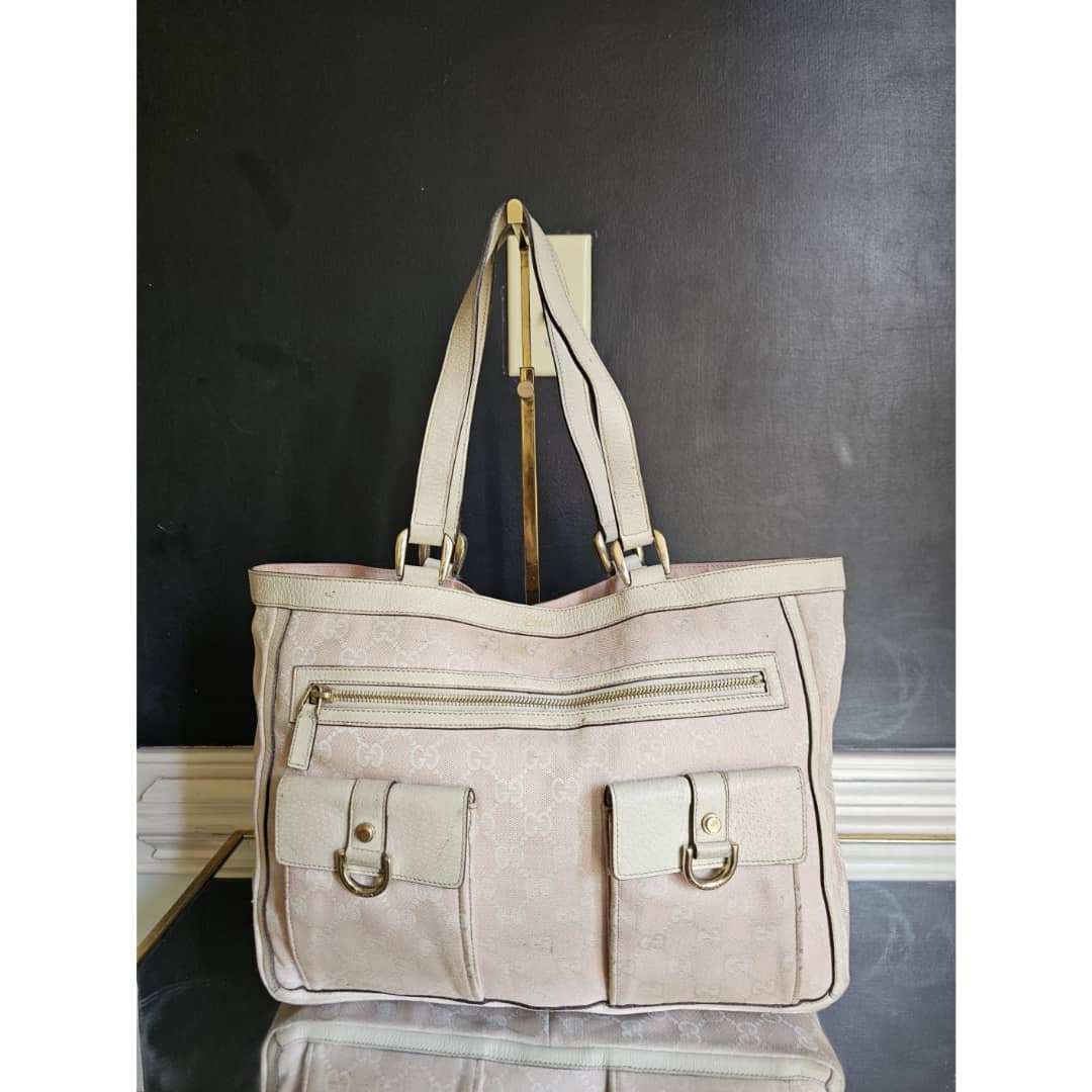 This authentic Gucci Abbey D-Ring Leather Tote Bag is in it’s good pre-owned condition. The exterior canvas and off-white leather trim is clean and beautiful, the leather trim shows some wear [ kindlylookatpicturescloselyabove. Interior is clean. Gold hardware. Great condition.