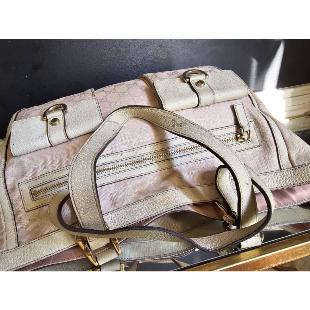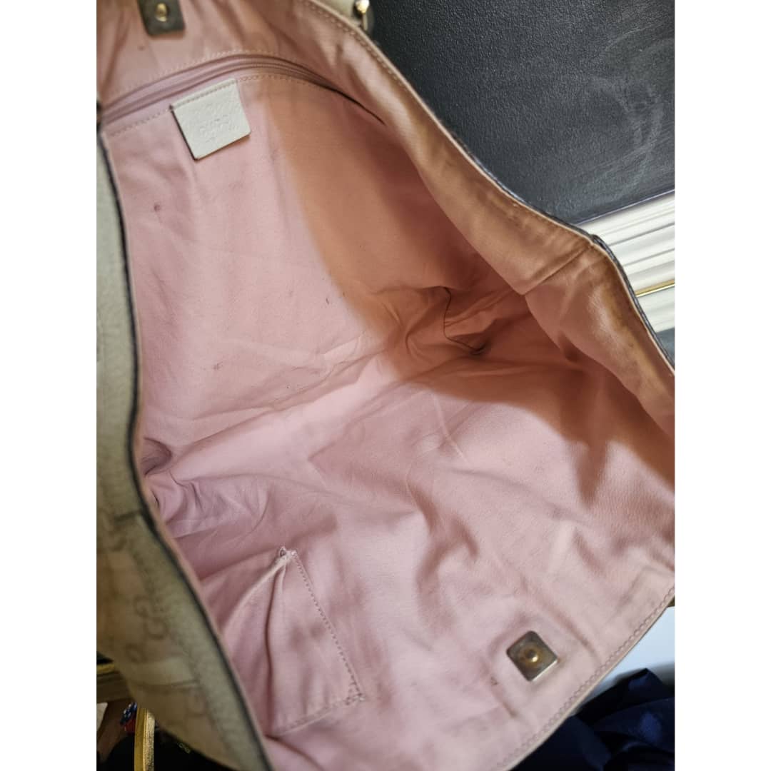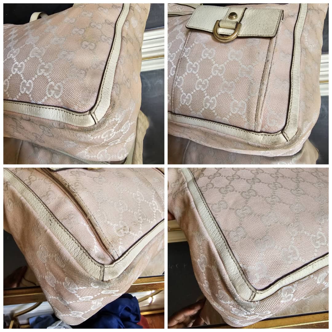 This authentic Gucci Abbey D-Ring Leather Tote Bag is in it’s good pre-owned condition. The exterior canvas and off-white leather trim is clean and beautiful, the leather trim shows some wear [ kindlylookatpicturescloselyabove. Interior is clean. Gold hardware. Great condition.