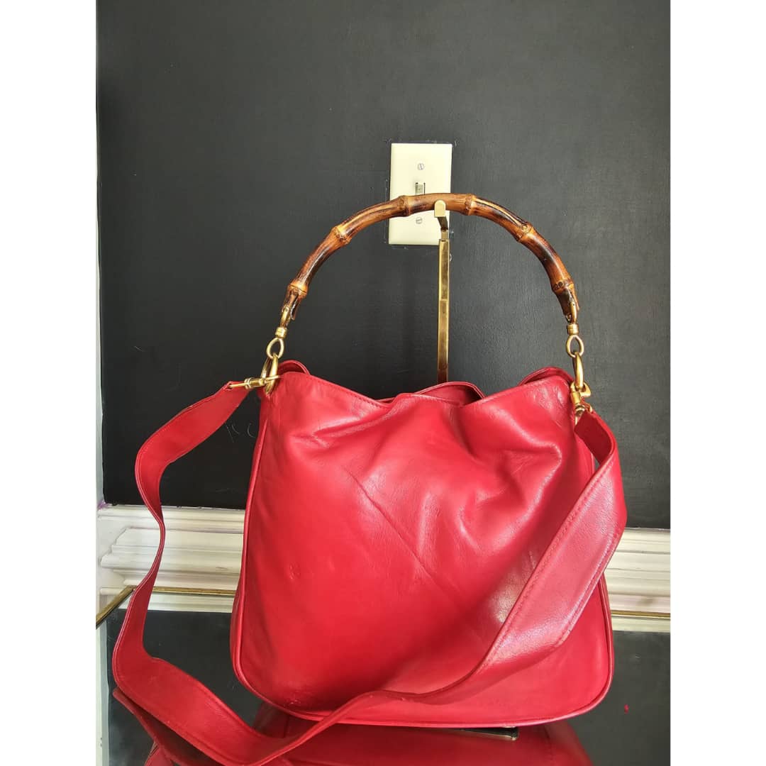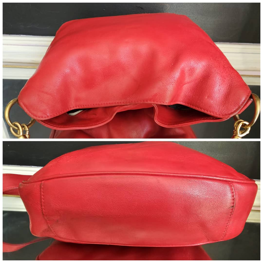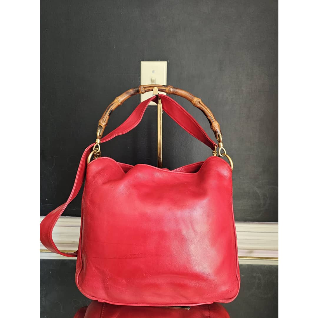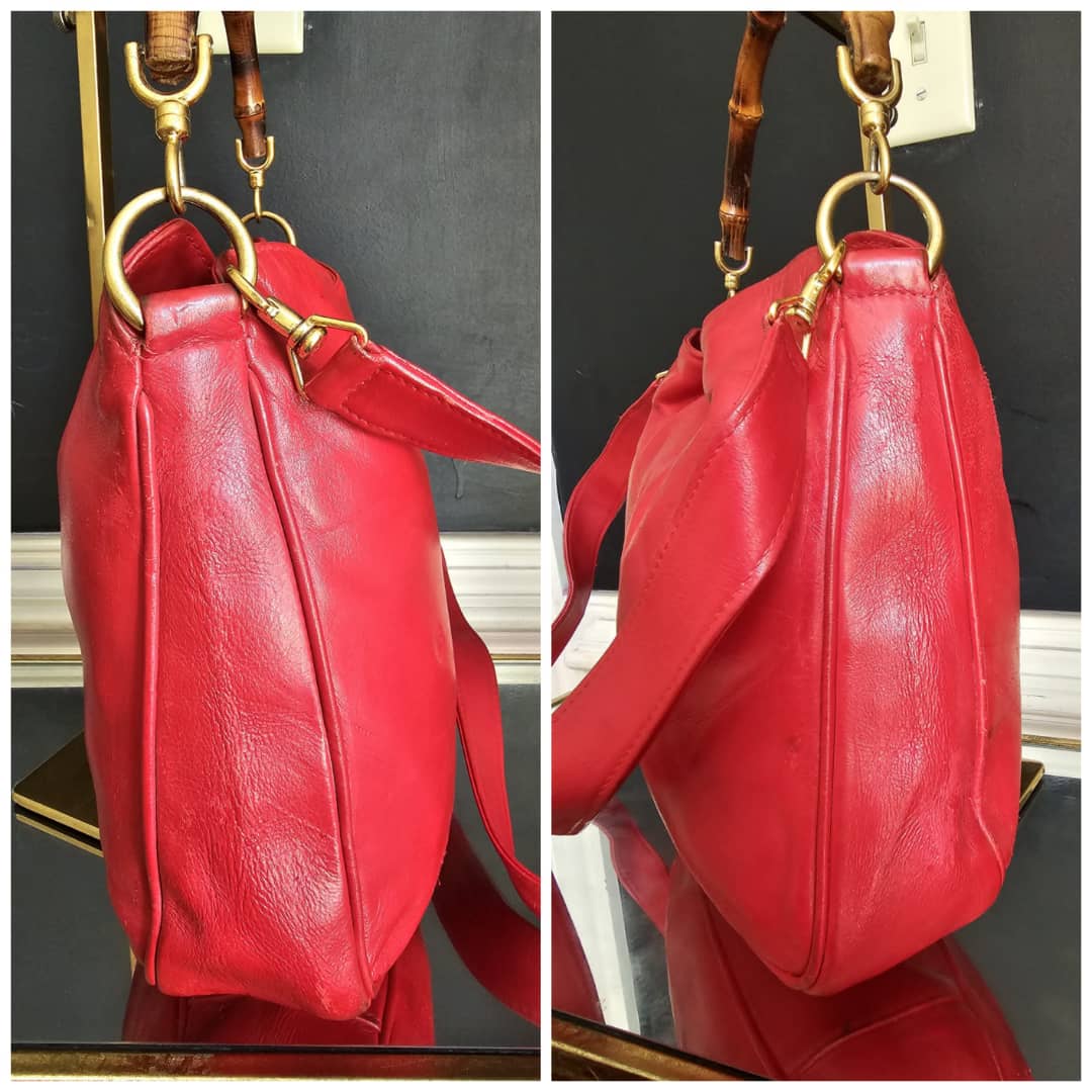 This authentic Gucci Bamboo 2Way Shoulder Bag Red is in itβs good pre-owned condition. The exterior leather is clean and beautiful, shows little black stain across the bag. Interior is clean. Can be worn as a handbag or shoulder bag. Beautiful bag.