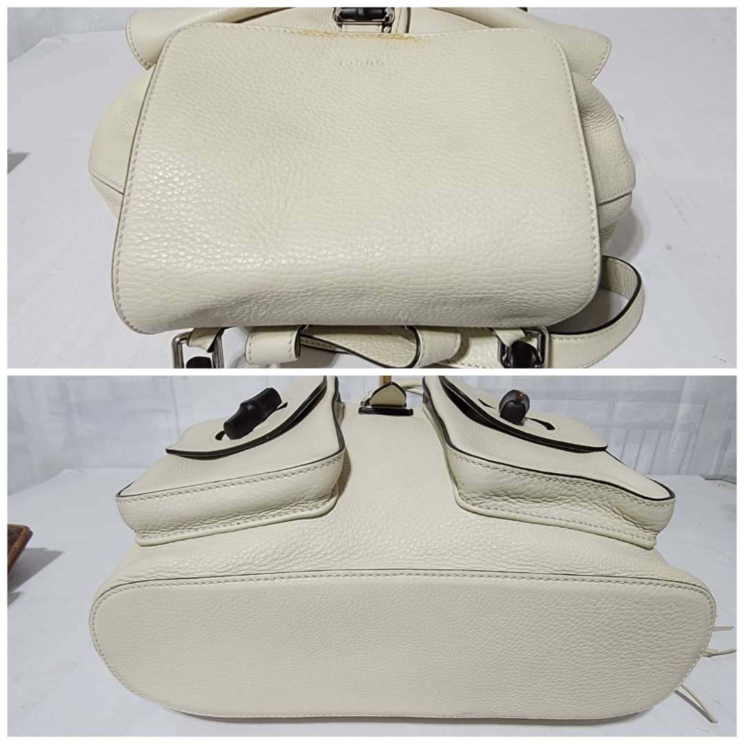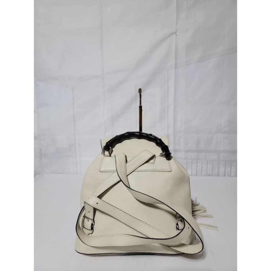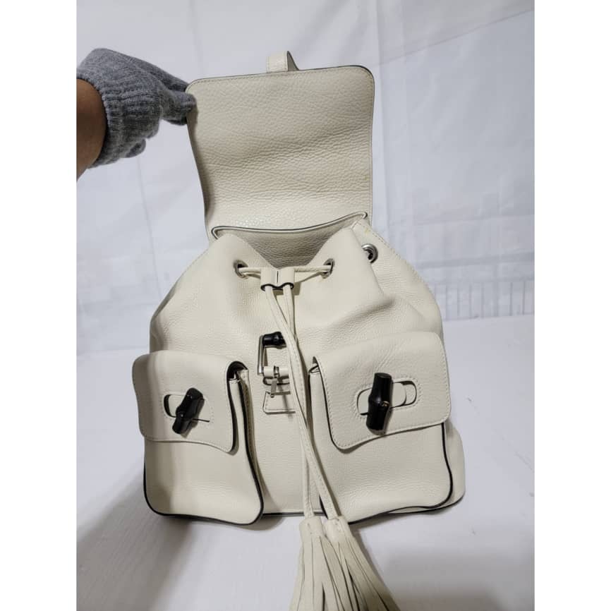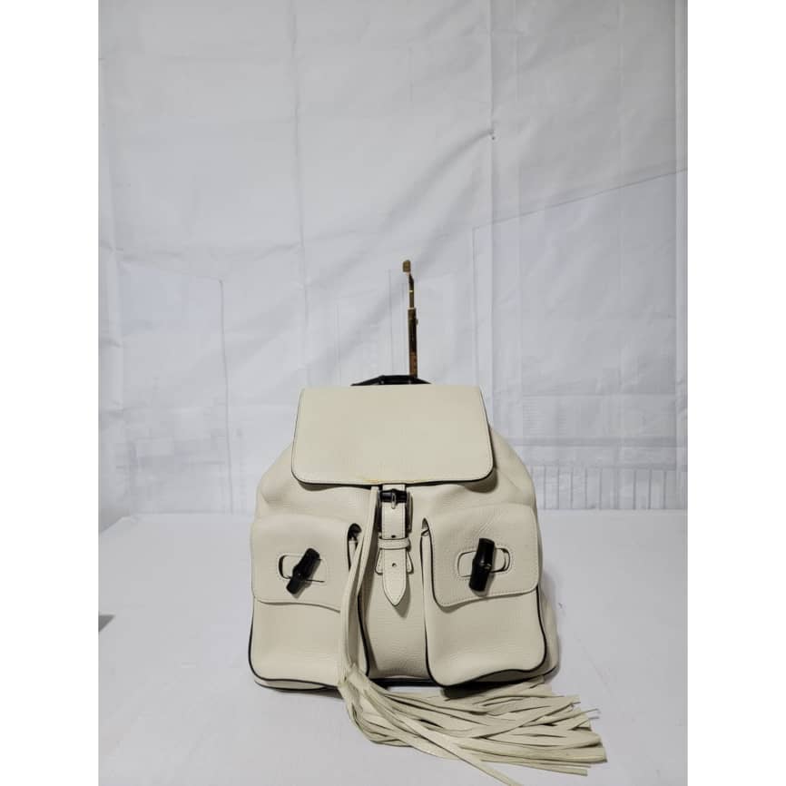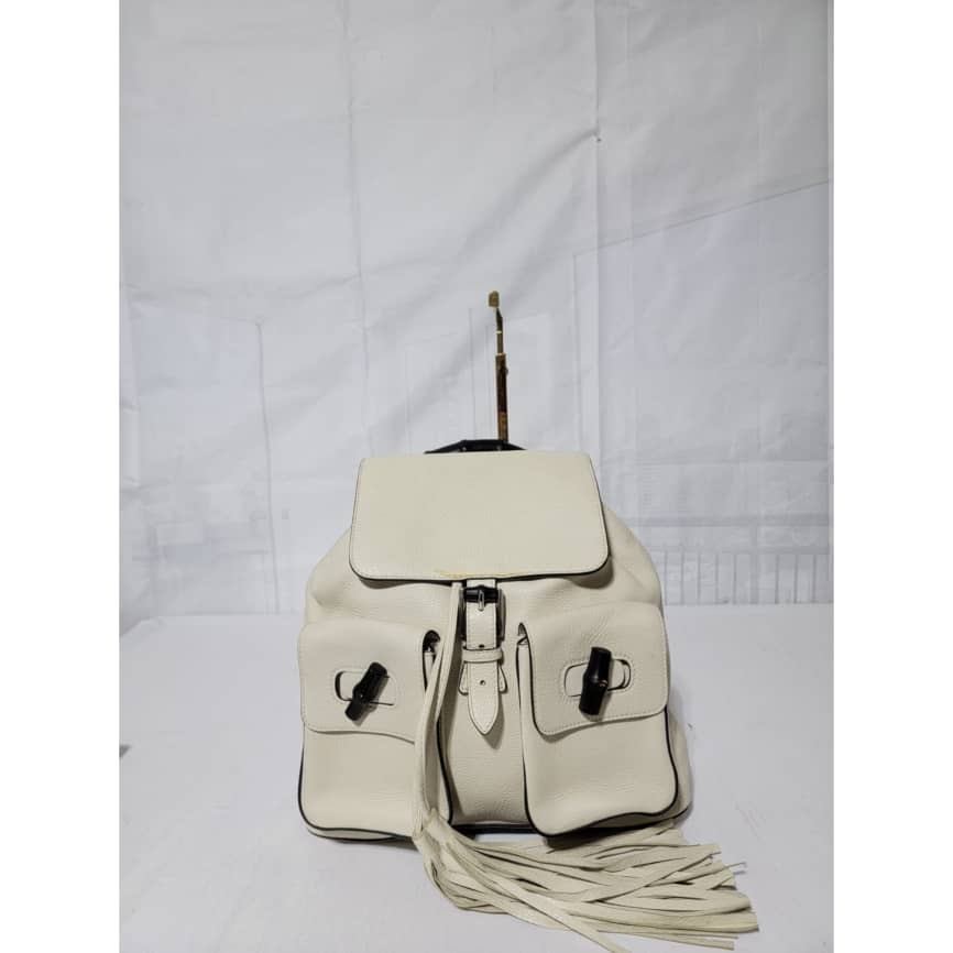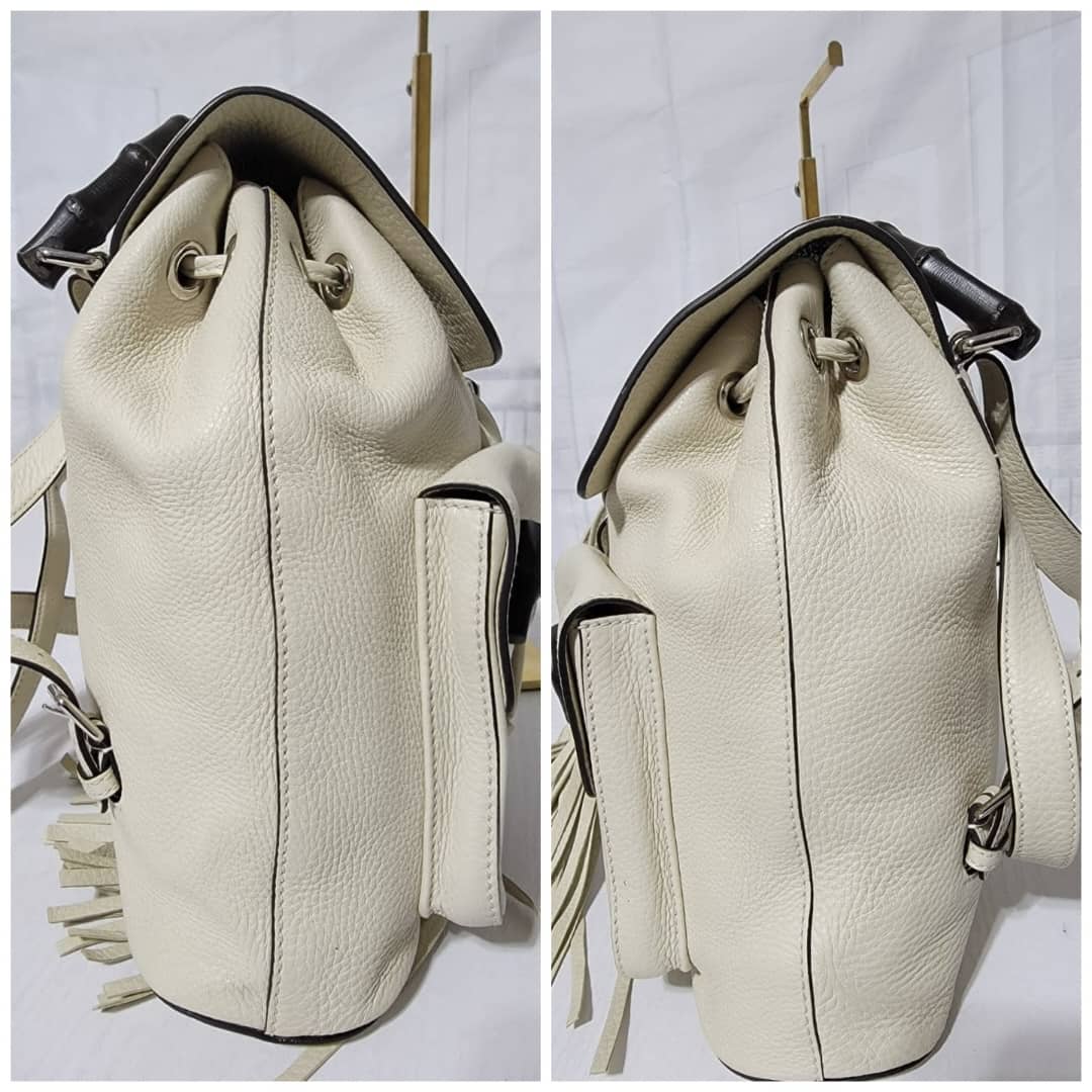 This authentic Gucci Bamboo Rucksack Fringe Backpack Off-White is in it’s good pre-owned condition. The exterior is clean. Interior is clean. It has a black bamboo turn lock on the two pocket. It has a drawstring with fringe.