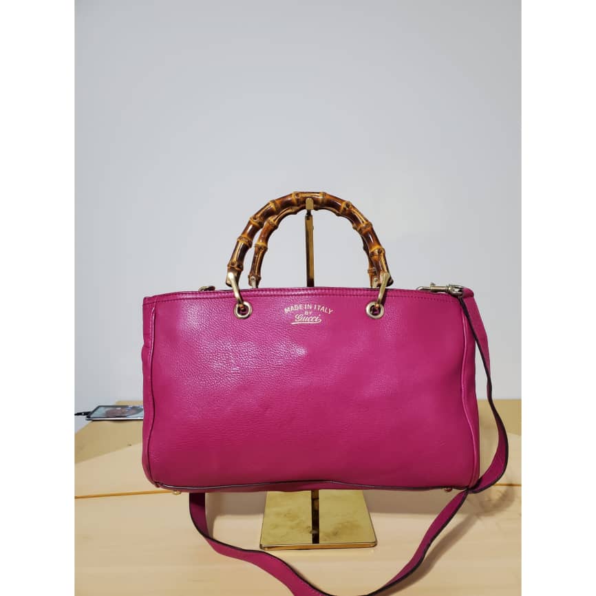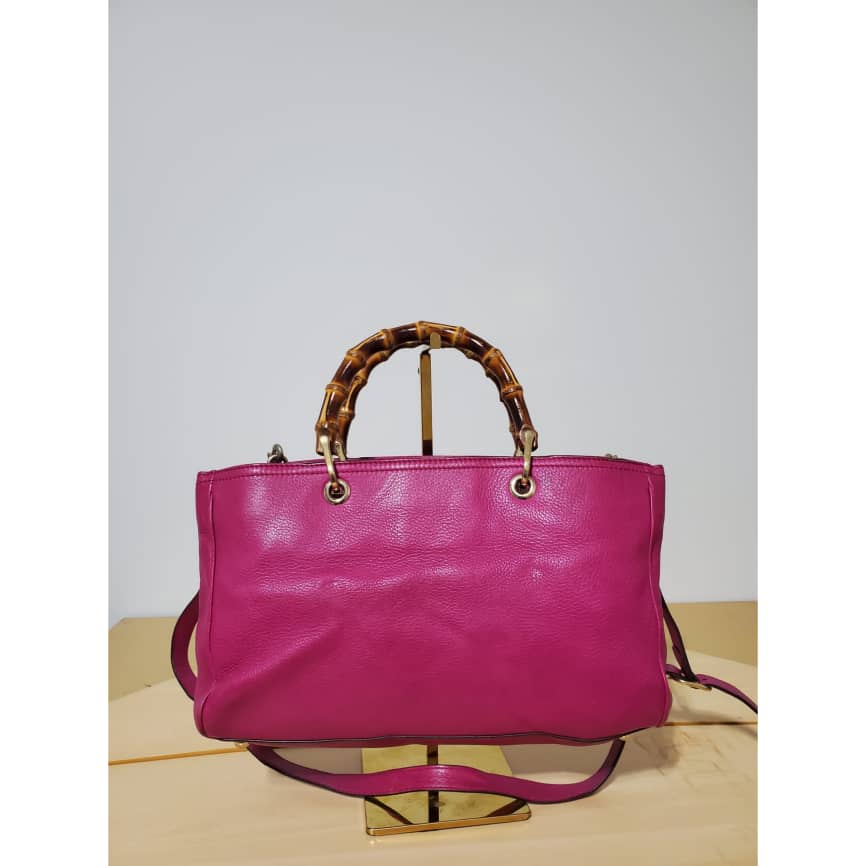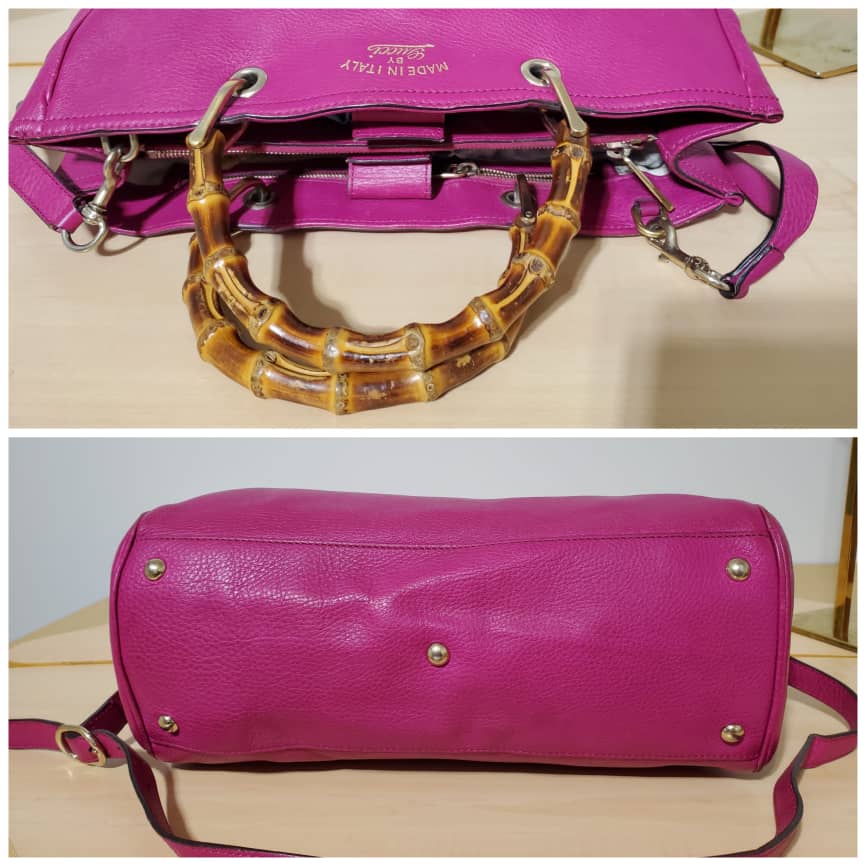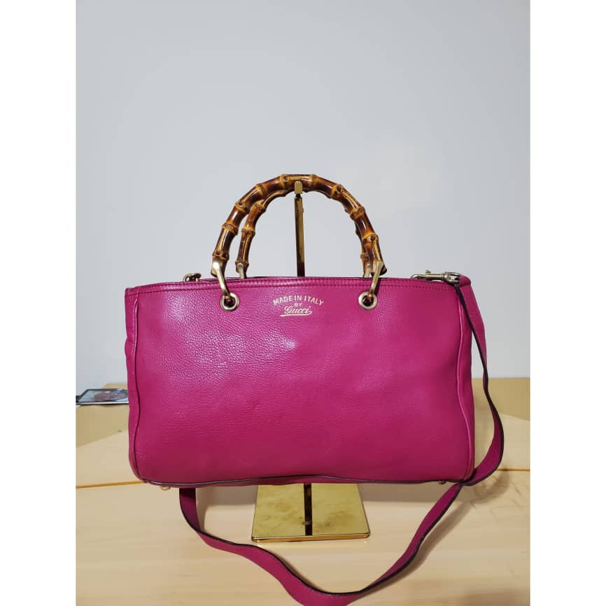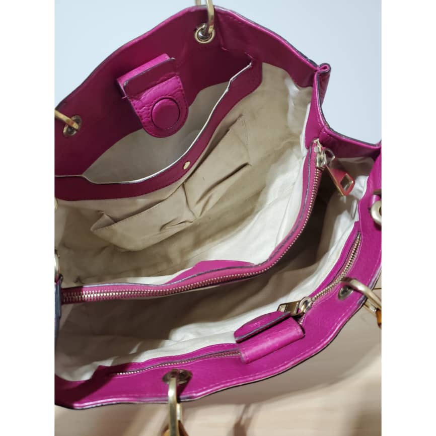 This authentic Gucci Bamboo Shopper Tote Leather Medium pink bag is in it’s pre-owned condition. The exterior leather is clean and beautiful. Interior is clean. Beautiful color. The base edges shows little scratches. Gold hardware. Beautiful Bamboo handles. and a Shoulder strap