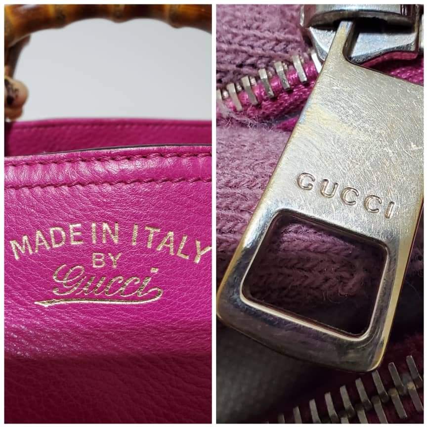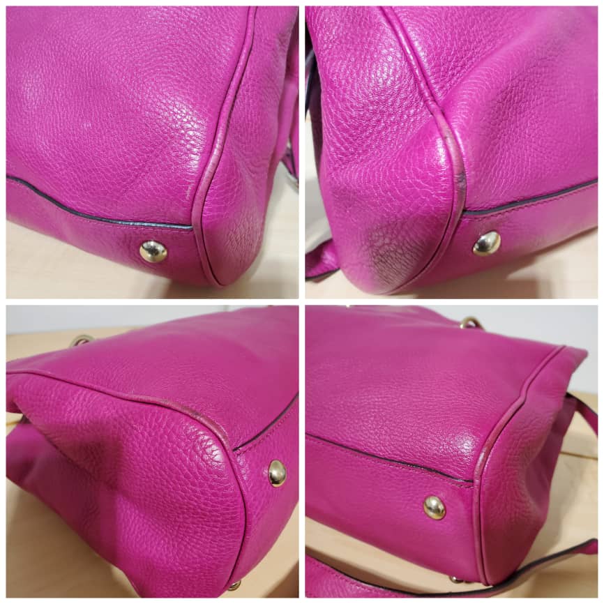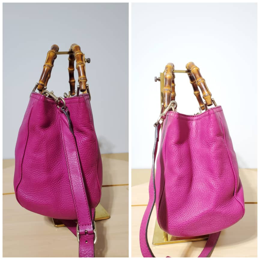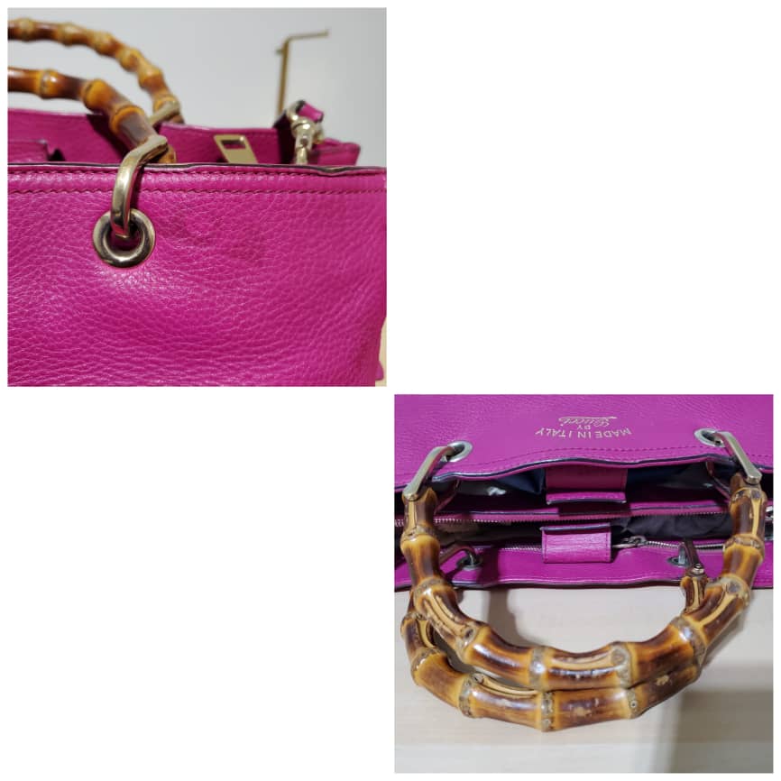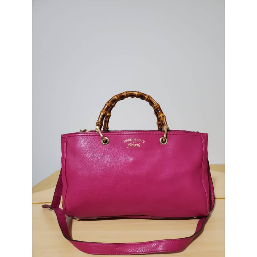 This authentic Gucci Bamboo Shopper Tote Leather Medium pink bag is in it’s pre-owned condition. The exterior leather is clean and beautiful. Interior is clean. Beautiful color. The base edges shows little scratches. Gold hardware. Beautiful Bamboo handles. and a Shoulder strap