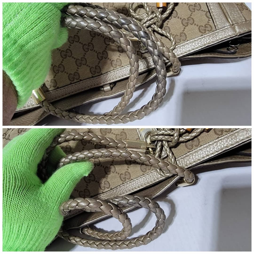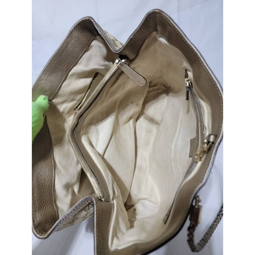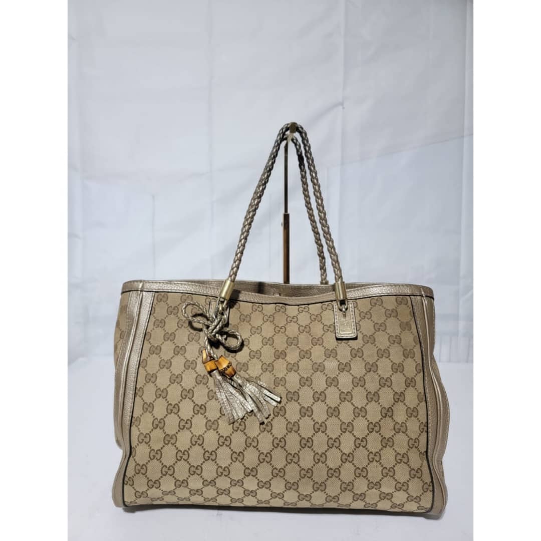 This authentic Gucci Bella Original Canvas GG Tote Bag Beige/Ebony is in it’s good pre-owned condition. The exterior is clean and beautiful. Interior is clean however, it shows sign of use (Kindly look at pictures above). Gold hardware shows sign of rubbing. It comes with a bamboo tassel. The braided handle shows little sign of rubbing.