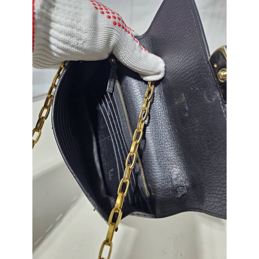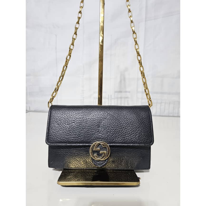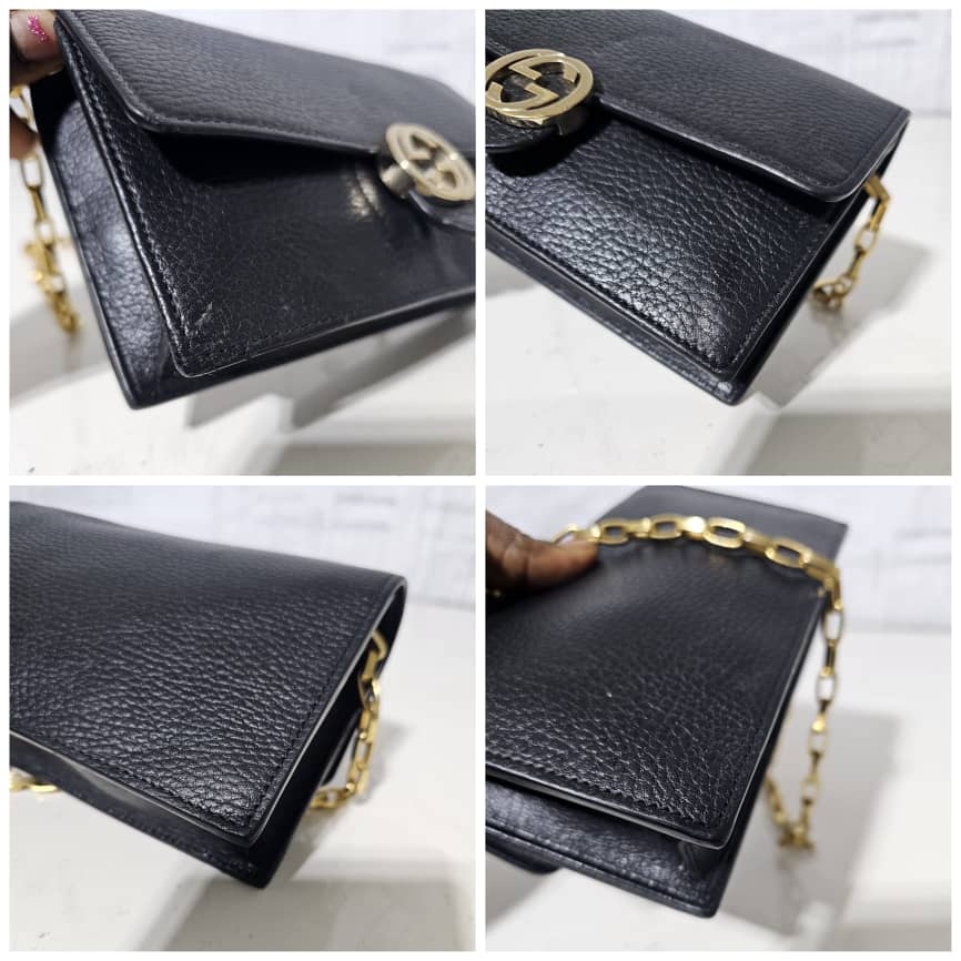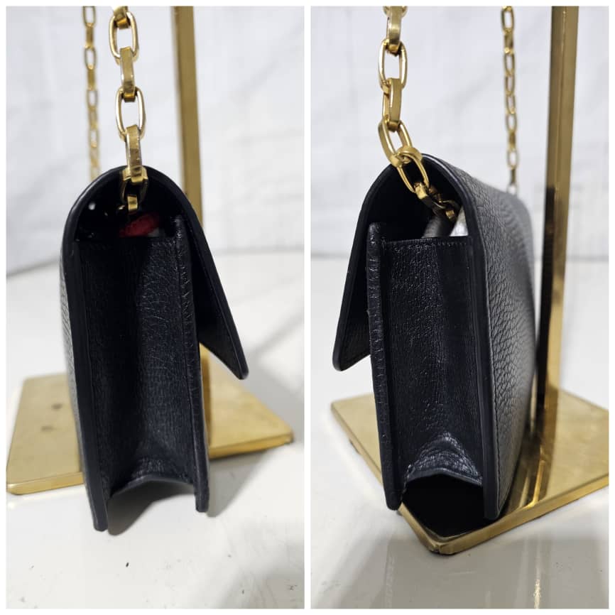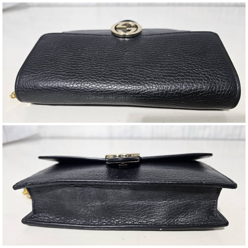 This authentic Gucci Black Interlocking G Clutch Wallet On Chain Crossbody Shoulder Bag is in the preowned condition. The exterior leather is clean and beautiful. The interior is clean. [ kindly note the chain has been changed. And one of the leather strap holder broke. Kindly review pictures to see how we fix it.]