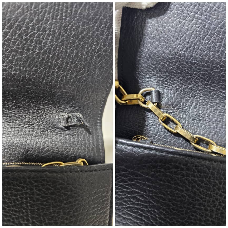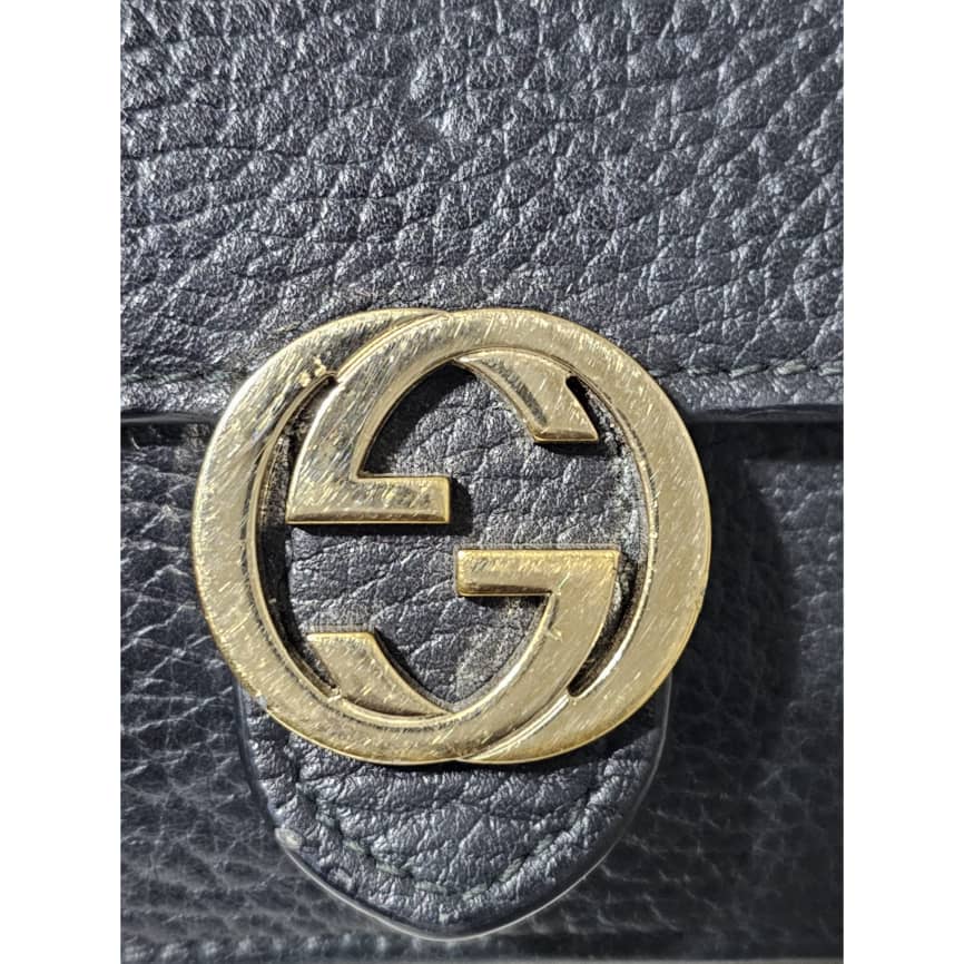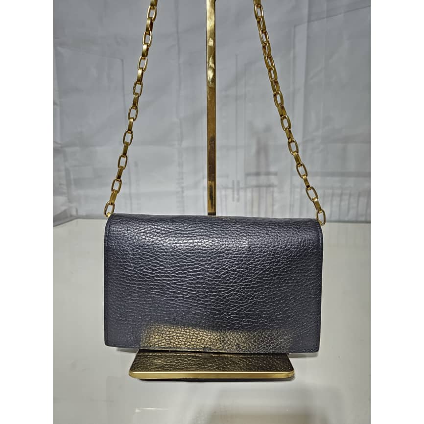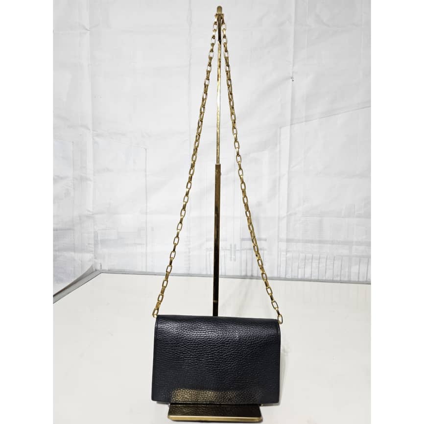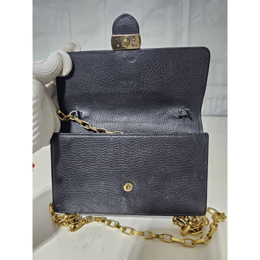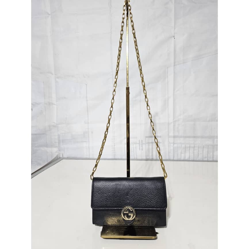This authentic Gucci Black Interlocking G Clutch Wallet On Chain Crossbody Shoulder Bag is in the preowned condition. The exterior leather is clean and beautiful. The interior is clean. [ kindly note the chain has been changed. And one of the leather strap holder broke. Kindly review pictures to see how we fix it.]