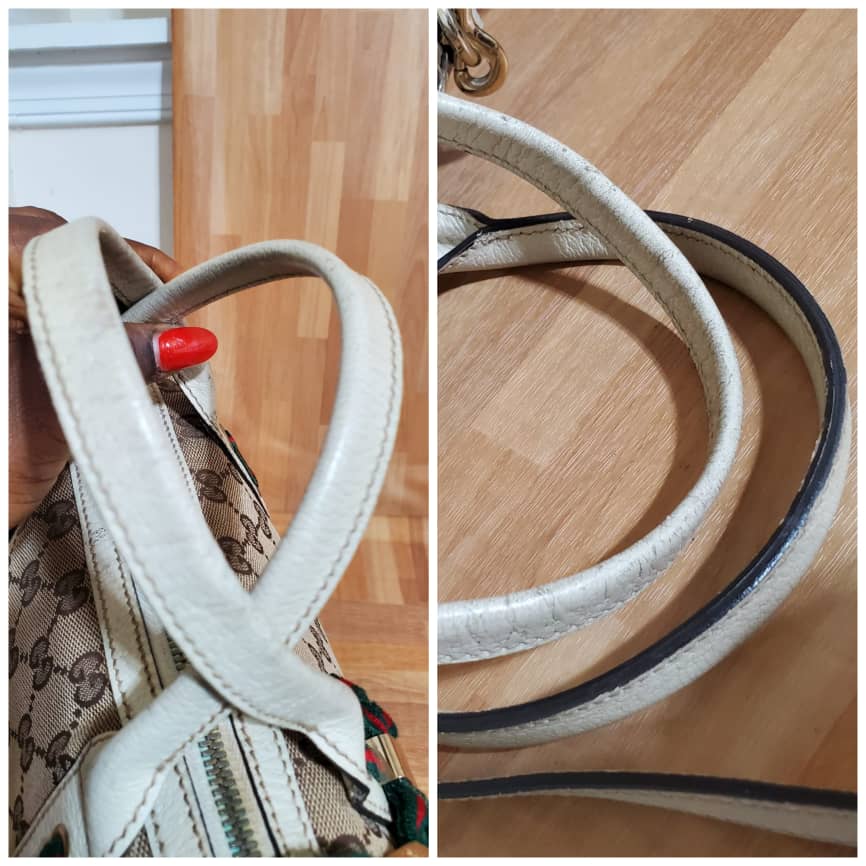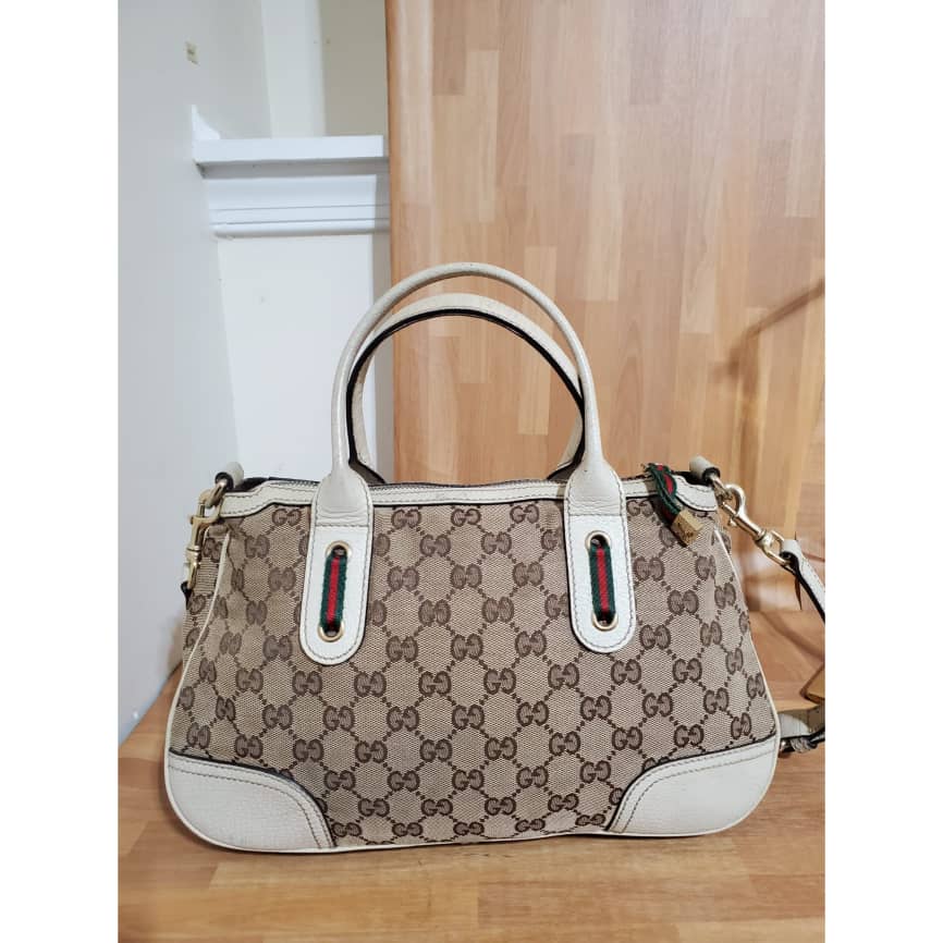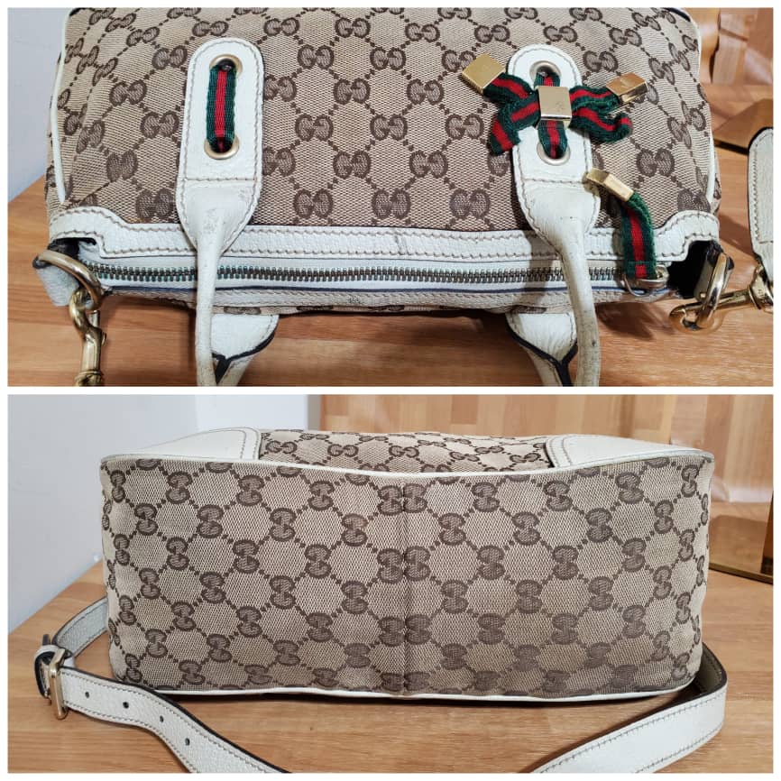 This authentic Gucci Brown GG Canvas Princy Satchel Bag is in it’s good pre-owned condition has sign of use. The exterior canvas is clean and beautiful. Interior is clean. The base edges shows little scratches. The handles shows some scratches.