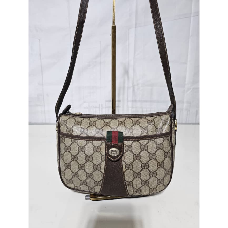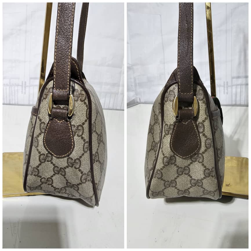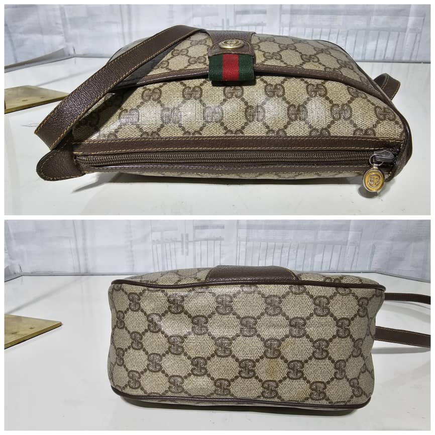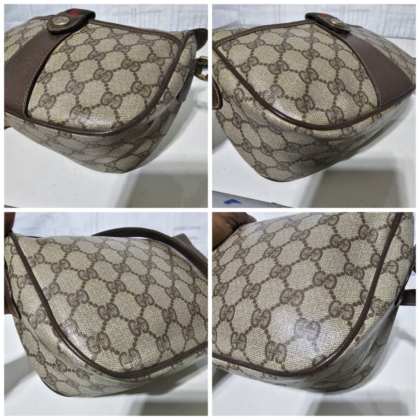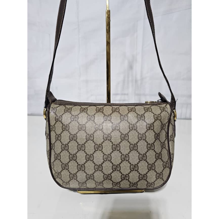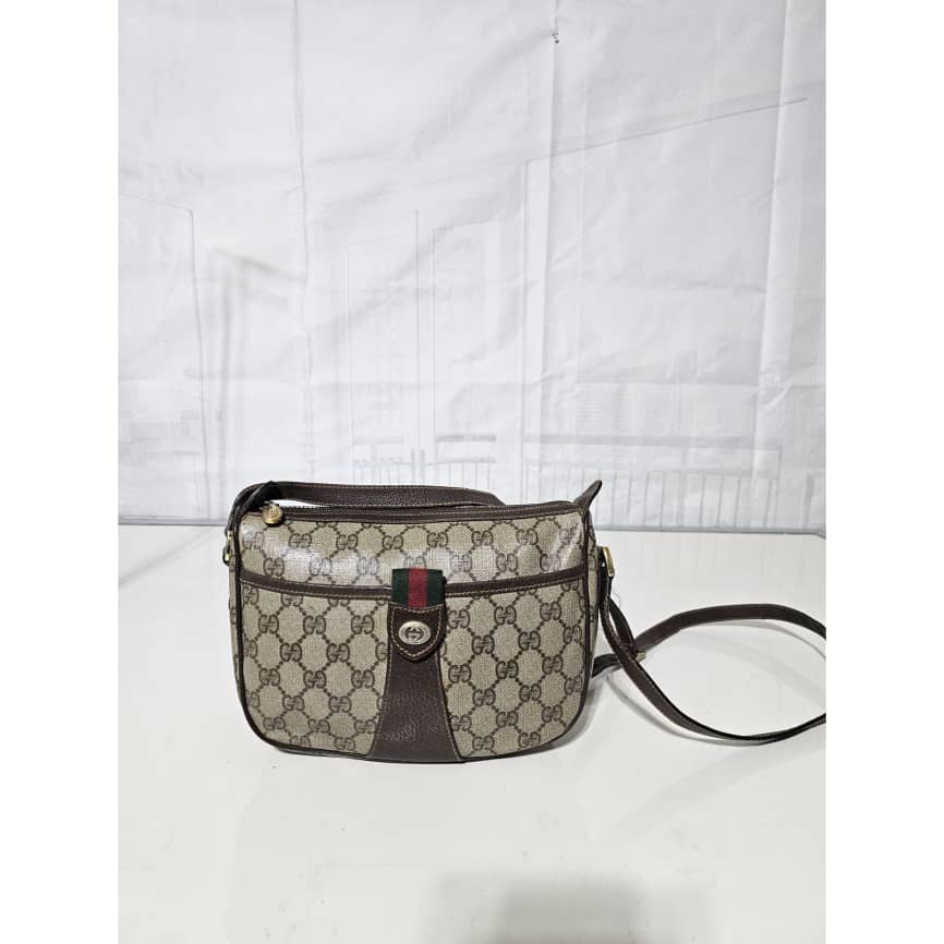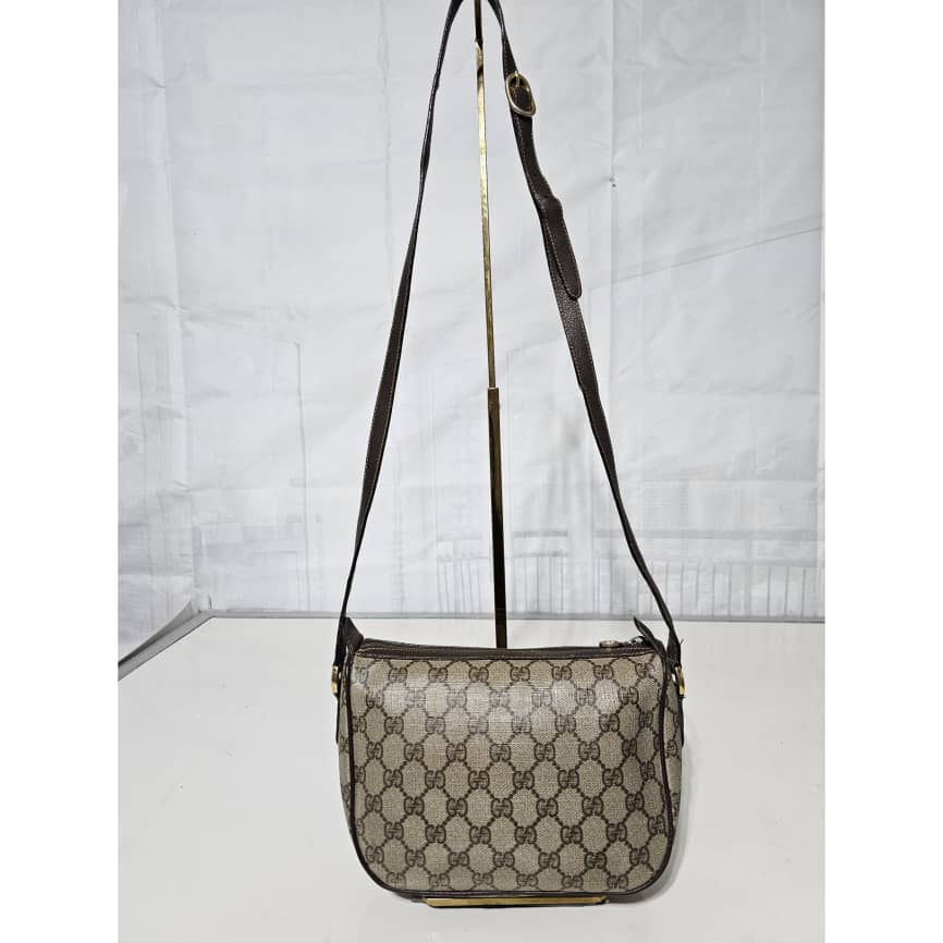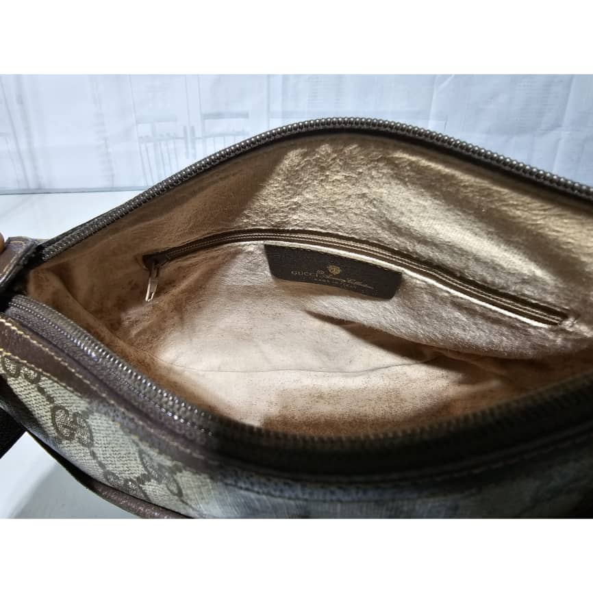 This authentic Gucci Brown GG Supreme Web Crossbody Bag Beige Dark brown is in it’s good pre-owned condition. The exterior canvas is clean and beautiful. The interior is clean. It is in it’s vintage condition.