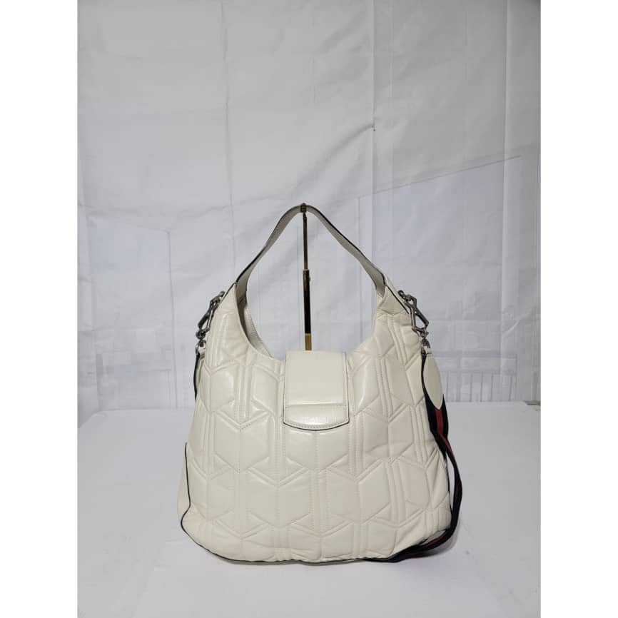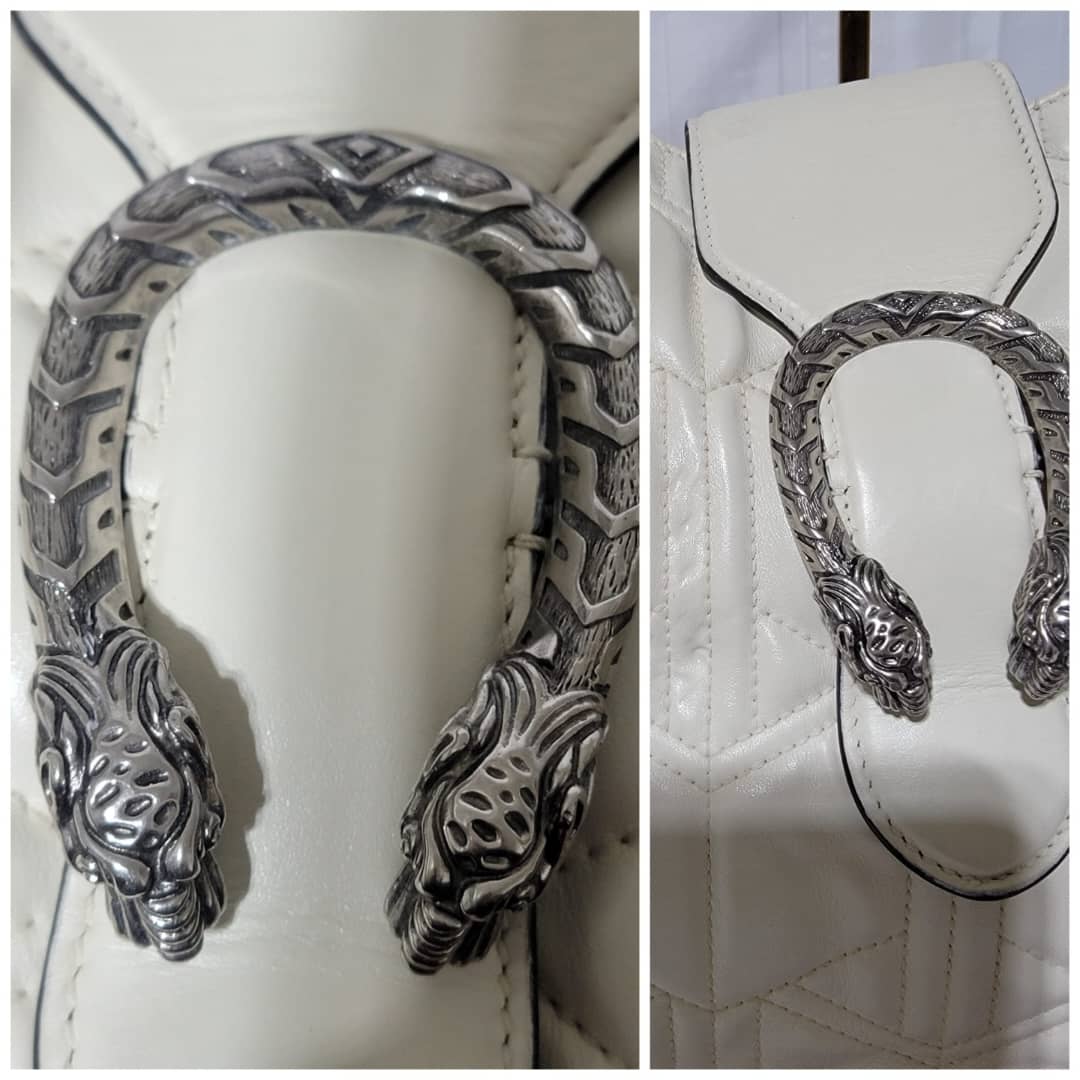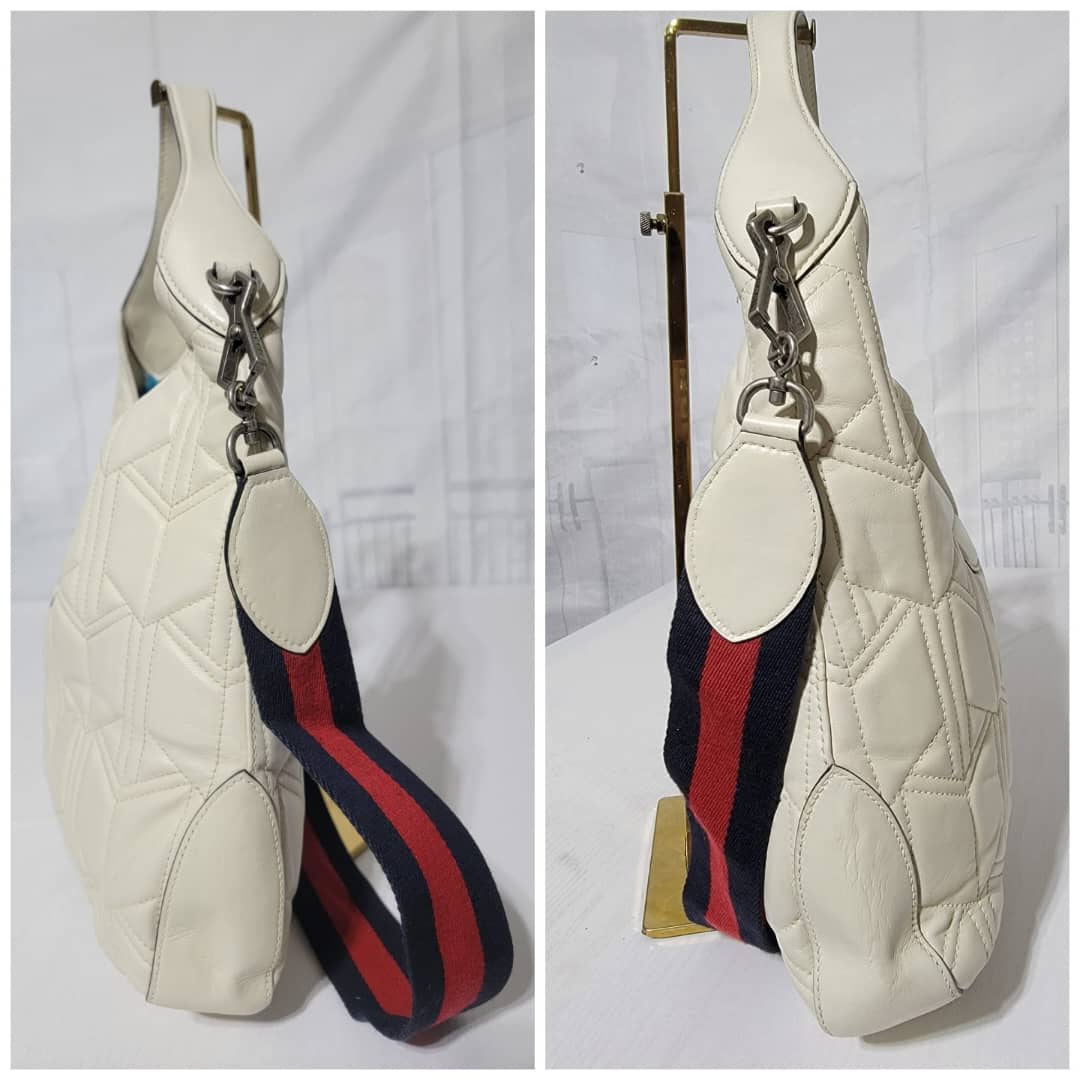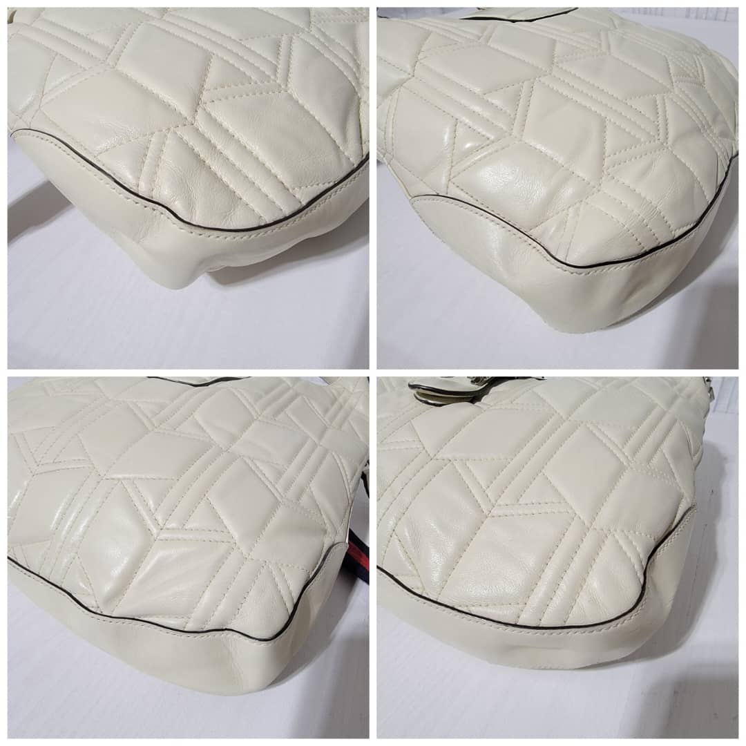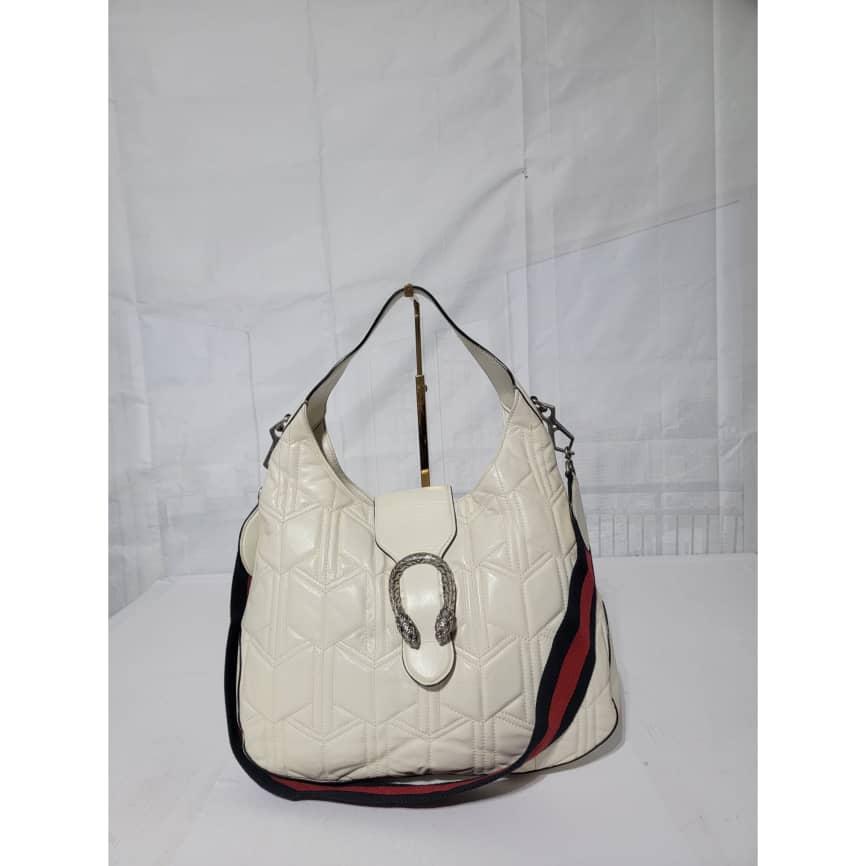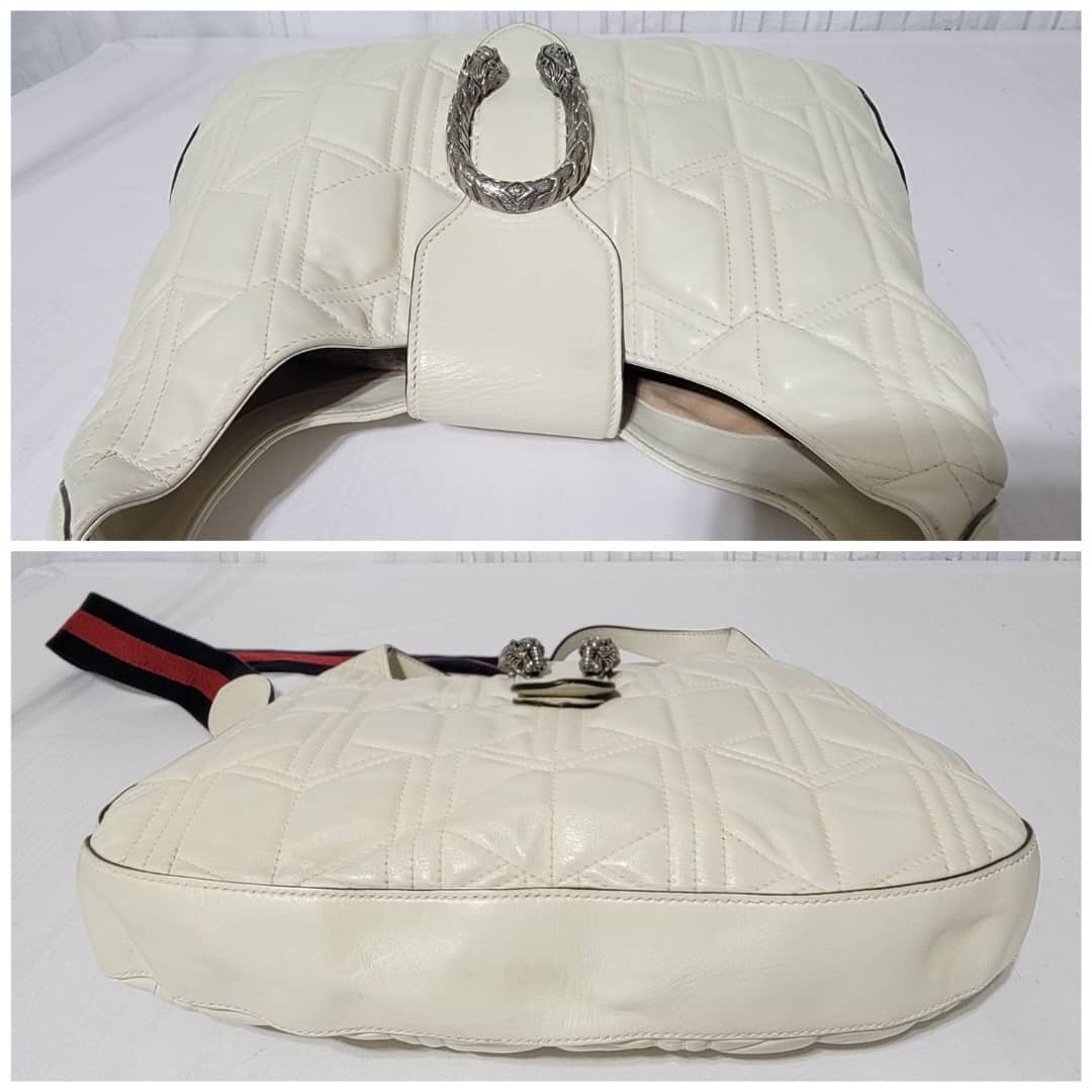 This authentic GUCCI Calfskin Web Quilted Medium Dionysus Hobo Bag White is in it’s good pre-owned condition. The exterior is clean and beautiful. Interior is clean, it has little bit of dotted stains (Kindly look at pictures above). It comes with a detachable shoulder strap. Silver hardware.