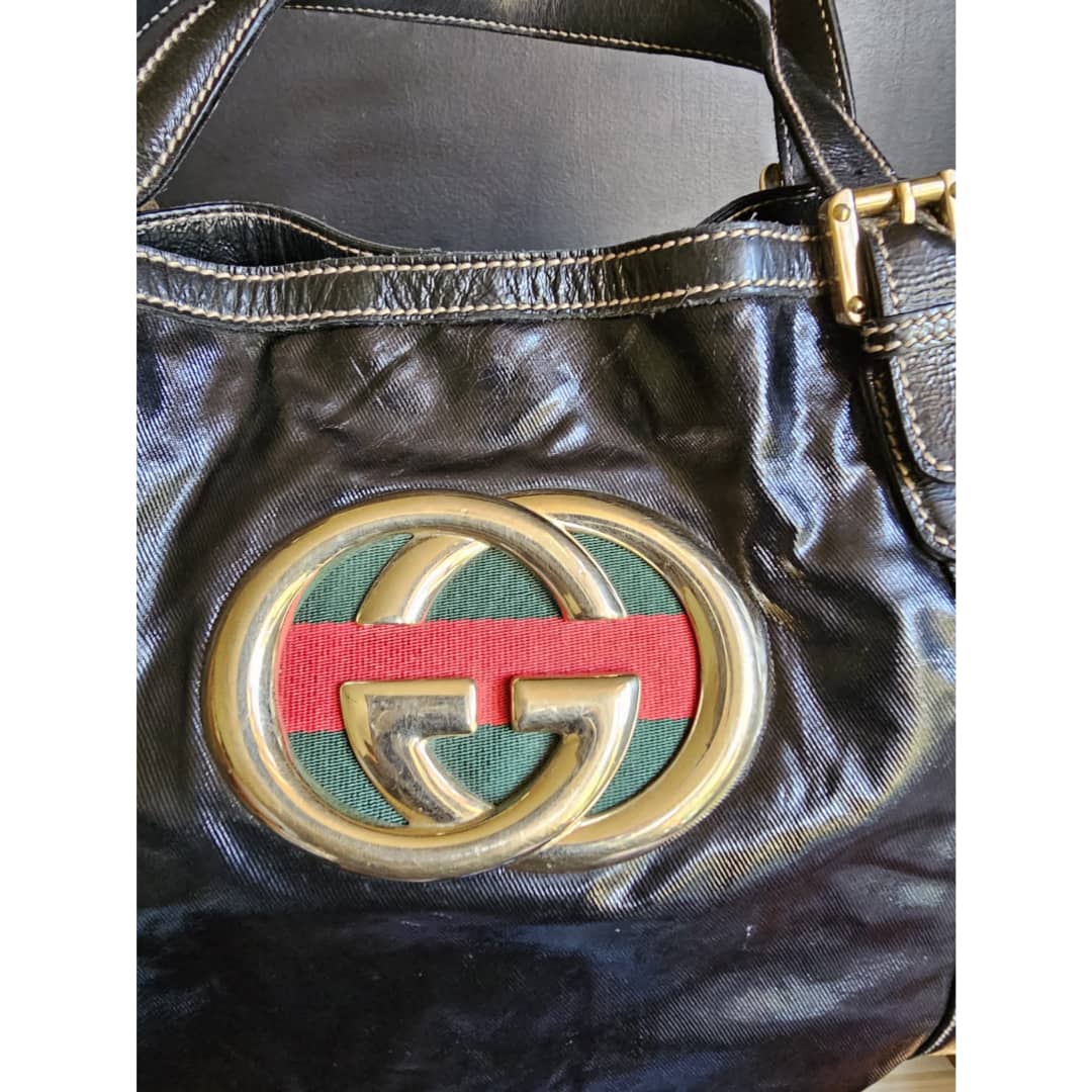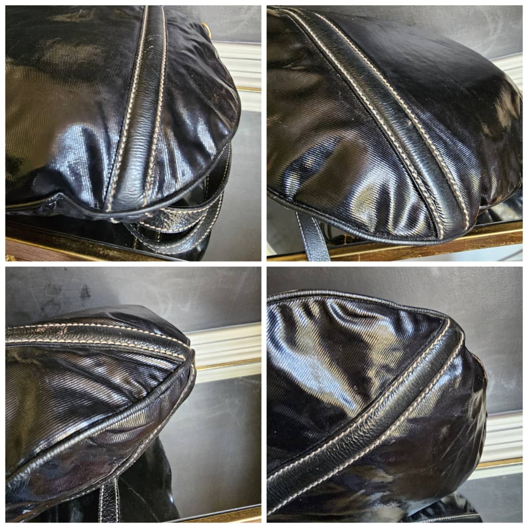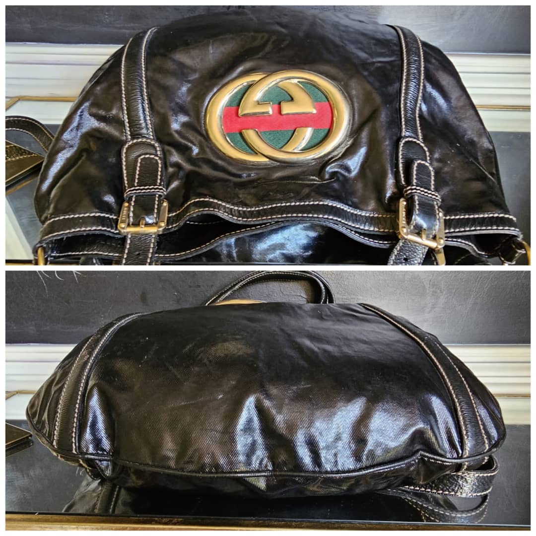 This authentic Gucci Coated Canvas and Patent Leather Dialux Britt Hobo Bag Black is in it’s good pre-owned condition. The exterior patent leather is clean and beautiful. Interior is clean. Gold hardware. Comes with a strap.