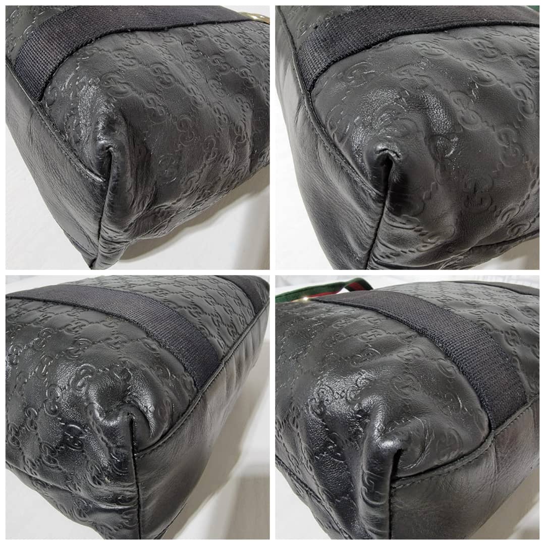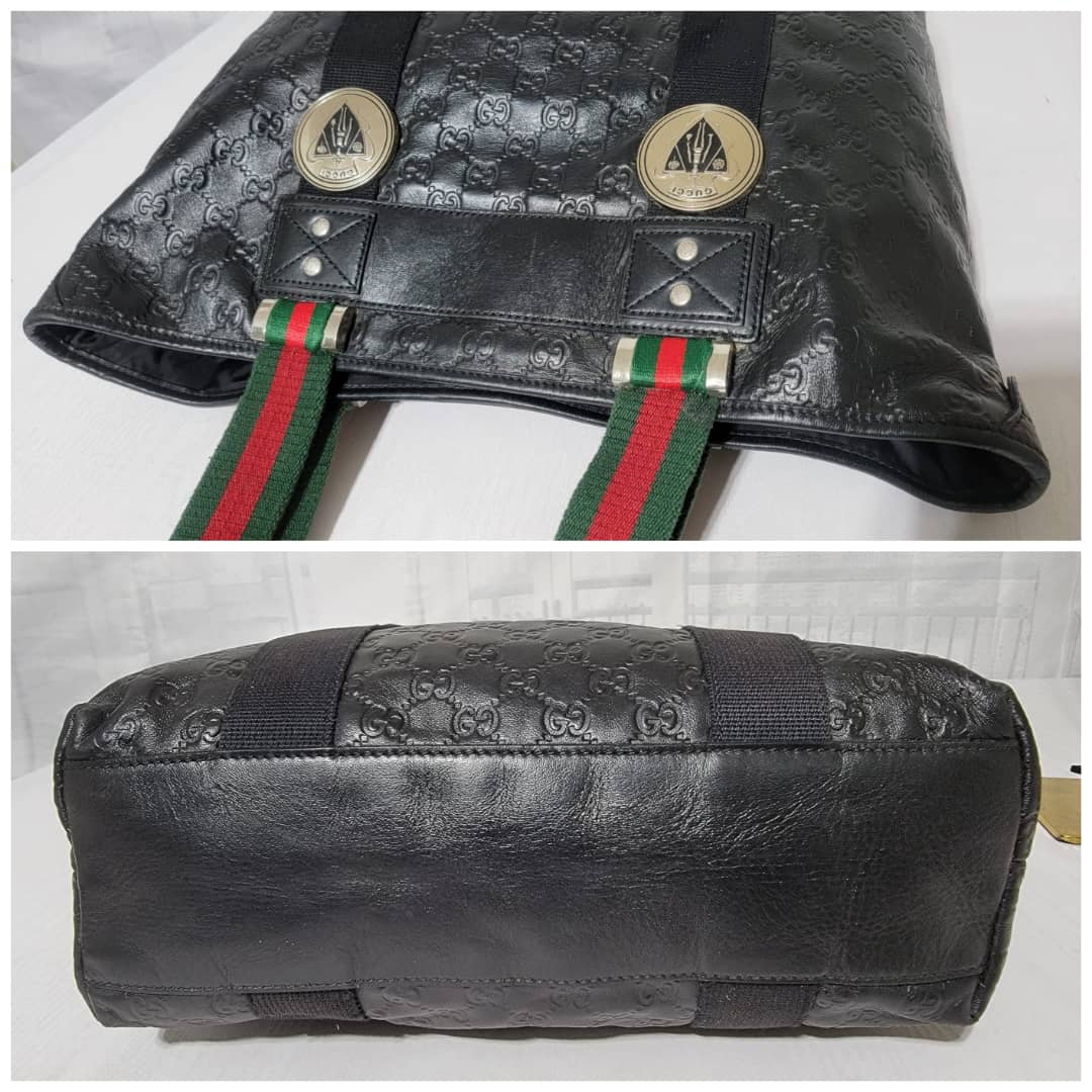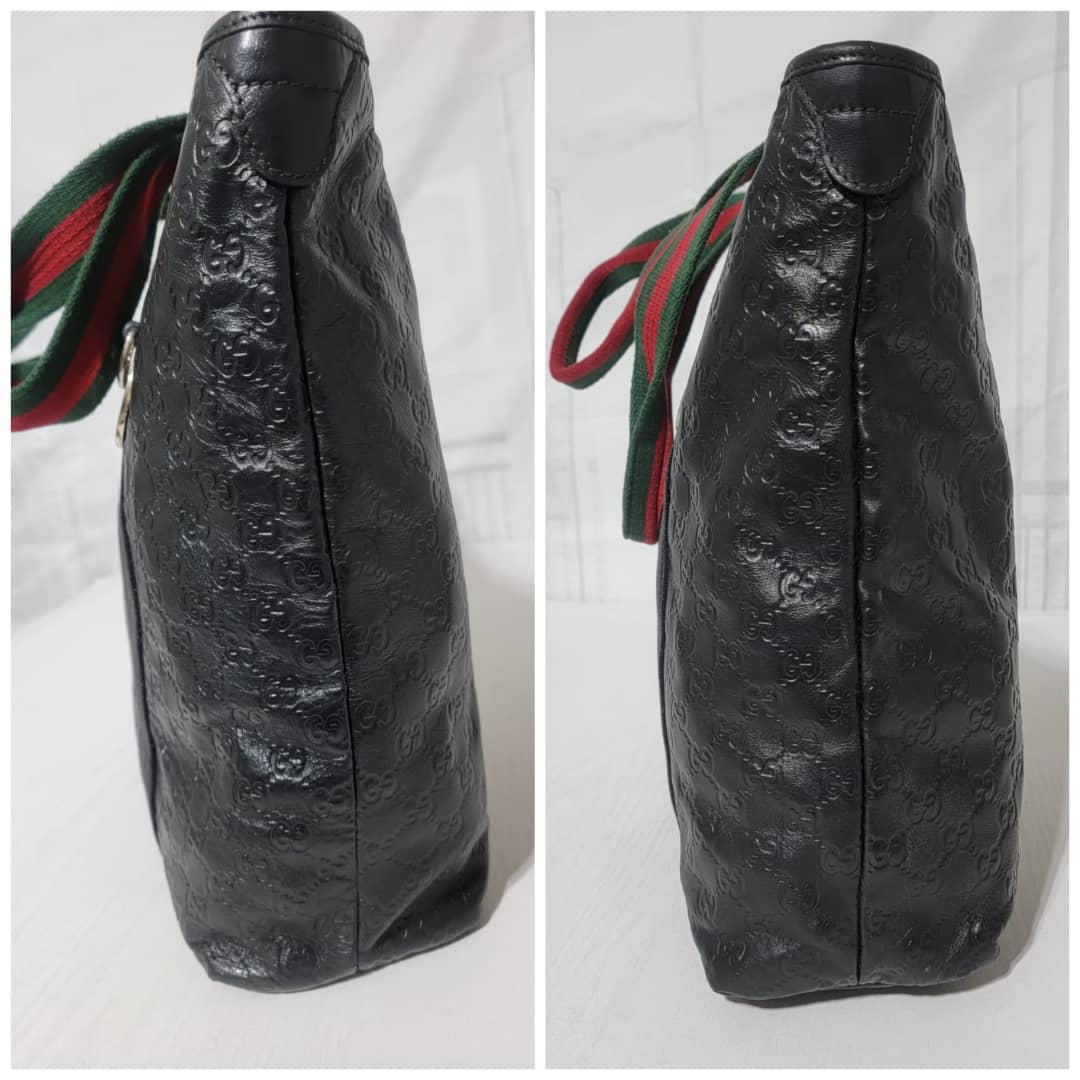 This authentic Gucci crystal Guccissima gg Web medium Tote Bag Black is in it’s good pre-owned condition. The exterior leather is clean and beautiful. Interior is clean. It comes with a web handle design. Silver hardware. It is a beautiful GG print tote. Kindly look at the little wear on the web design on the shoulder handles