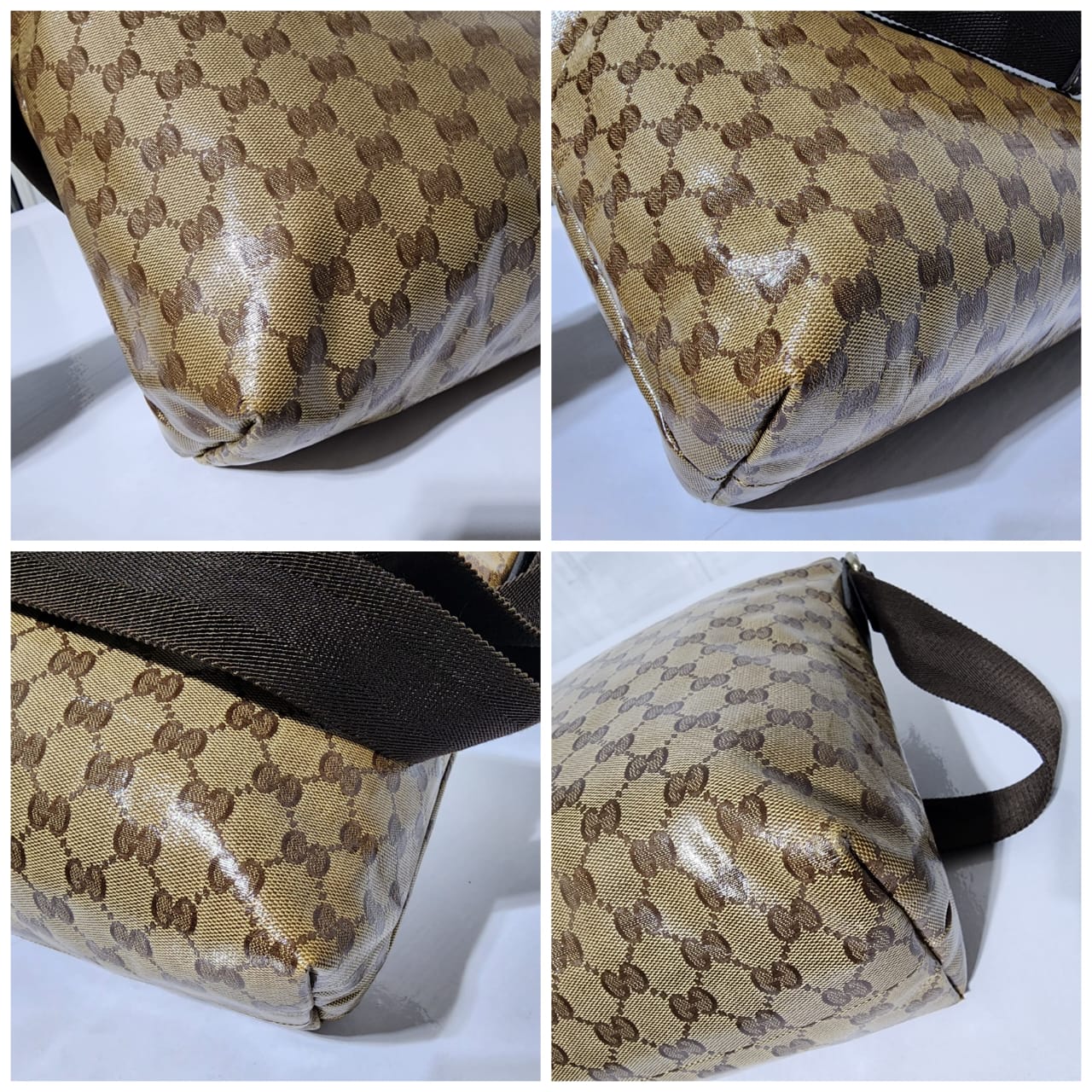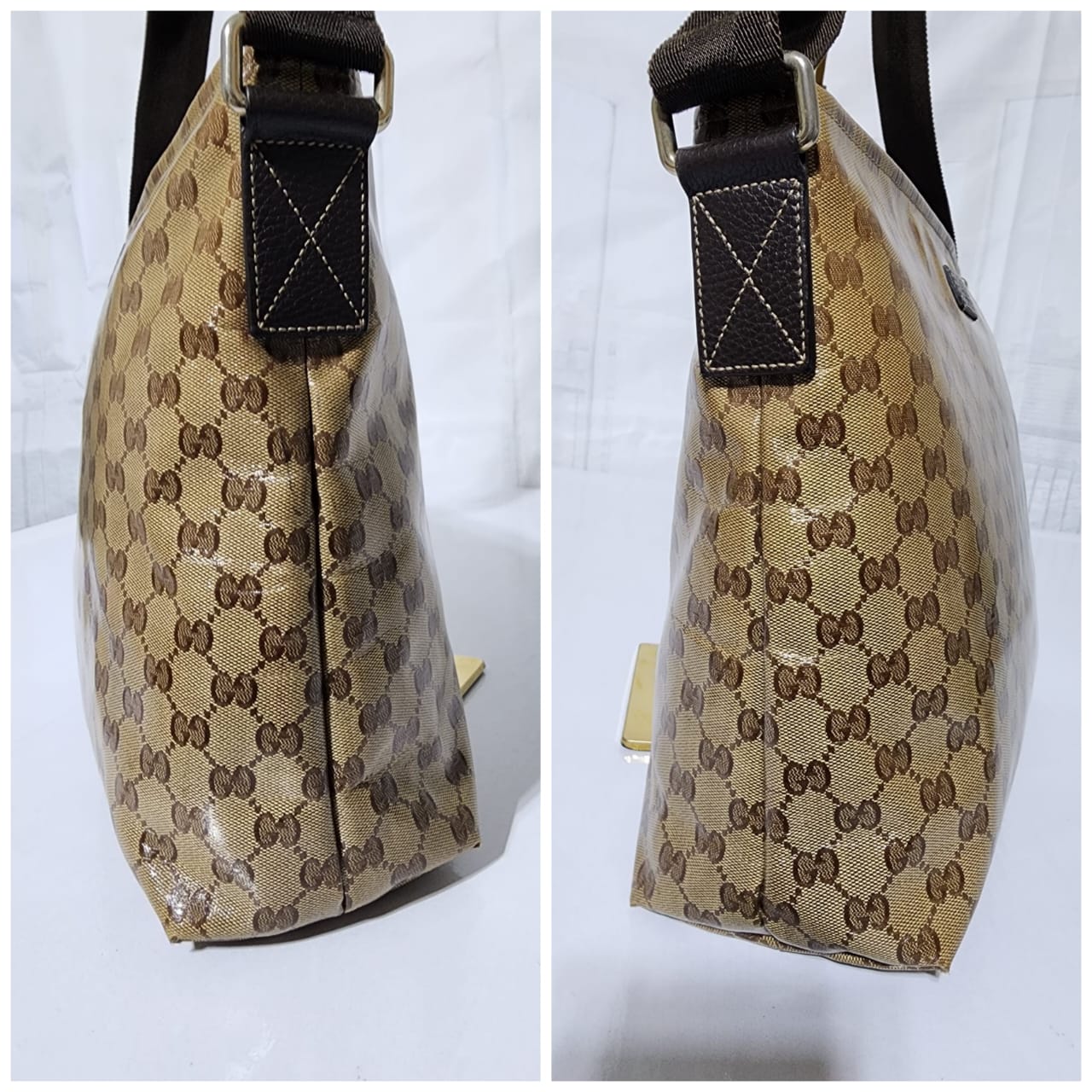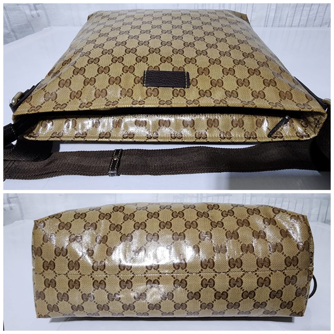 This authentic GUCCI Crystal Monogram Flat Messenger Bag Dark Brown is in itβs good pre-owned condition. The exterior patent leather is clean and beautiful. It is a beautiful patent bag. Interior is clean. The strap is adjustable, it can be worn as a shoulder/crossbody bag.