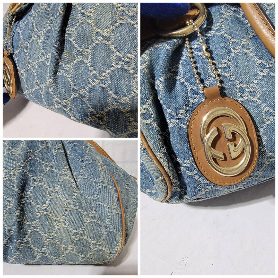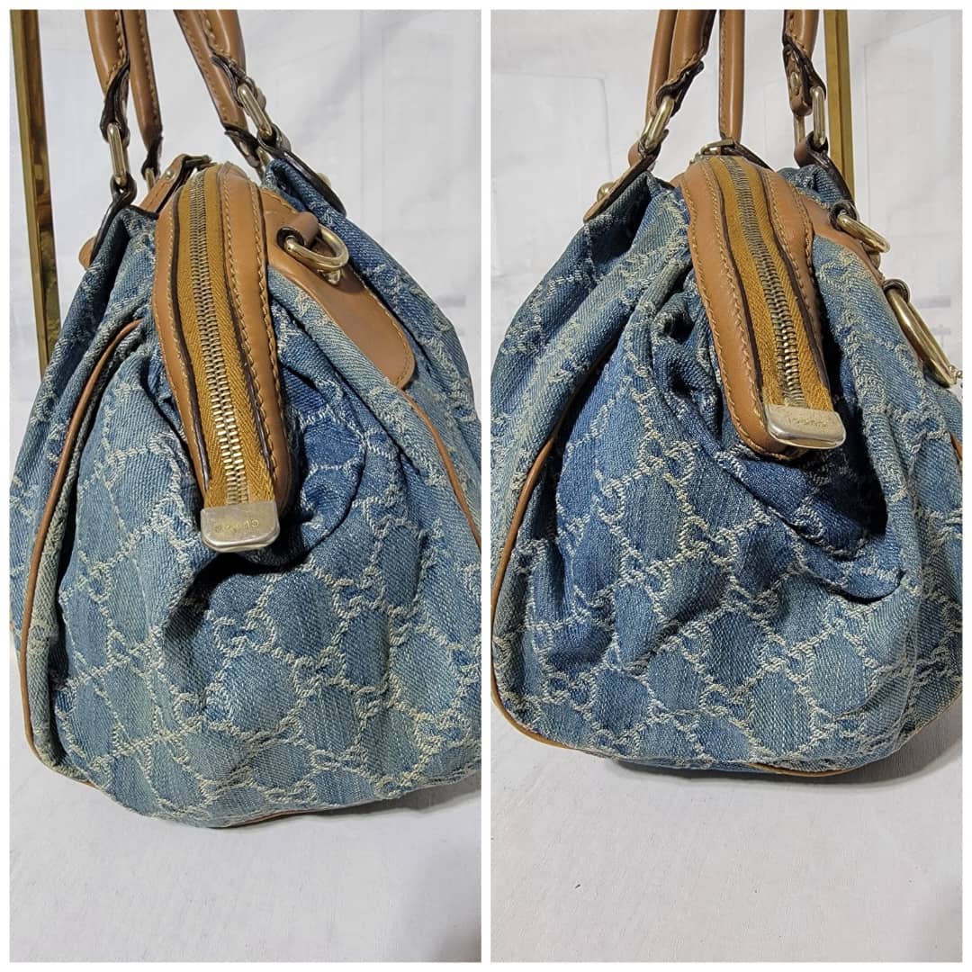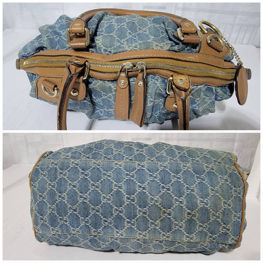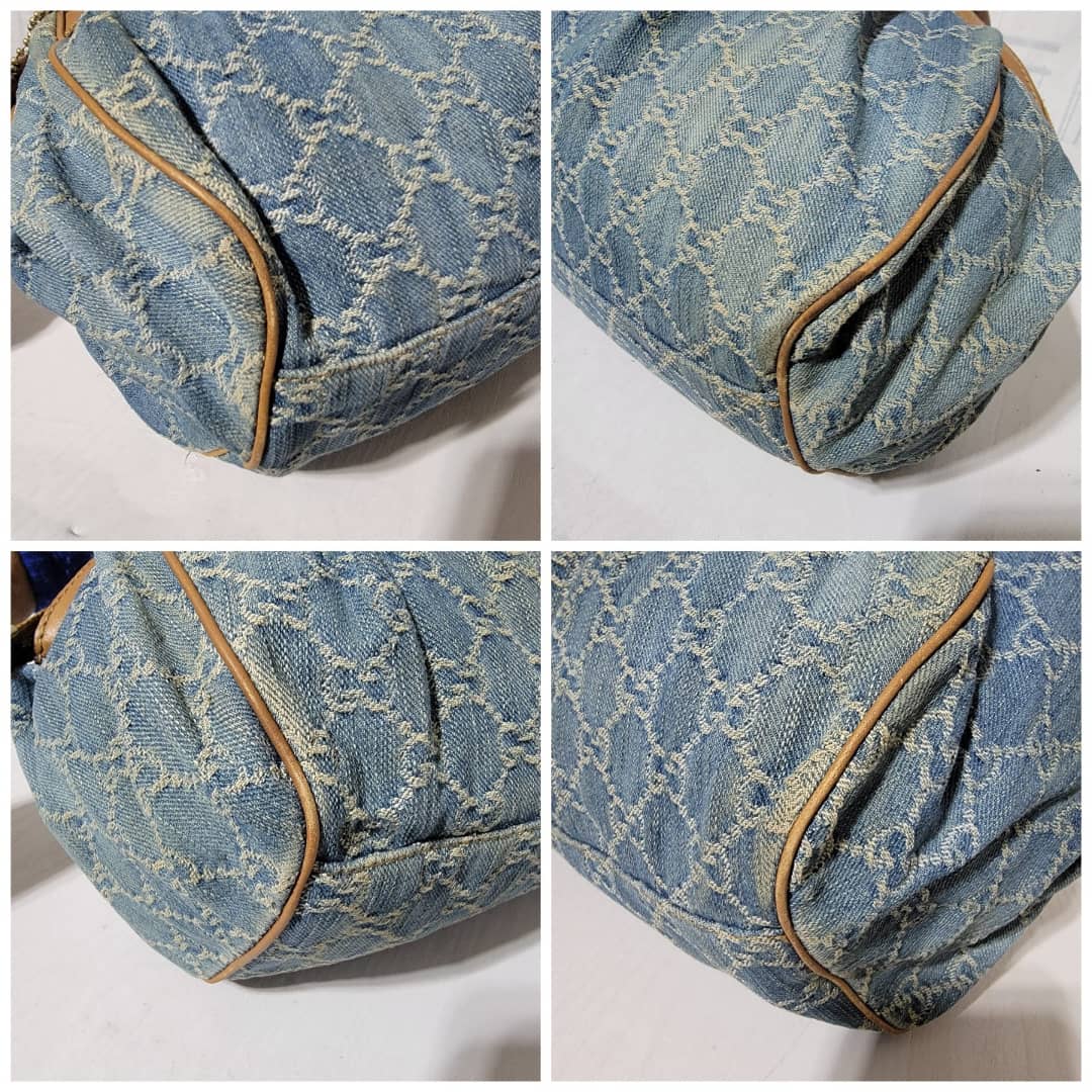This authentic Gucci Denim GG Canvas Sukey Tote Shoulder Bag is in it’s pre-owned condition the exterior is clean but shows the denim is slightly faded. The base edges shows scratches . Interior is clean. No long strap. I will include an unbranded matching strap.