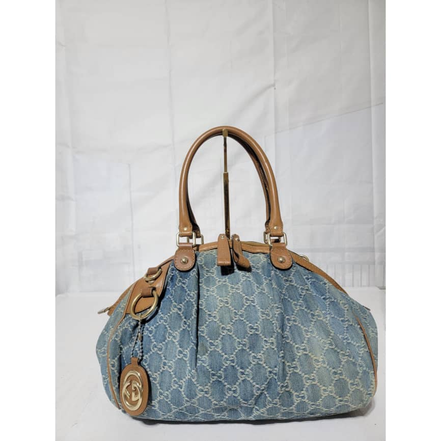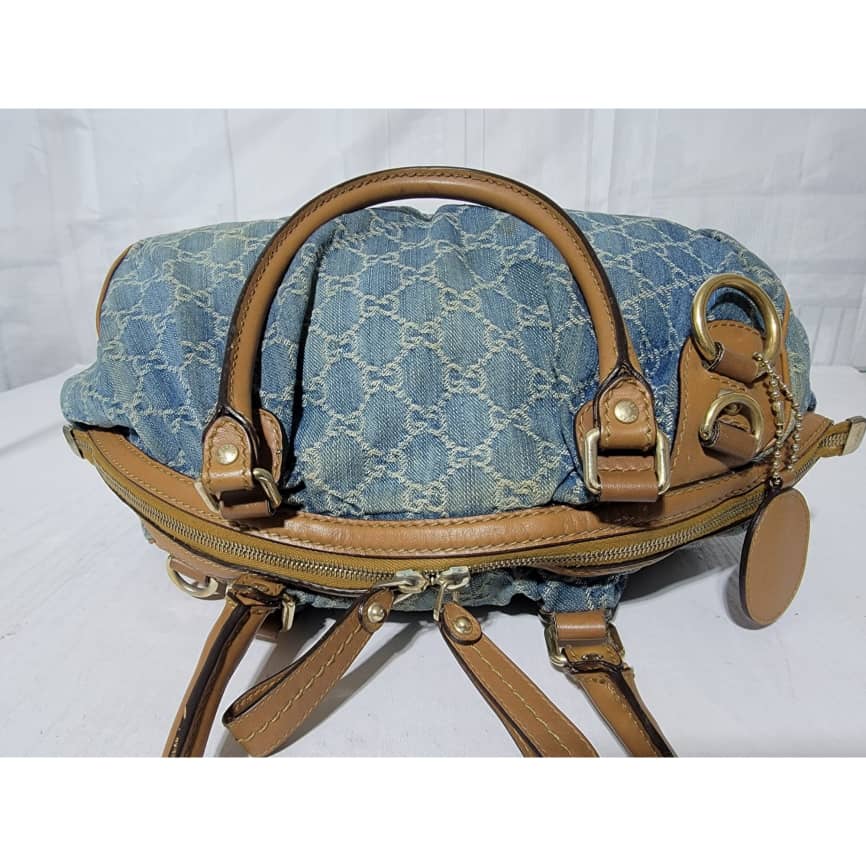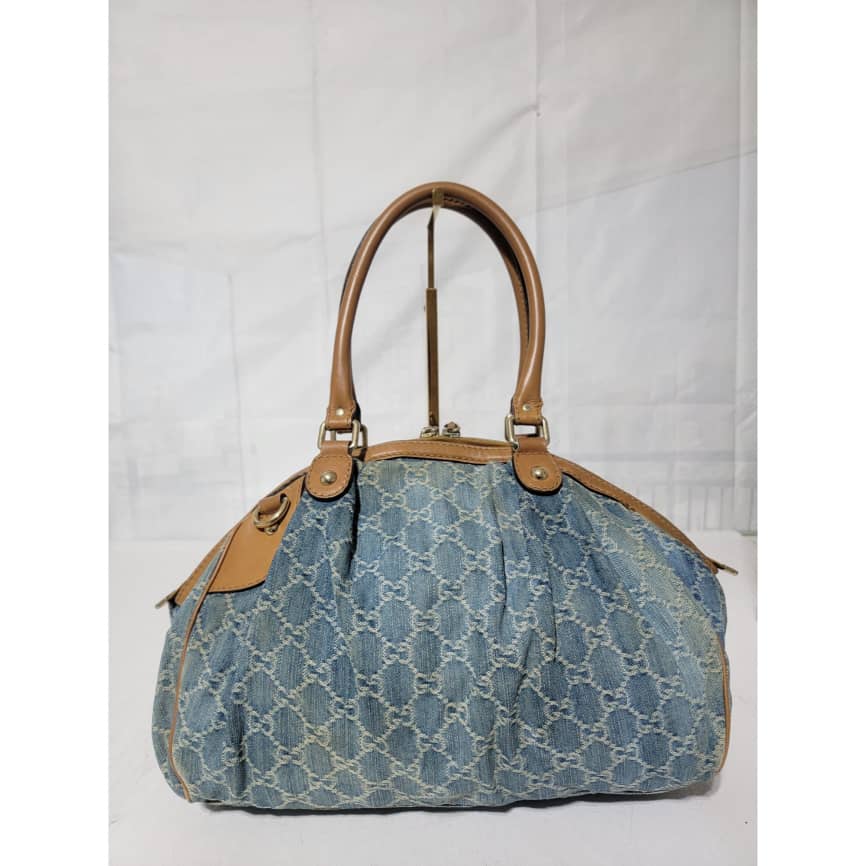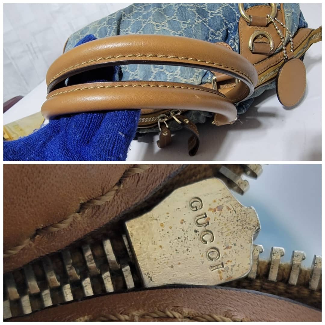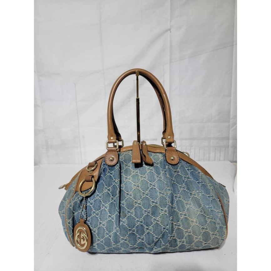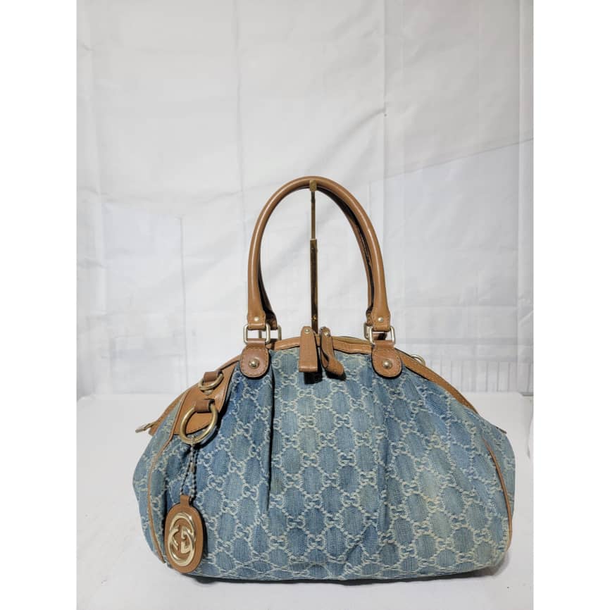 This authentic Gucci Denim GG Canvas Sukey Tote Shoulder Bag is in it’s pre-owned condition the exterior is clean but shows the denim is slightly faded. The base edges shows scratches . Interior is clean. No long strap. I will include an unbranded matching strap.