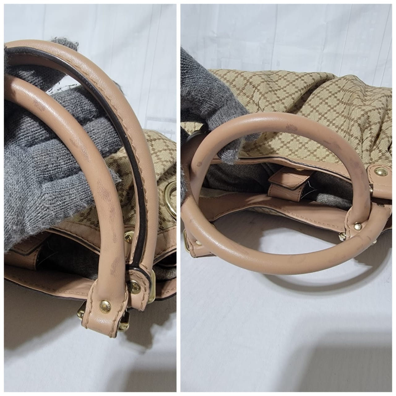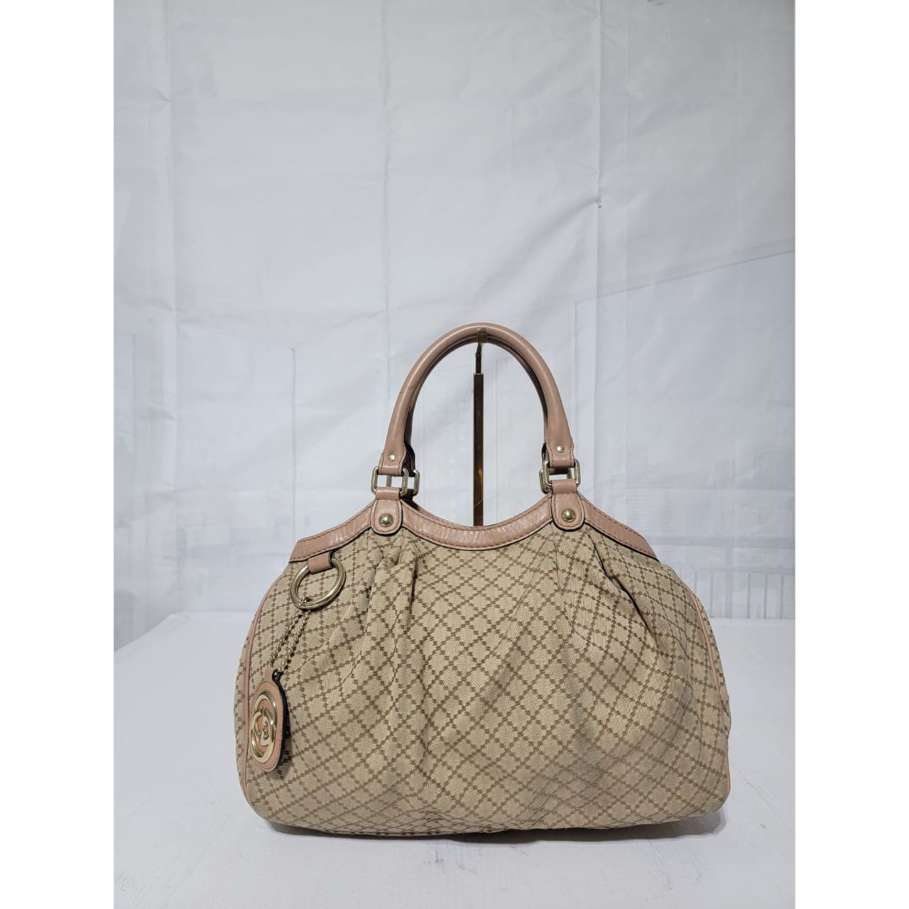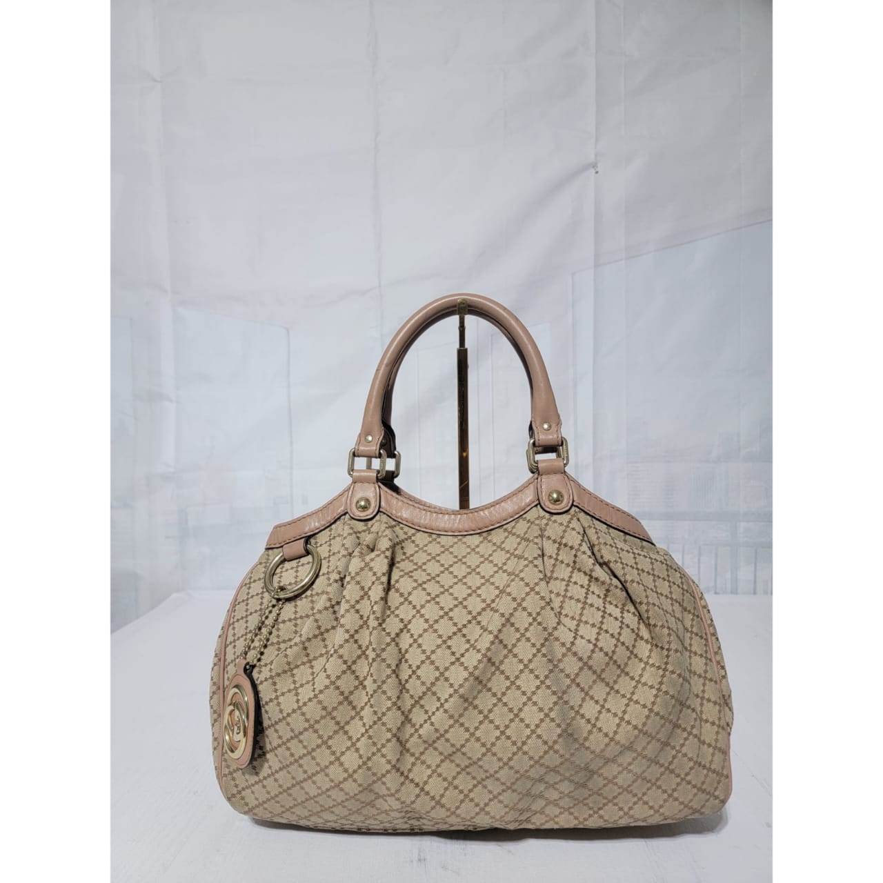 This authentic GUCCI Diamante Medium Sukey Tote Bag Beige/Nude is in it’s good pre-owned condition. The exterior is clean and beautiful. Interior is clean. The handle shows some rubbing to it (Kindly look at pictures above). It comes with a Gucci GG charm.