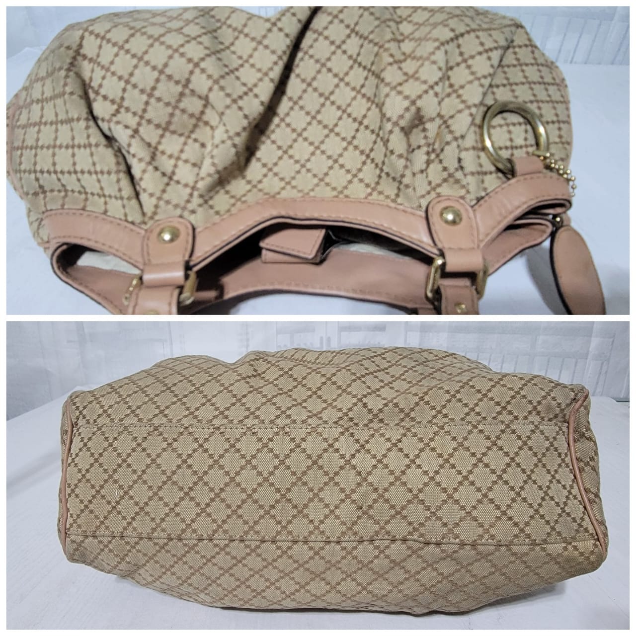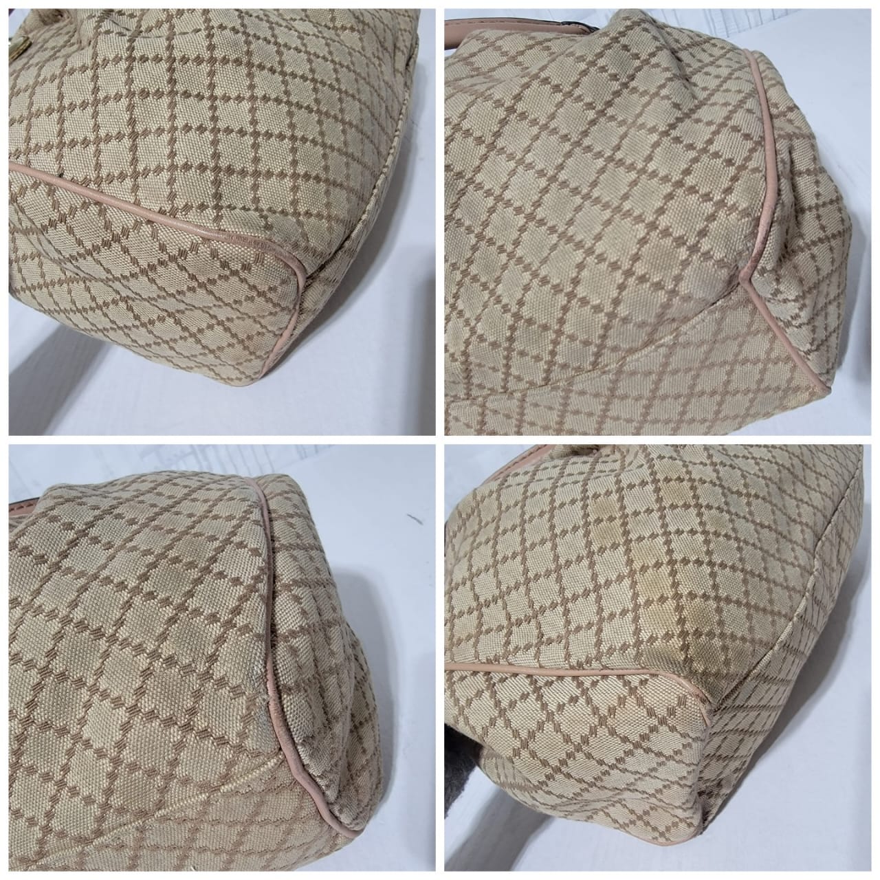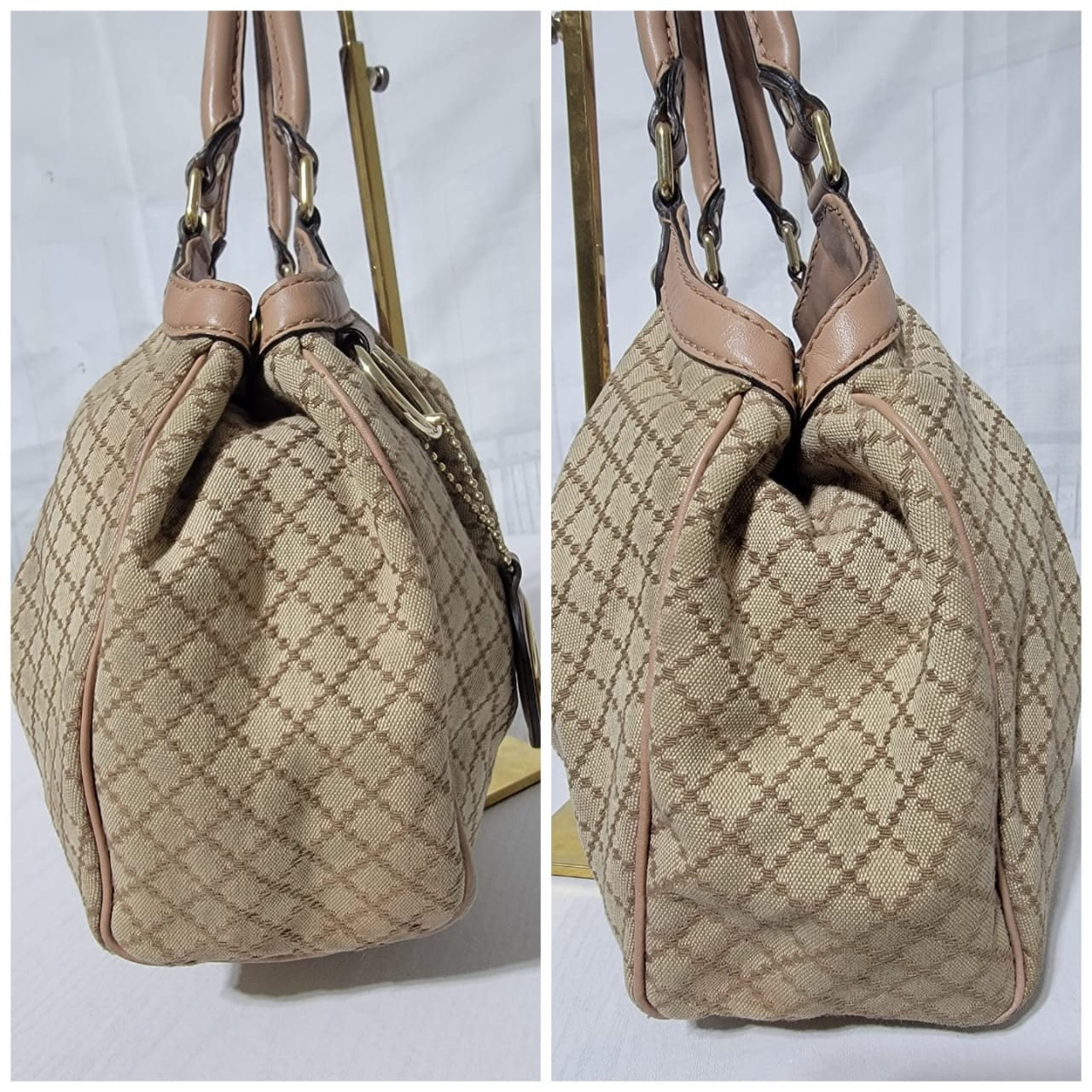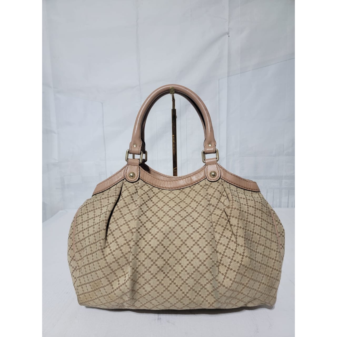 This authentic GUCCI Diamante Medium Sukey Tote Bag Beige/Nude is in it’s good pre-owned condition. The exterior is clean and beautiful. Interior is clean. The handle shows some rubbing to it (Kindly look at pictures above). It comes with a Gucci GG charm.