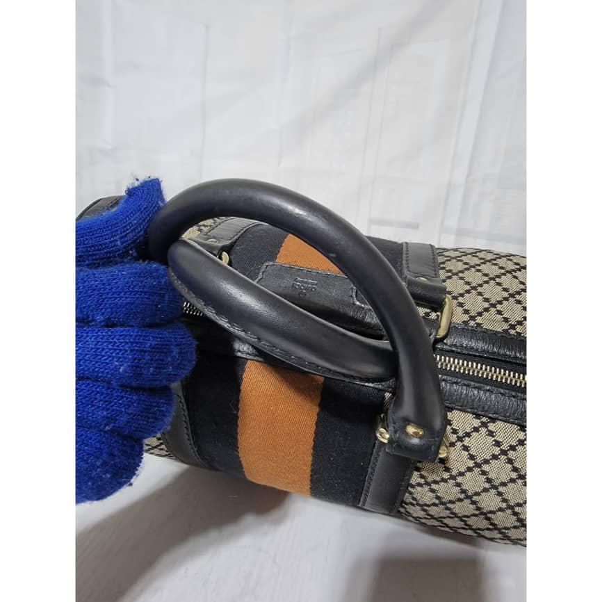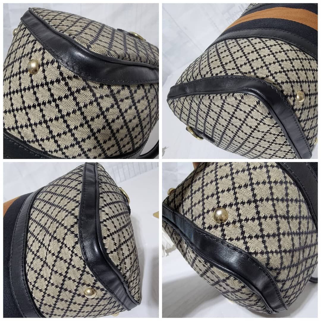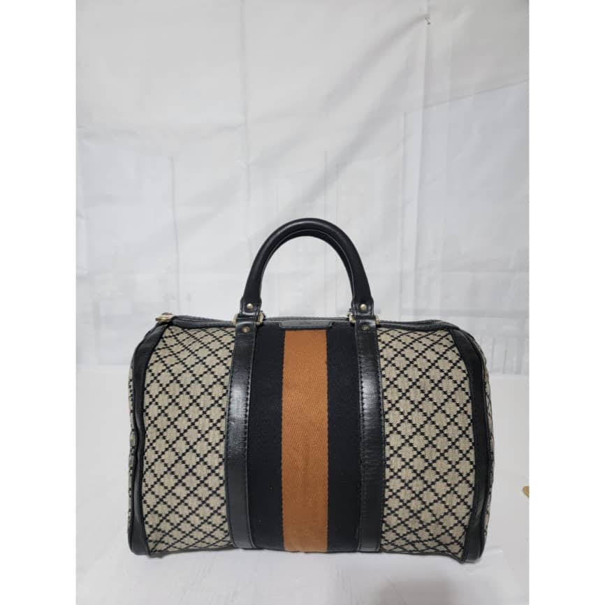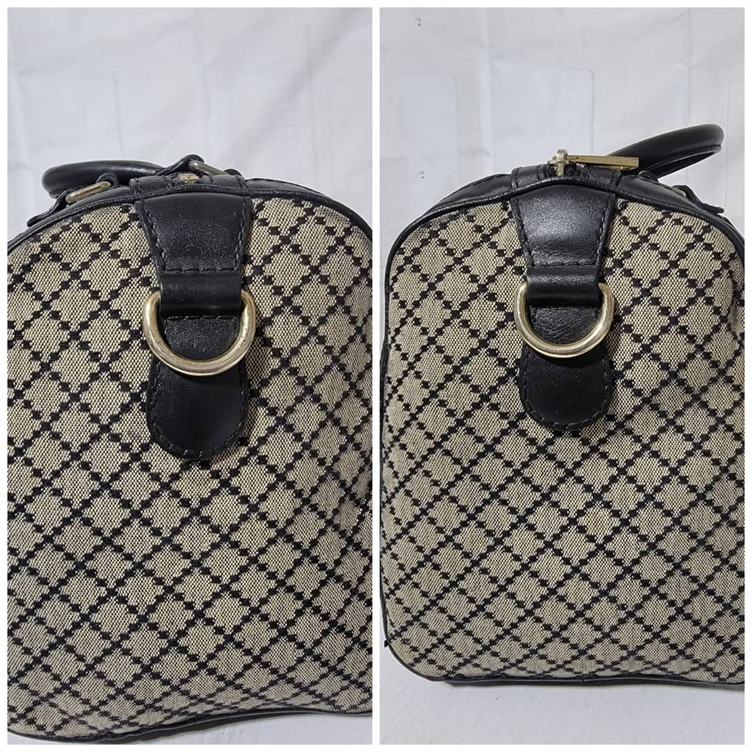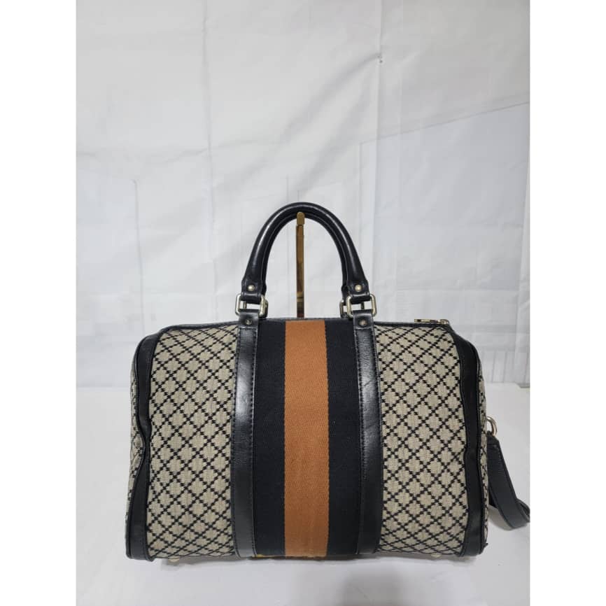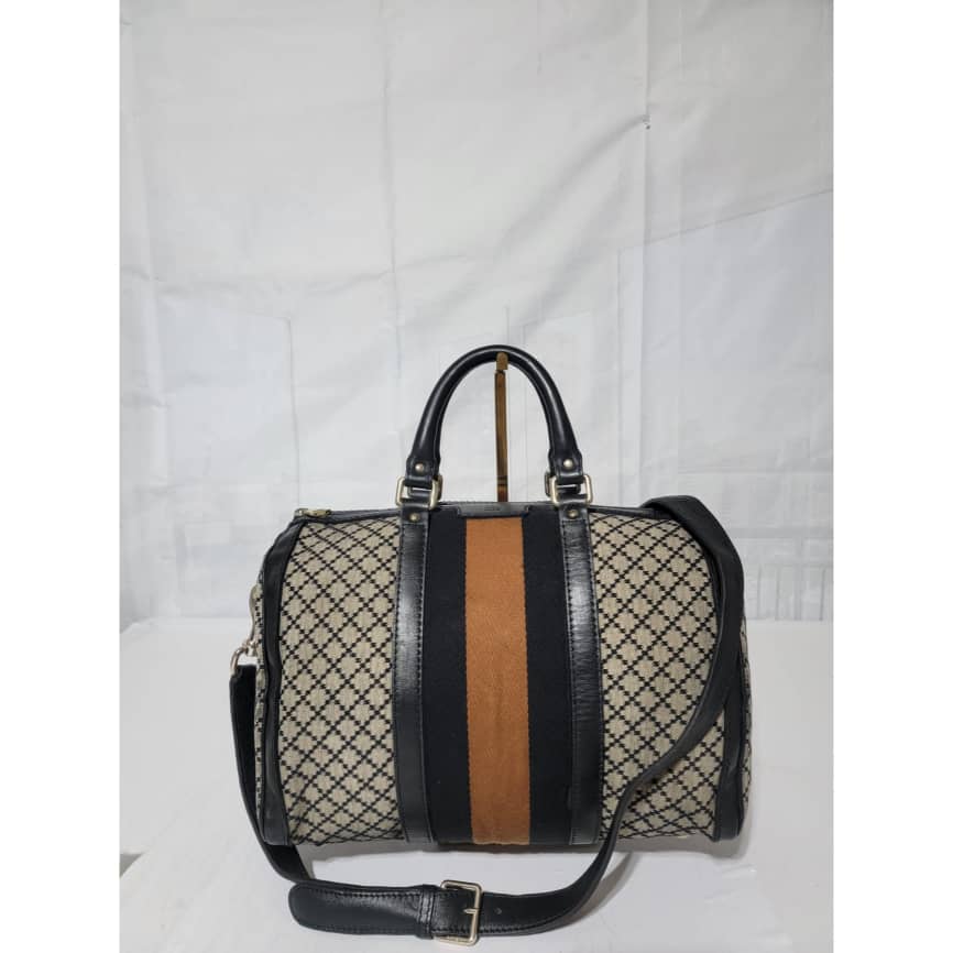 This authentic Gucci Diamante Medium Web Boston Bag is in it’s good pre-owned condition the exterior is clean and beautiful. The Interior is clean however shows sign of wear ( make up powder) I will include a bag organizer insert to cover it up. The long black strap is unbranded. Kindly look at pictures above