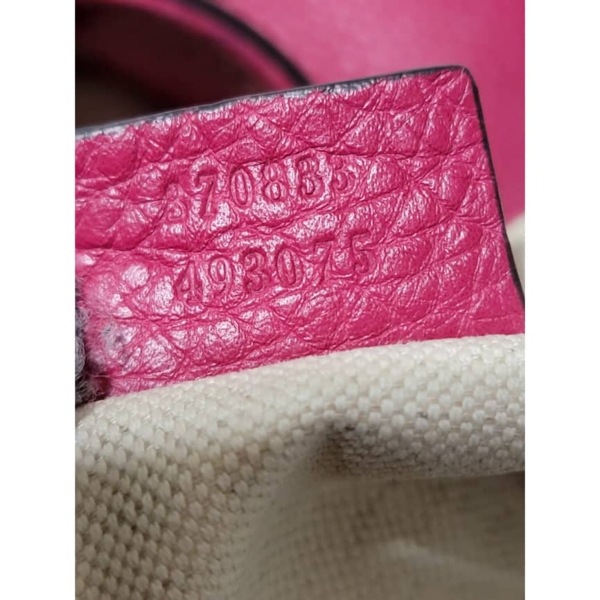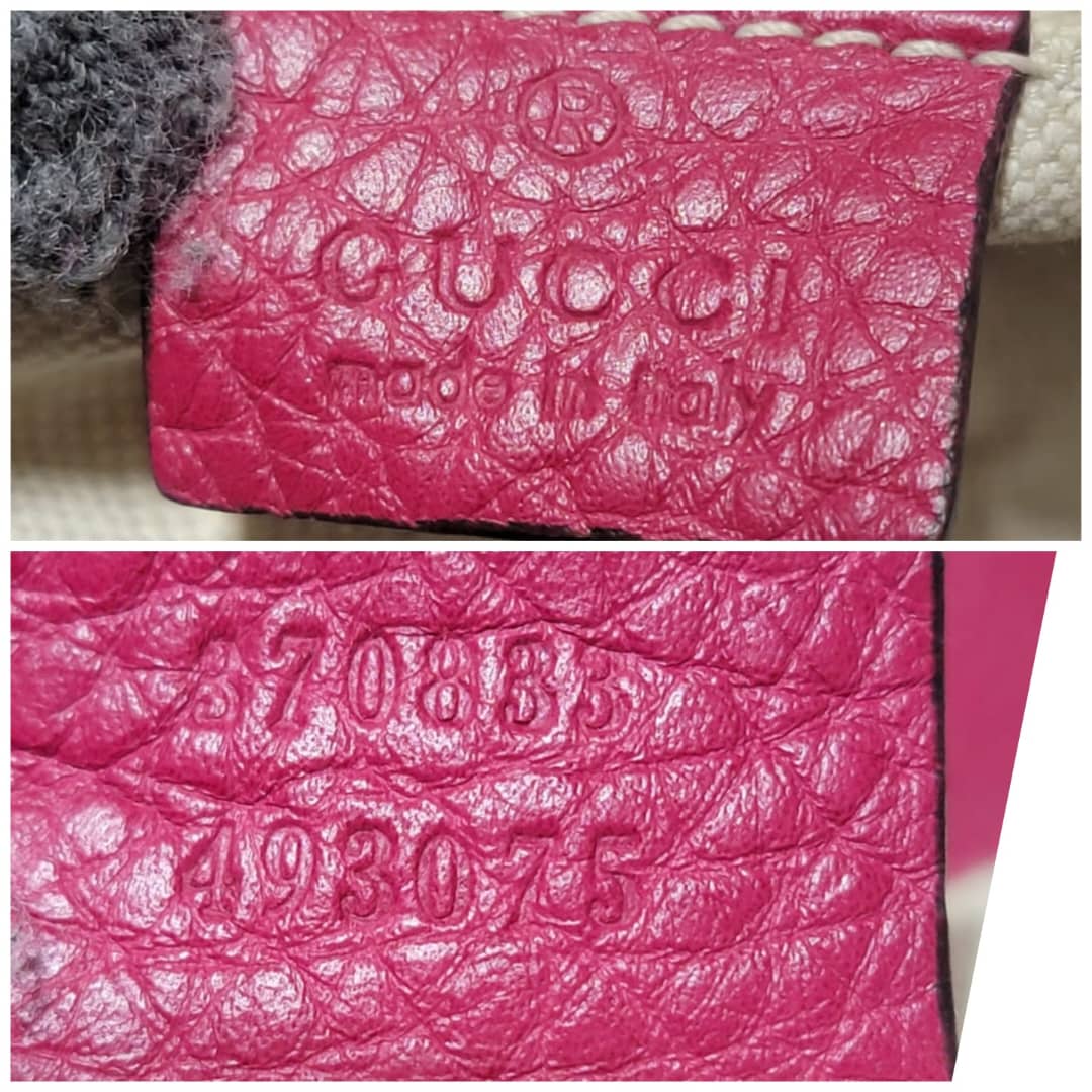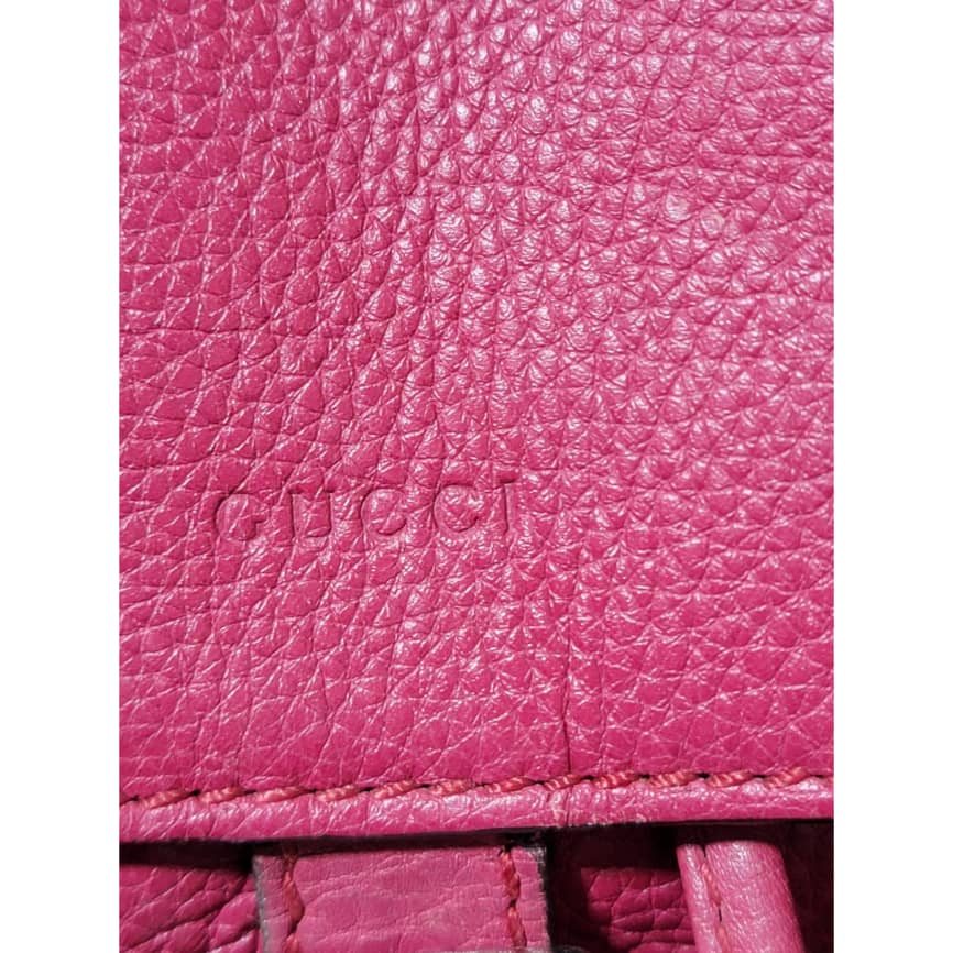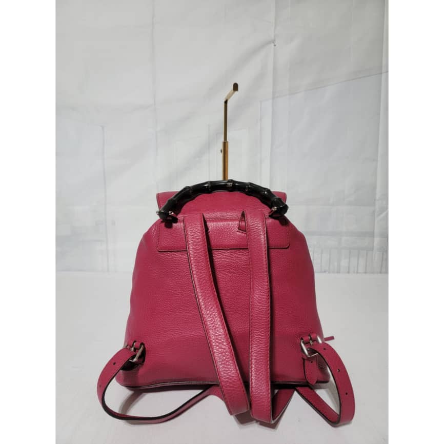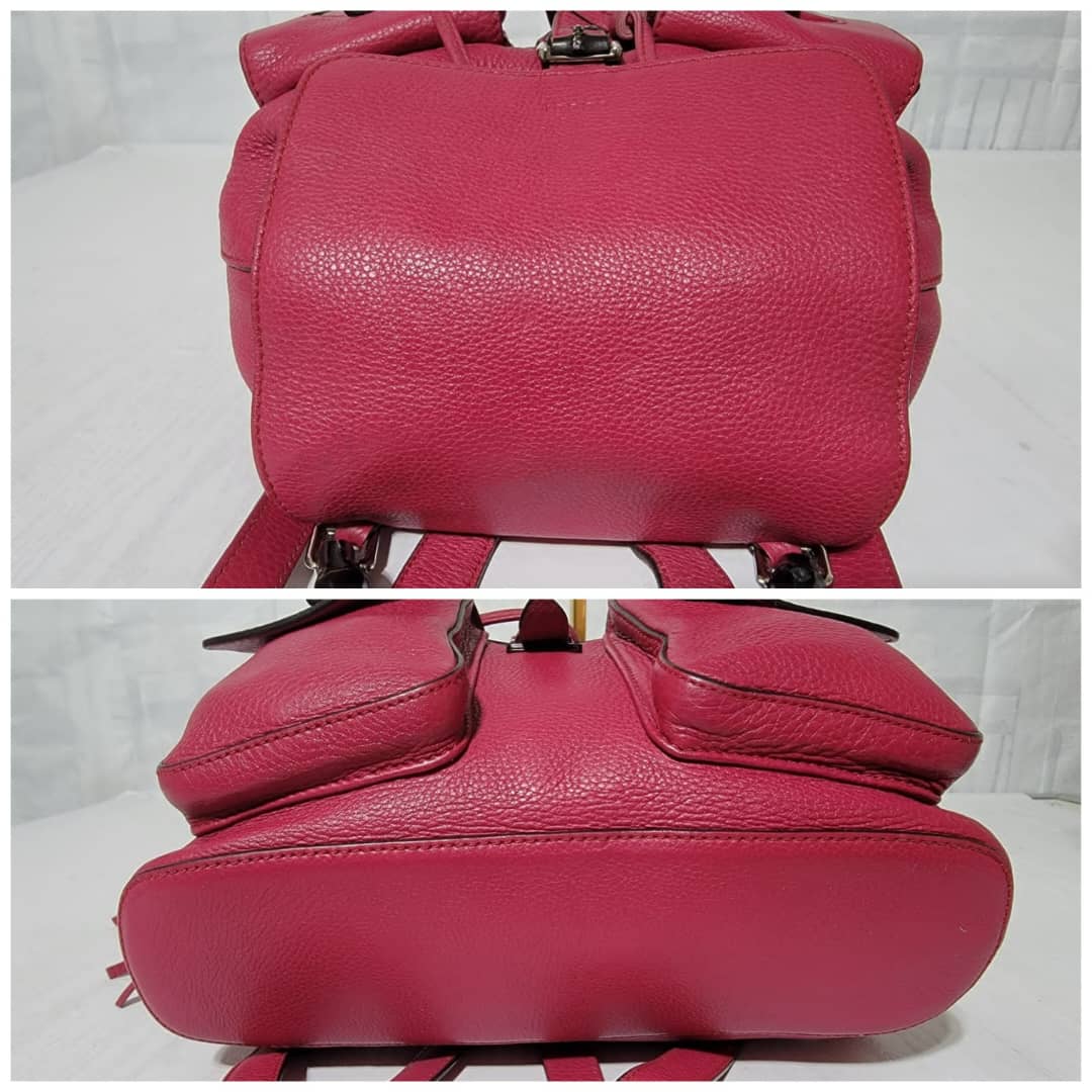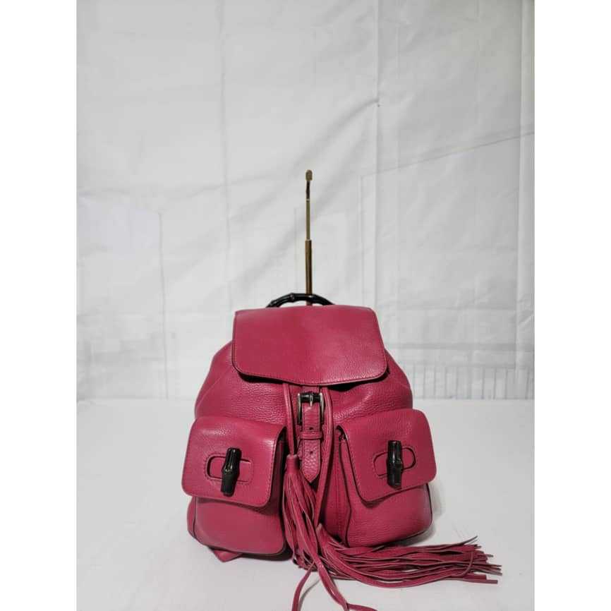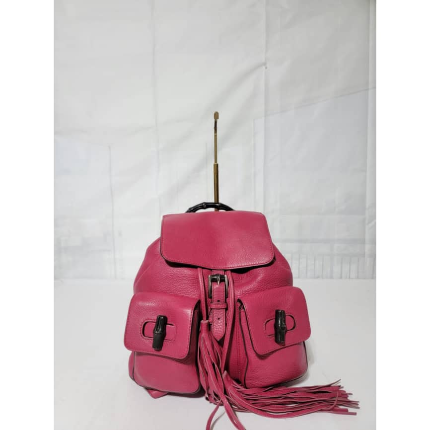 This authentic Gucci fuschia Pebbled Leather Bamboo Rucksack Fringe Backpack is in it’s good pre-owned condition. The exterior is clean and beautiful. Interior is clean and beautiful. It has a fringe drawstring rope. Great condition . Great condition