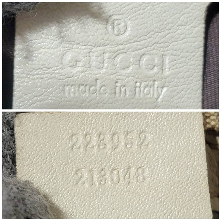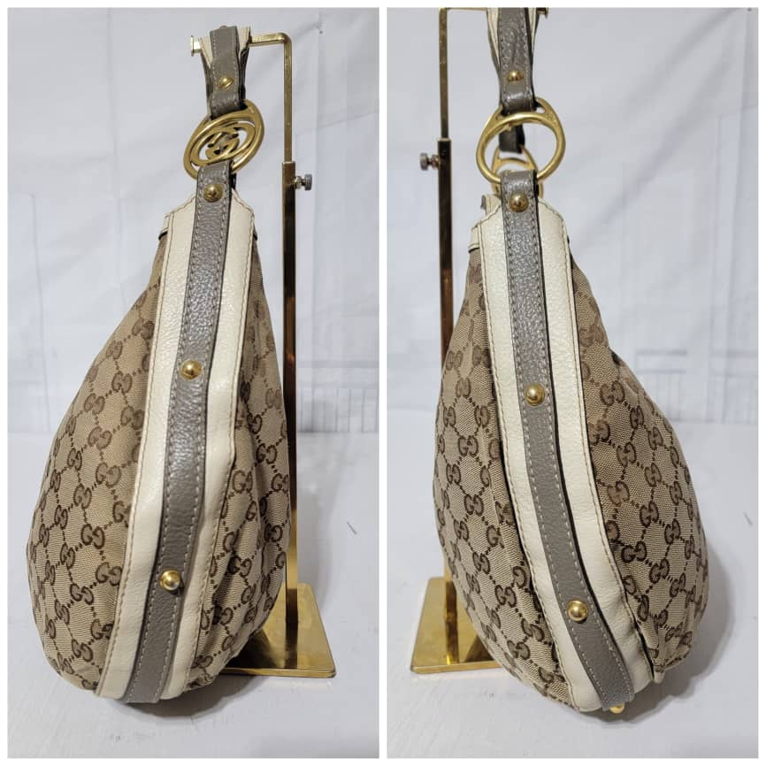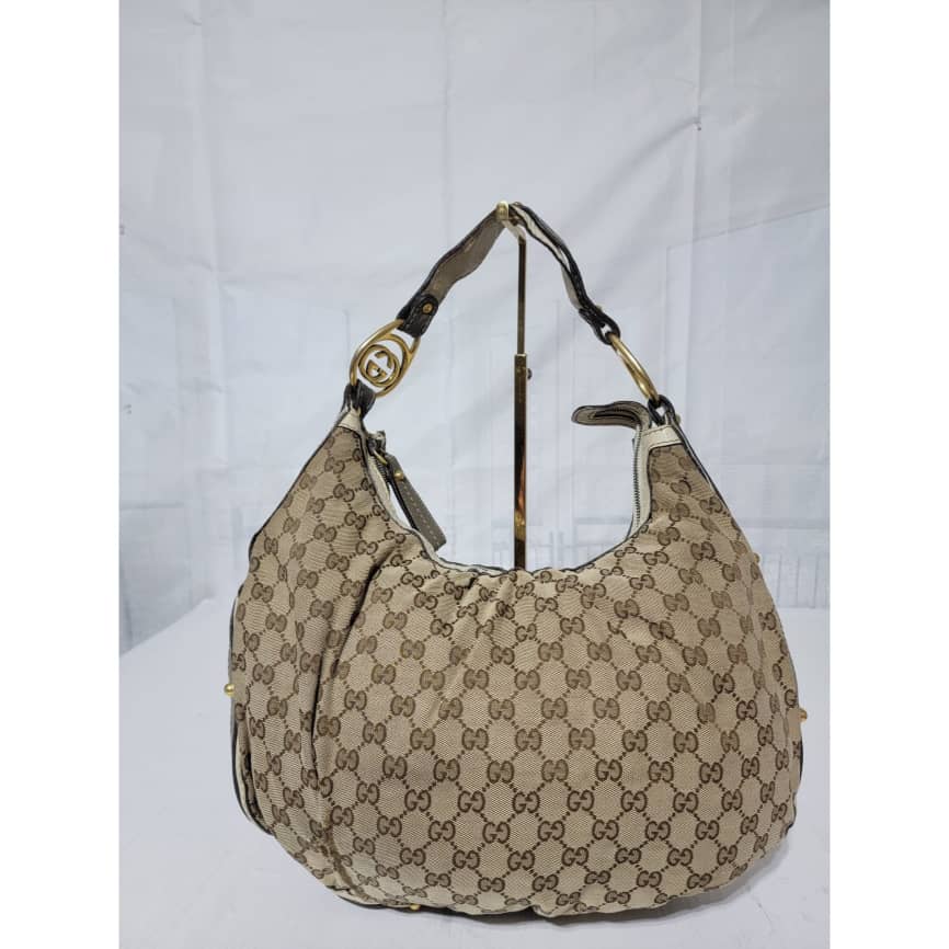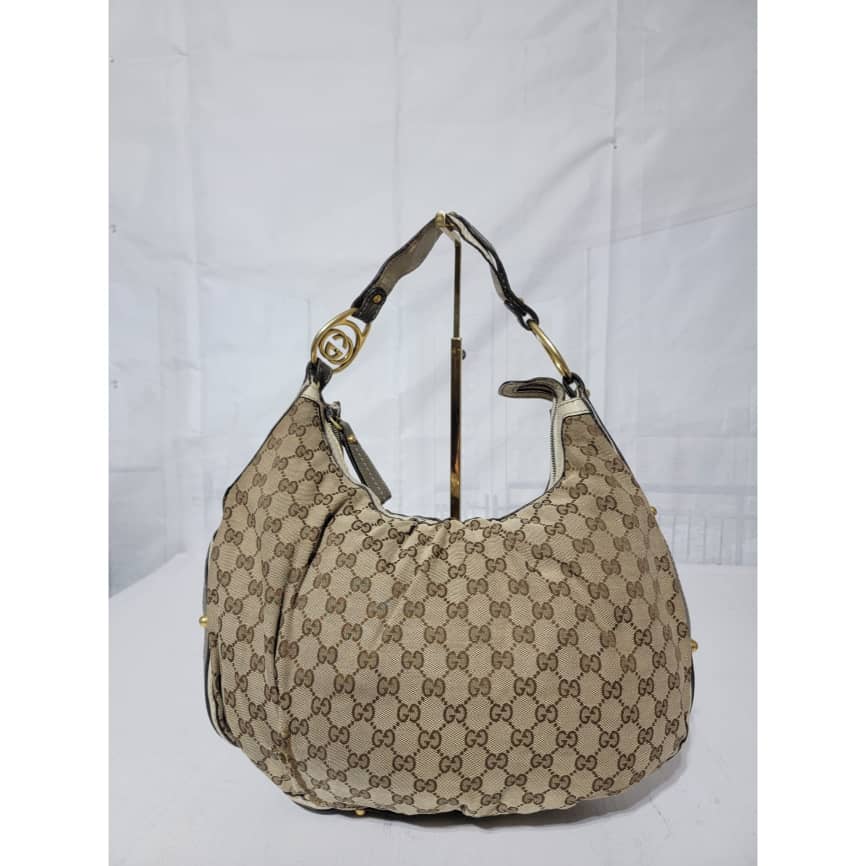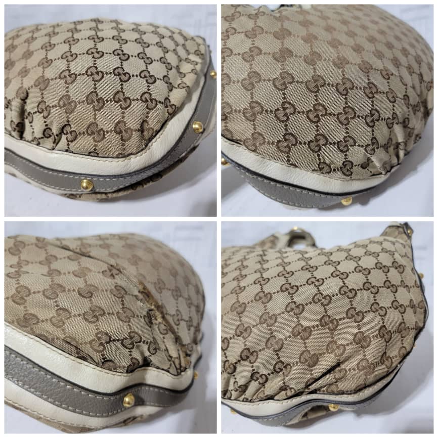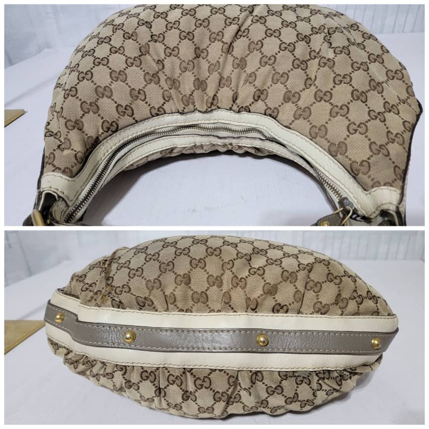 This authentic Gucci GG Canvas and Leather Medium Interlocking G Hobo Bag Brown/Beige is in it’s pre-owned condition. The exterior shows sign of wear and tear. The back of the bag shows a line a tear that was stitched up (Kindly look at pictures above). The shoulder handle shows sigh of wear. It has a GG logo by the side of the handle of the bag.