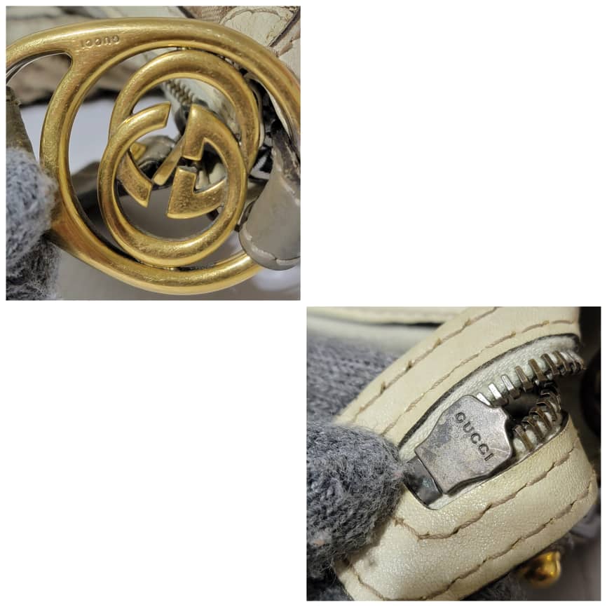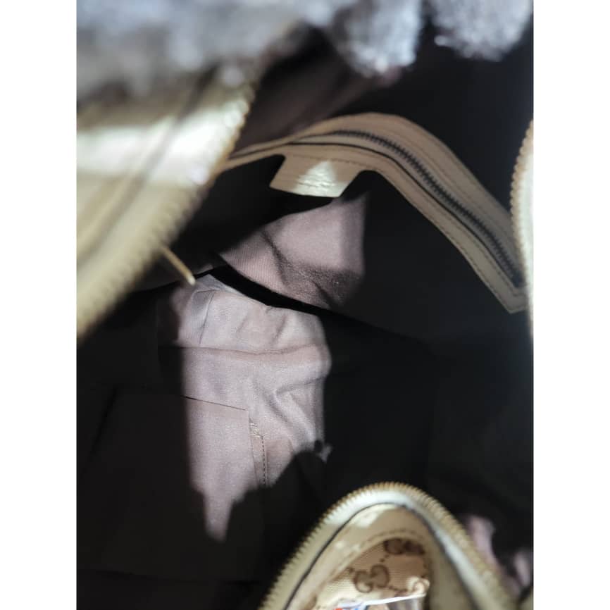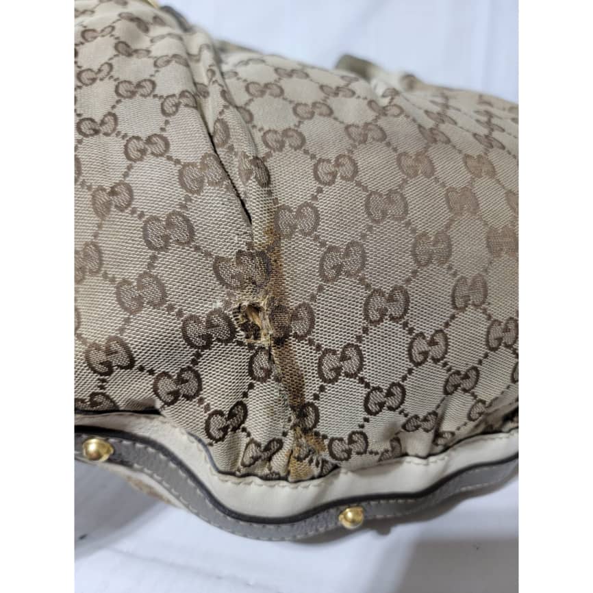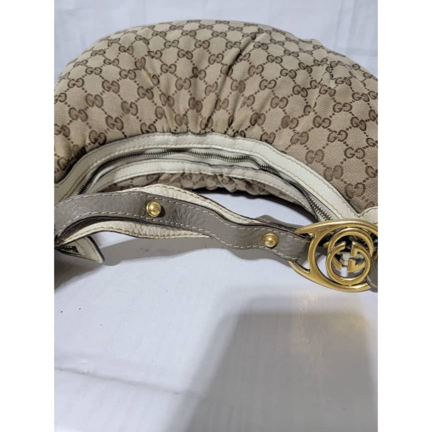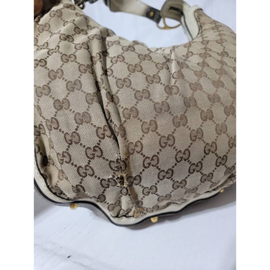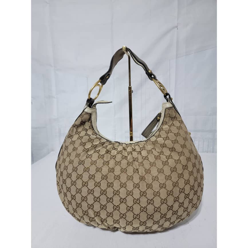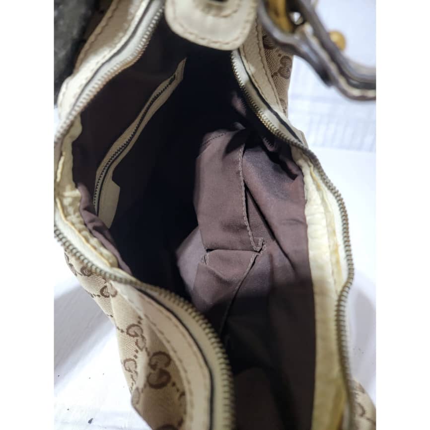 This authentic Gucci GG Canvas and Leather Medium Interlocking G Hobo Bag Brown/Beige is in it’s pre-owned condition. The exterior shows sign of wear and tear. The back of the bag shows a line a tear that was stitched up (Kindly look at pictures above). The shoulder handle shows sigh of wear. It has a GG logo by the side of the handle of the bag.