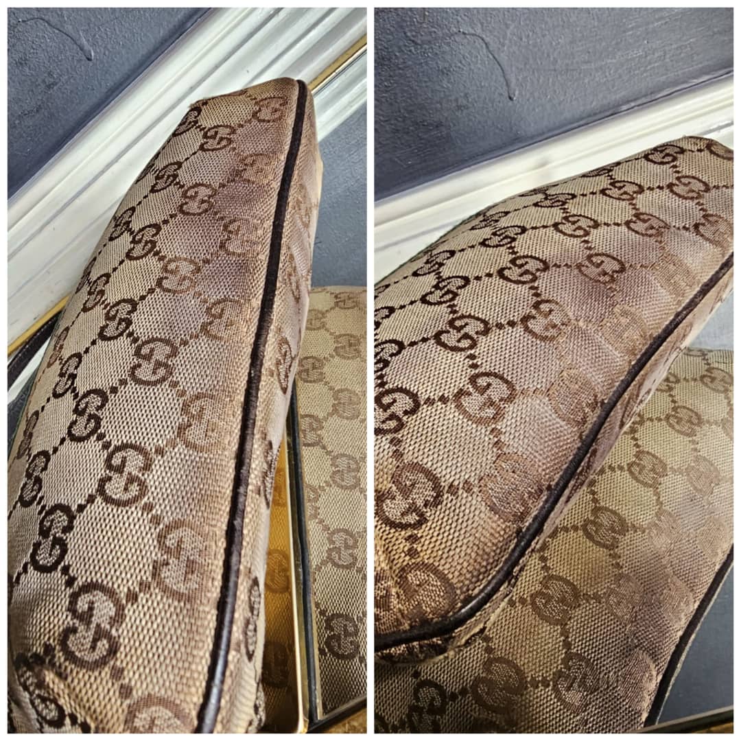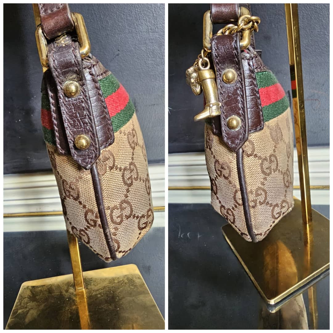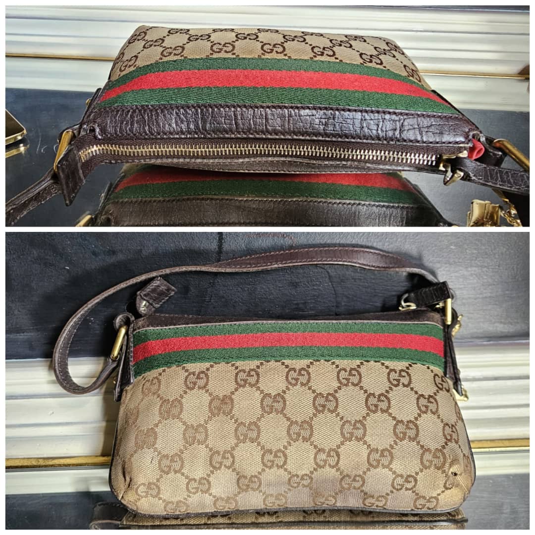 This authentic Gucci GG Canvas and Leather Web Pochette Clutch Bag Beige/Dark Brown is in it’s good pre-owned condition. The exterior canvas and leather is clean and beautiful. The base of the bag shows some dark rubbing on it (Kindly review pictures). Interior is clean. Gold hardware.