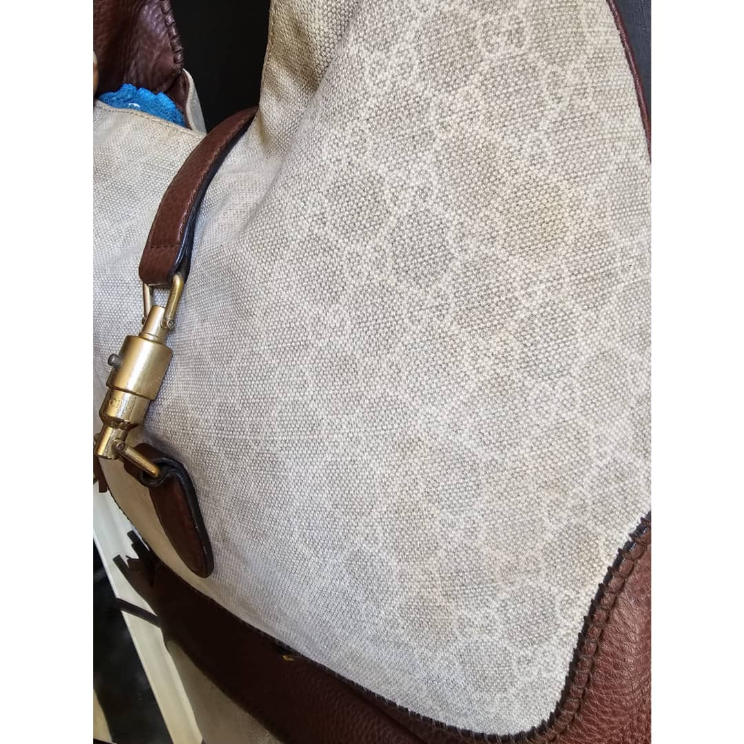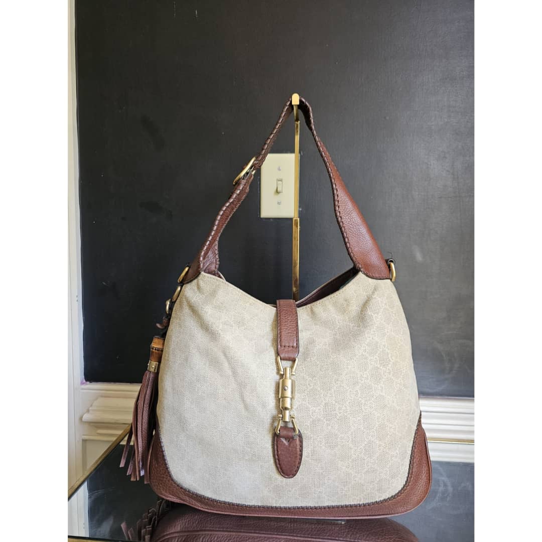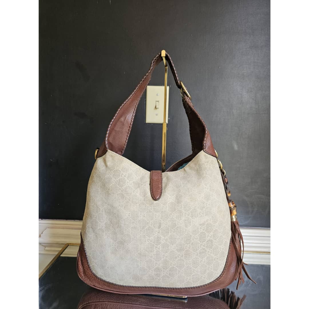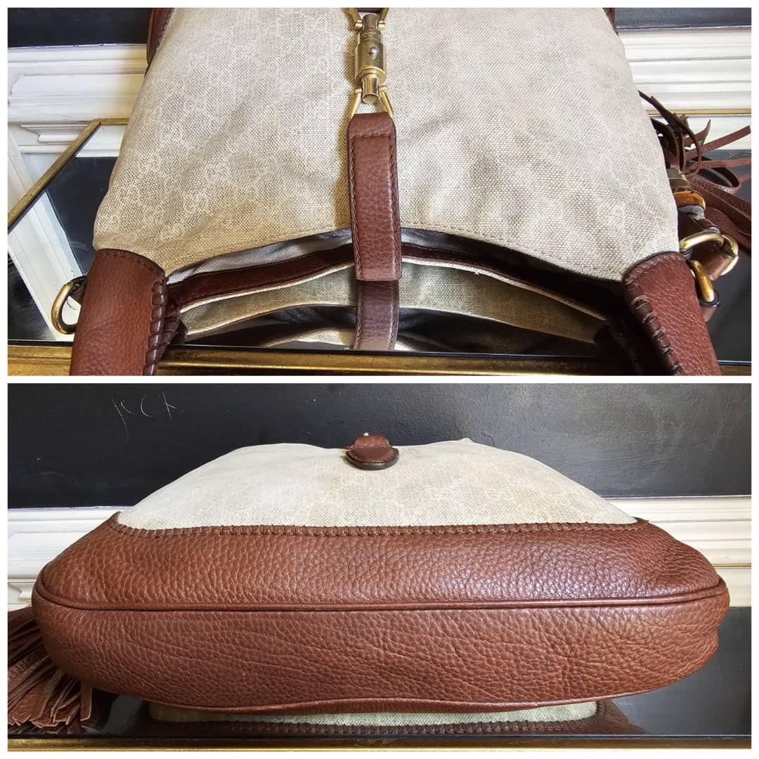 This authentic GUCCI GG Canvas Bamboo New Jackie Medium Shoulder Bag Beige/Brown is in it’s good pre-owned condition. The exterior GG print canvas is clean and beautiful,shows little bit of slight fading (Kindly review pictures above). Interior is clean. Gold hardware shows some scratches.