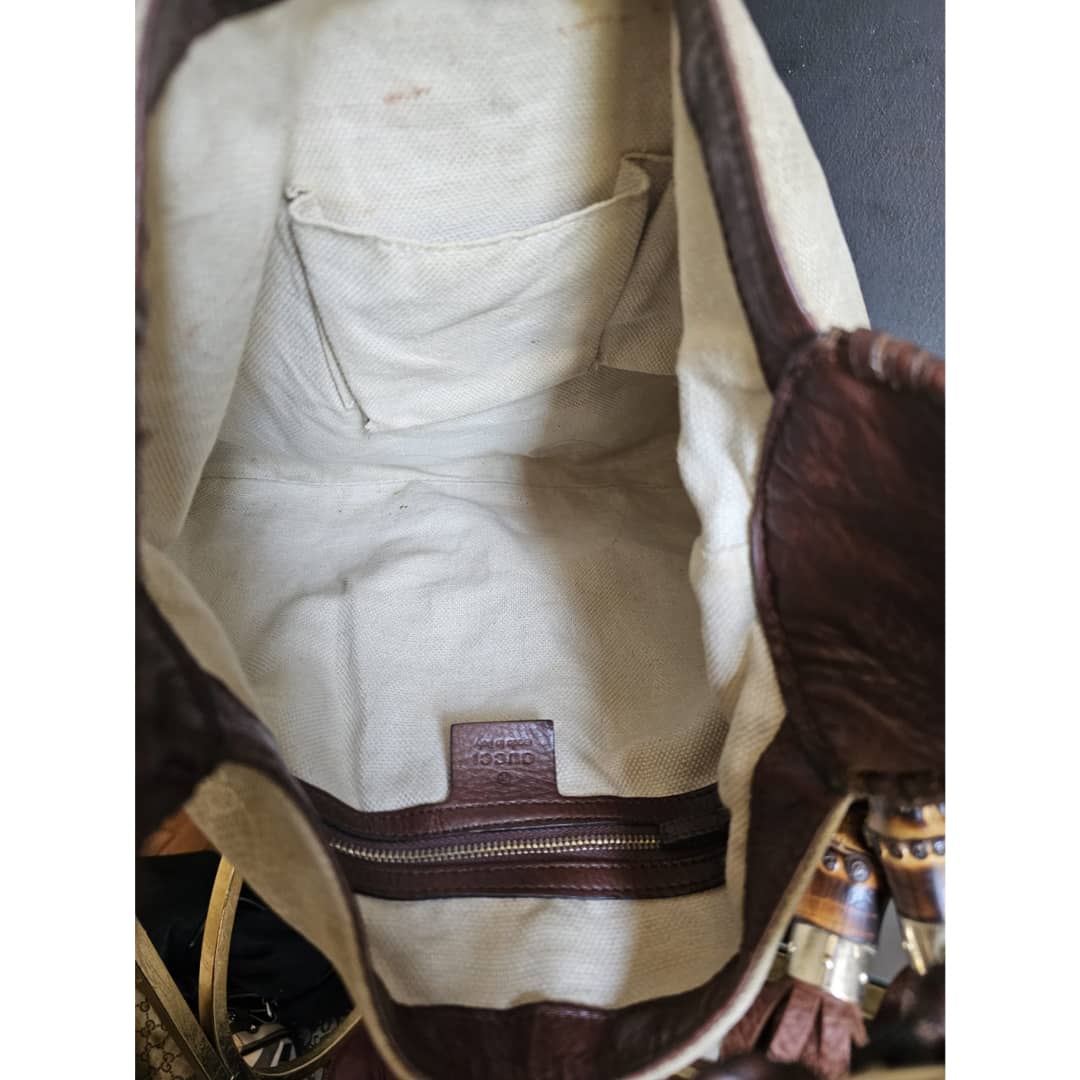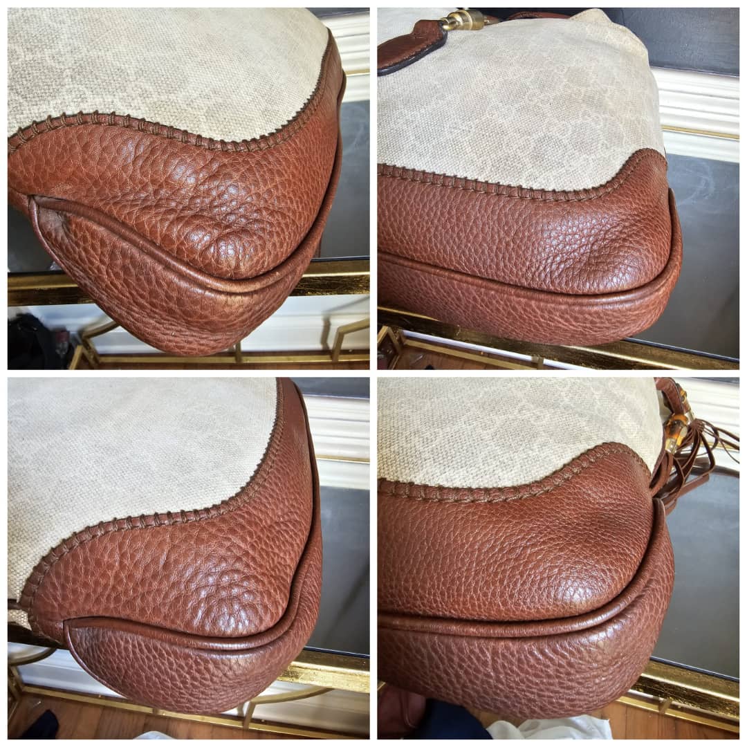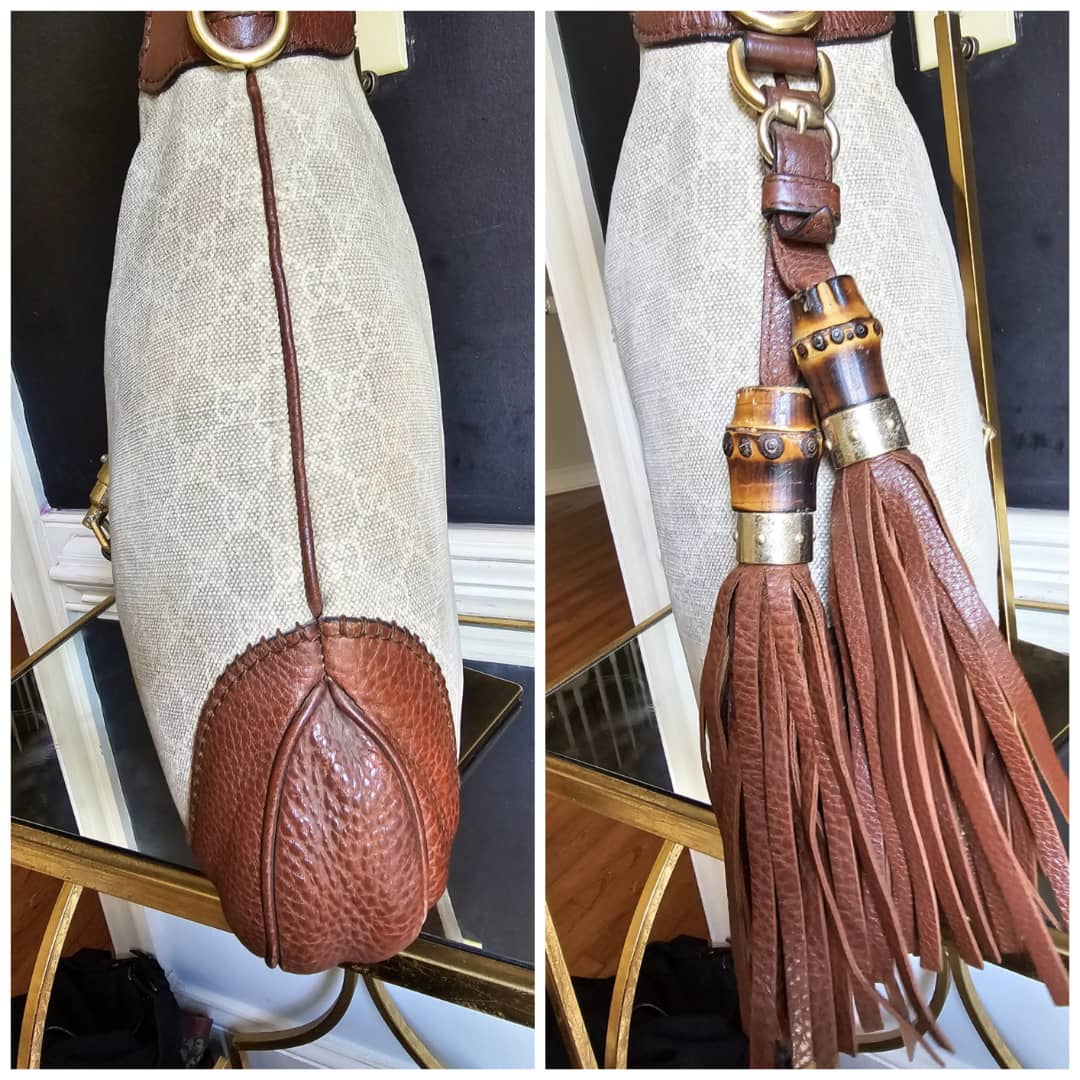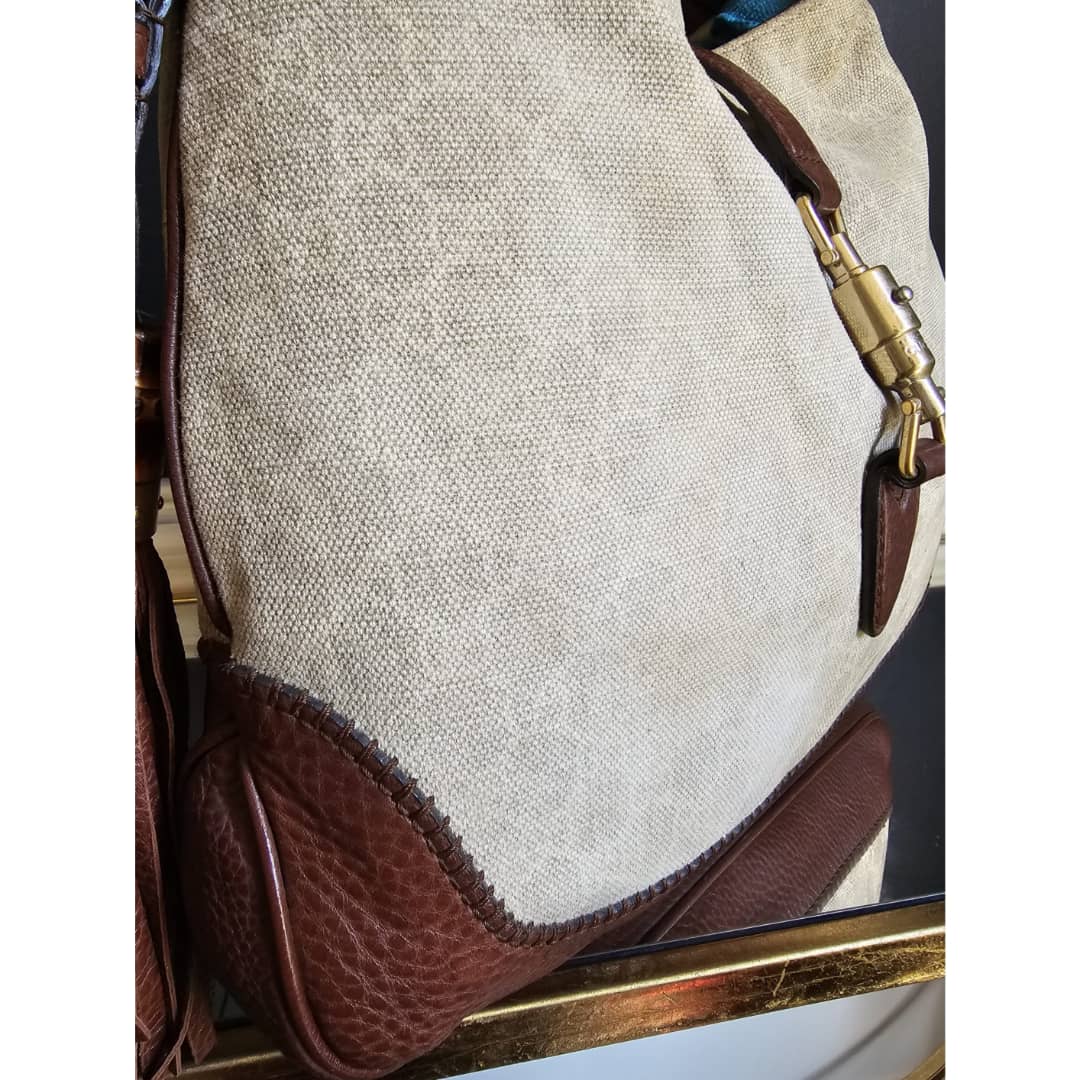 This authentic GUCCI GG Canvas Bamboo New Jackie Medium Shoulder Bag Beige/Brown is in it’s good pre-owned condition. The exterior GG print canvas is clean and beautiful,shows little bit of slight fading (Kindly review pictures above). Interior is clean. Gold hardware shows some scratches.