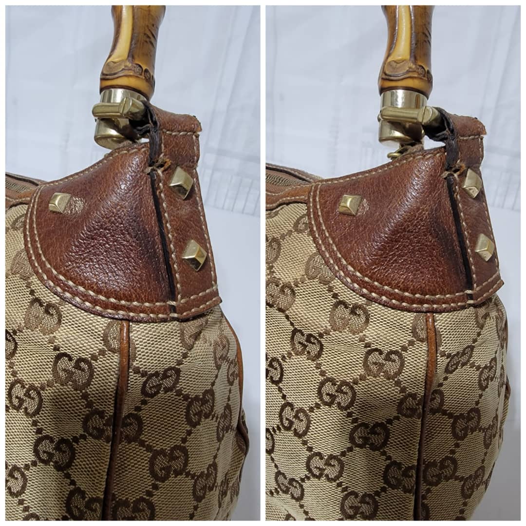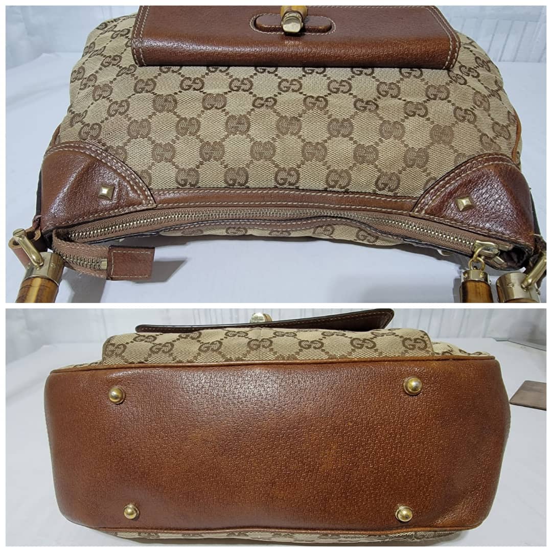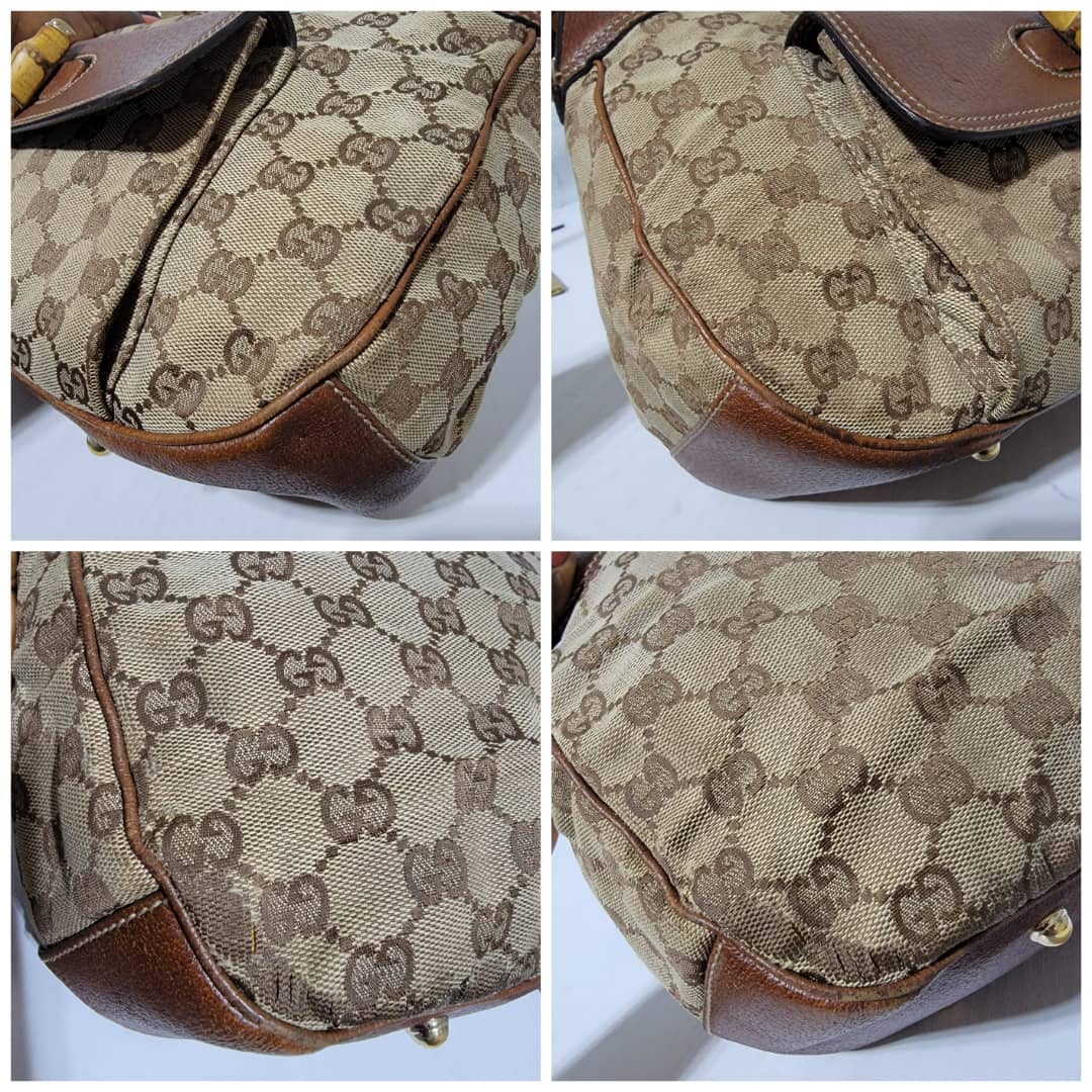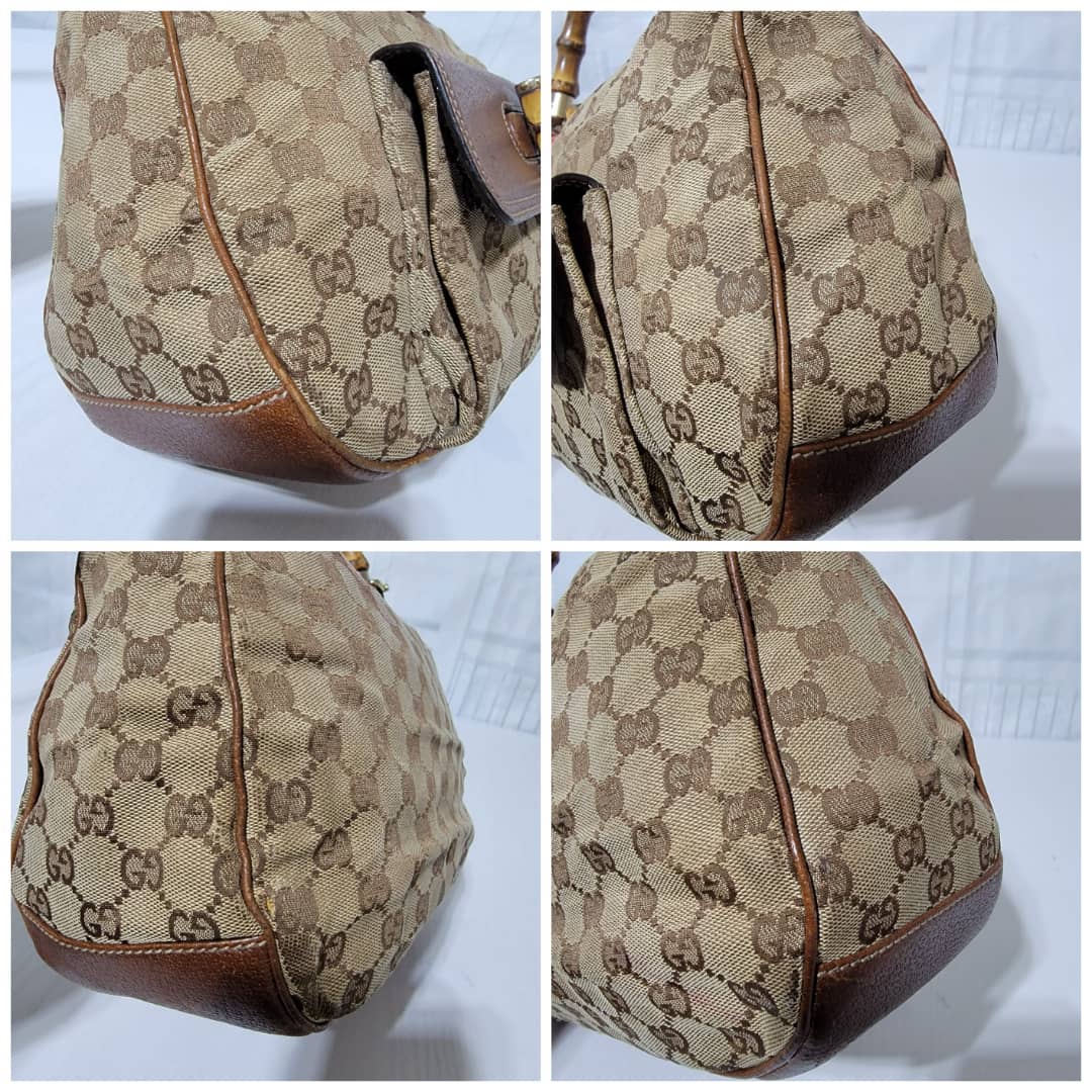 This authentic Gucci gg Canvas and Leather Bamboo Handle Top Handle Bag Beige/Brown is in it’s good pre-owned condition. The exterior canvas is clean and beautiful. The base edges shows scratches and scuffs to the brown leather trim that runs across the bag. There is wear to the side of the handle (Kindly look at pictures for details). Interior is clean. Gold hardware.