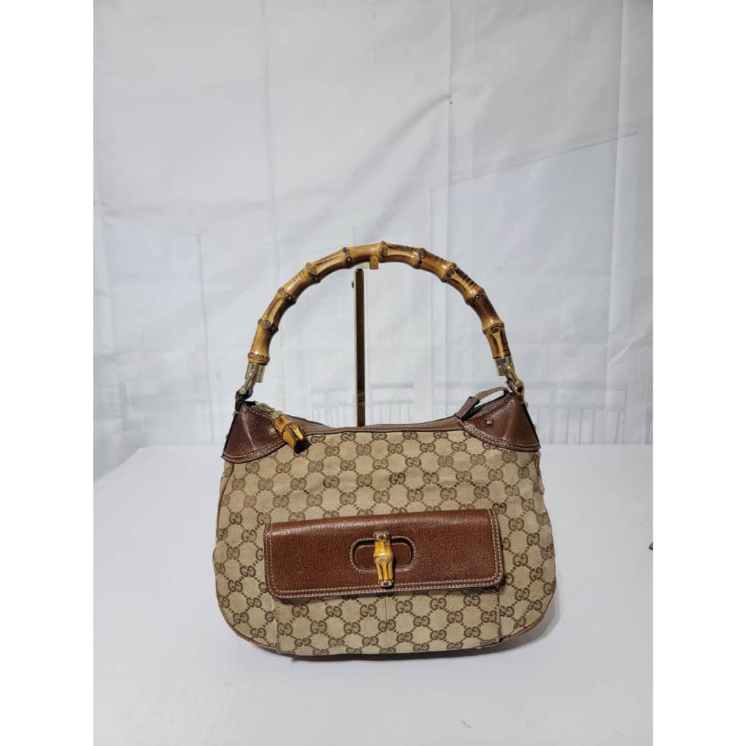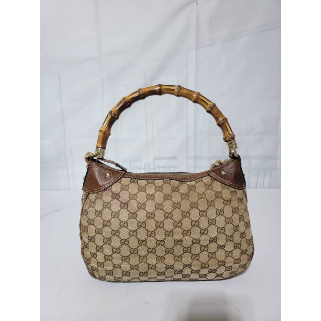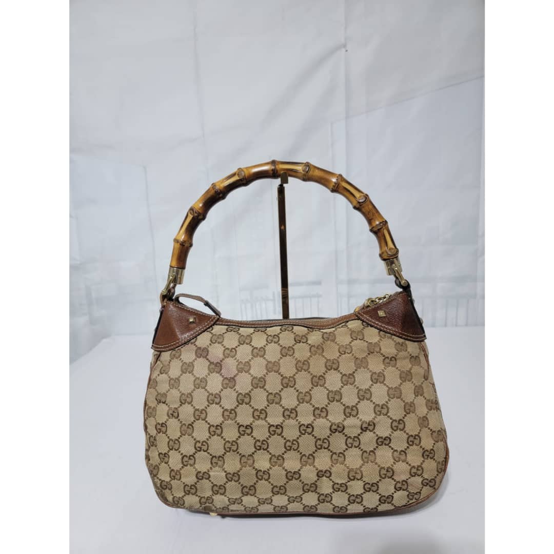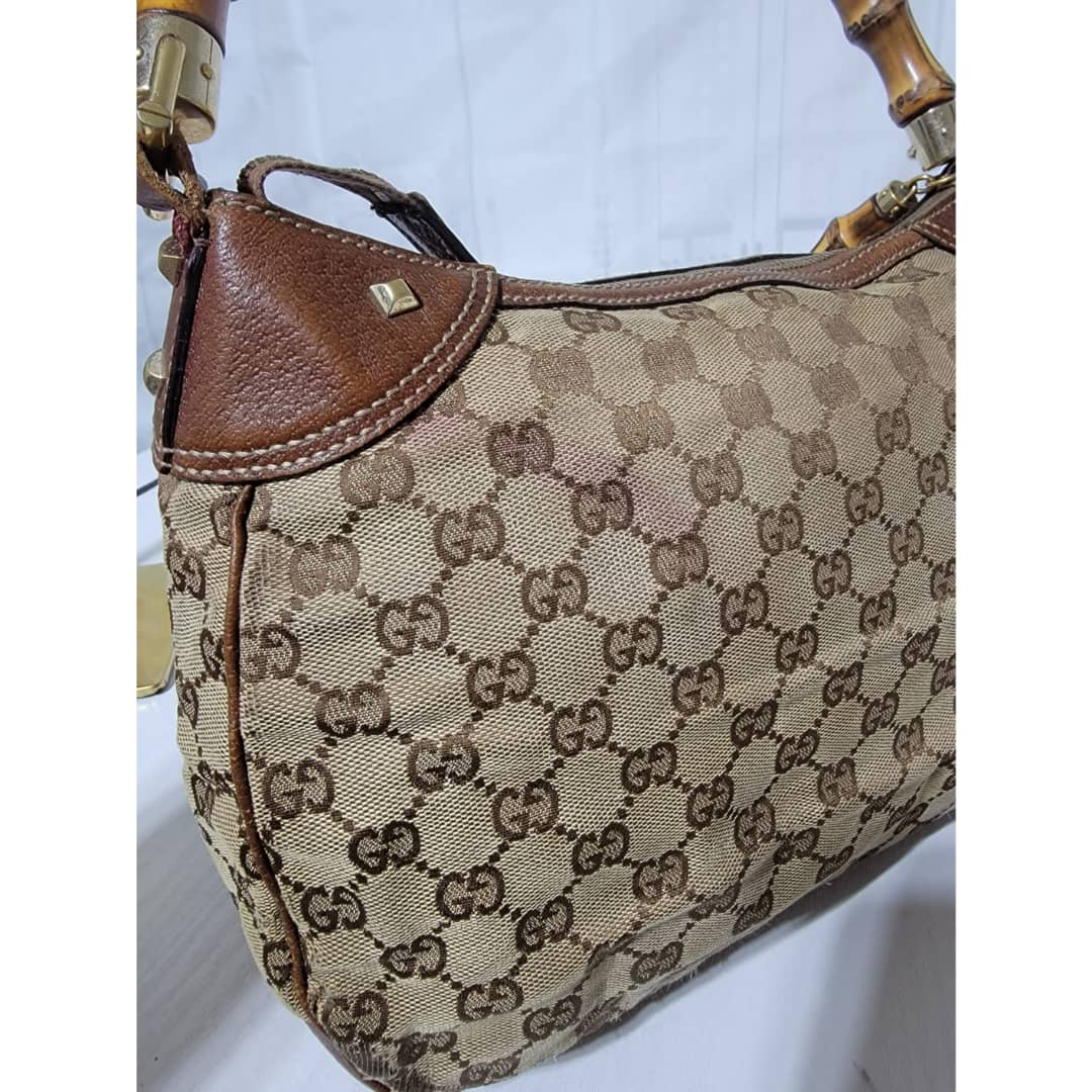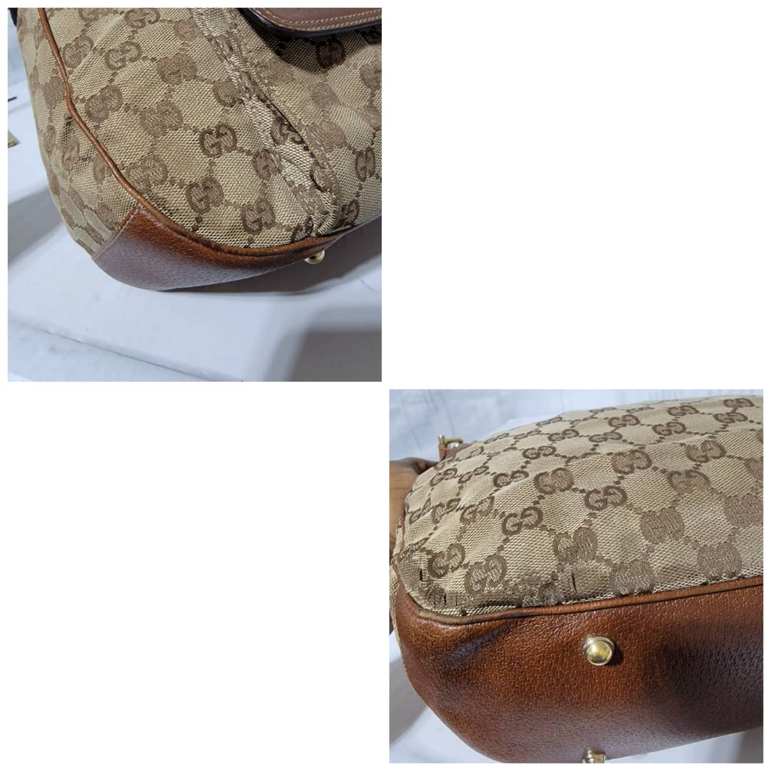 This authentic Gucci gg Canvas and Leather Bamboo Handle Top Handle Bag Beige/Brown is in it’s good pre-owned condition. The exterior canvas is clean and beautiful. The base edges shows scratches and scuffs to the brown leather trim that runs across the bag. There is wear to the side of the handle (Kindly look at pictures for details). Interior is clean. Gold hardware.