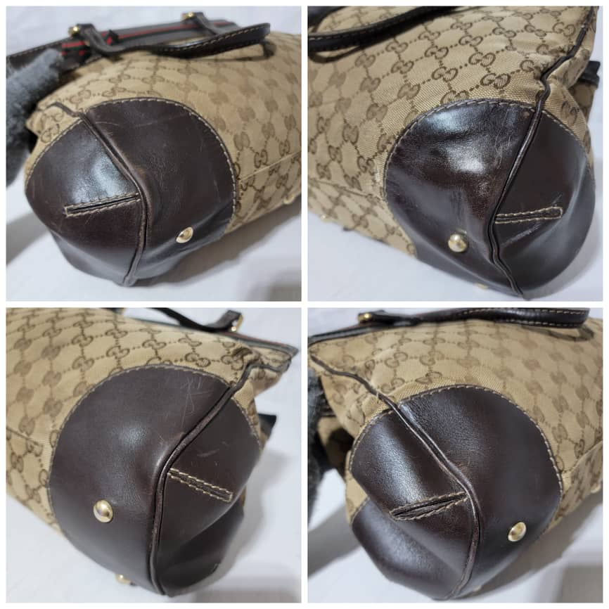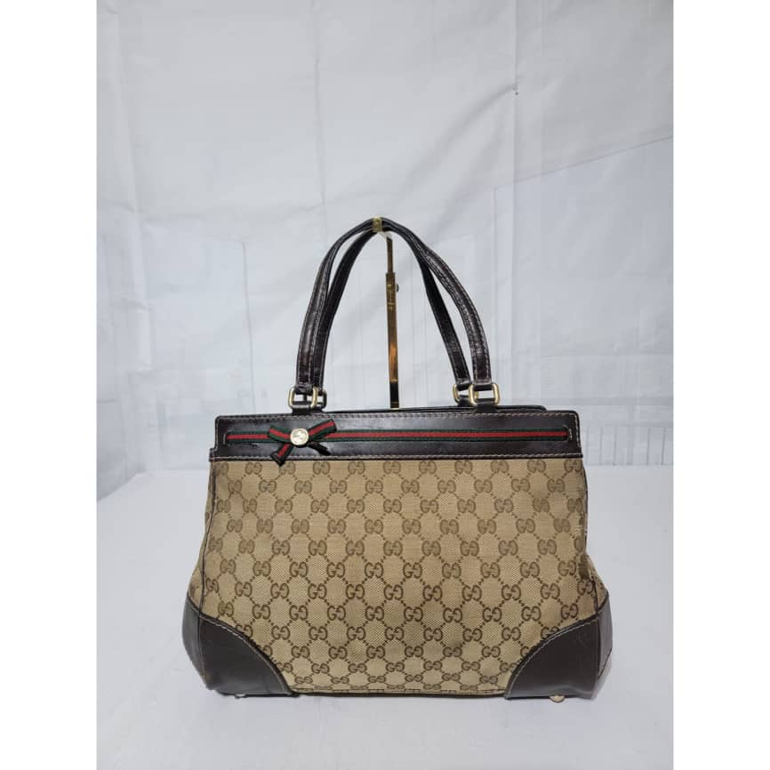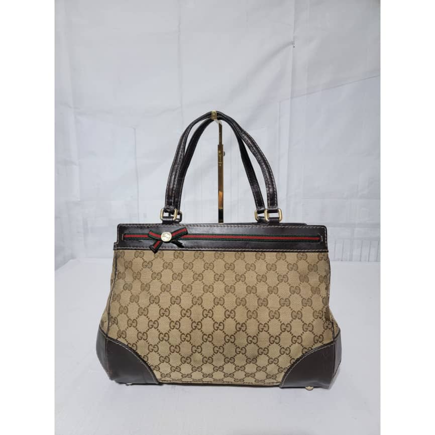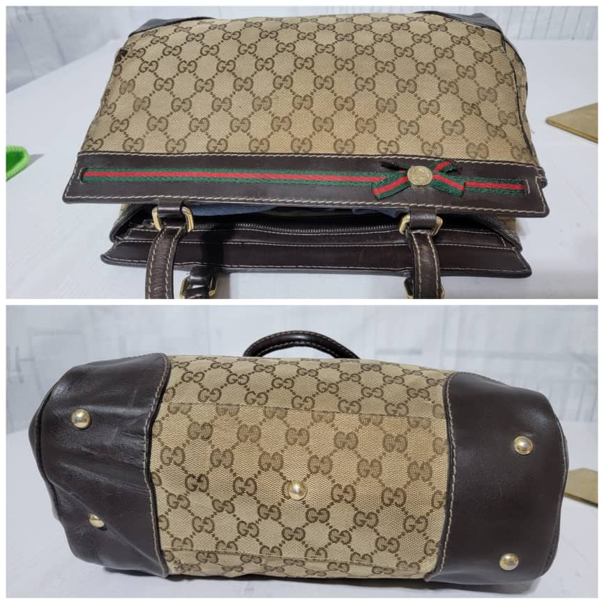This authentic Gucci GG Canvas Mayfair Bow Tote Bag Beige/Brown is in it’s pre-owned condition. The exterior canvas is clean, however one corner of the bag shows a little threadpull (Kindly look at pictures above). There are some scratches to the leather. Gold hardware shows scratches. Shows sign of preloved use