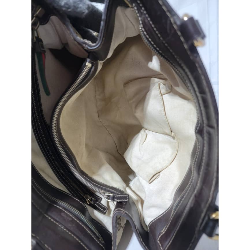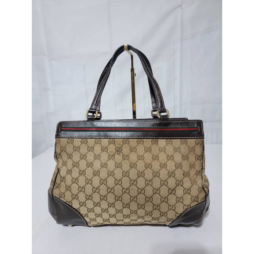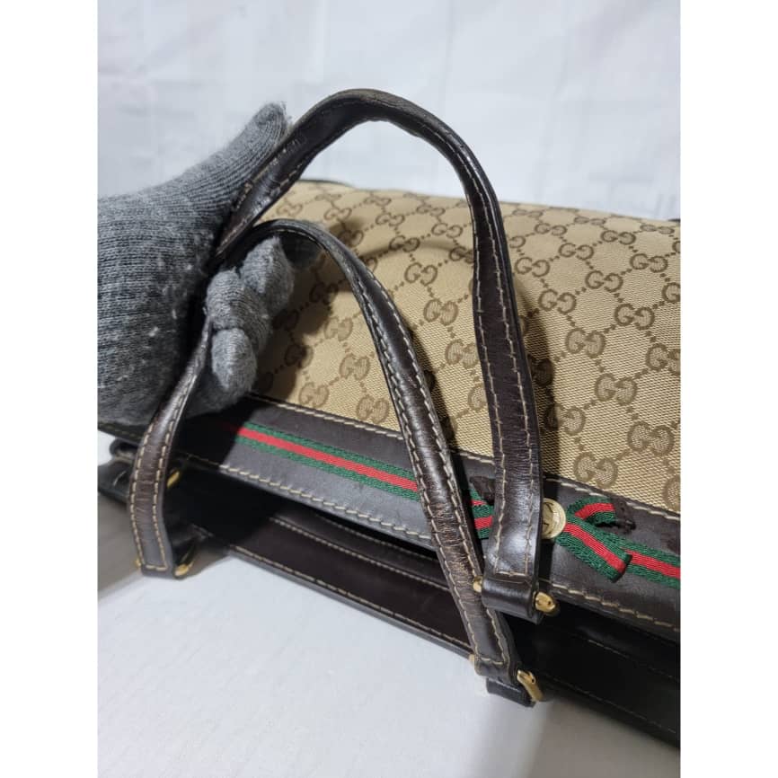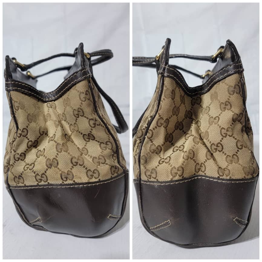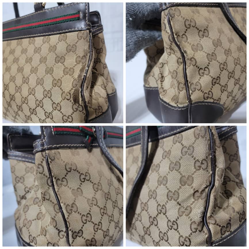 This authentic Gucci GG Canvas Mayfair Bow Tote Bag Beige/Brown is in it’s pre-owned condition. The exterior canvas is clean, however one corner of the bag shows a little threadpull (Kindly look at pictures above). There are some scratches to the leather. Gold hardware shows scratches. Shows sign of preloved use