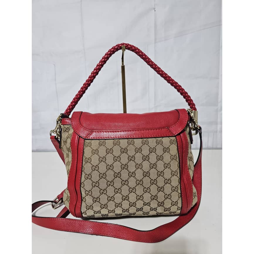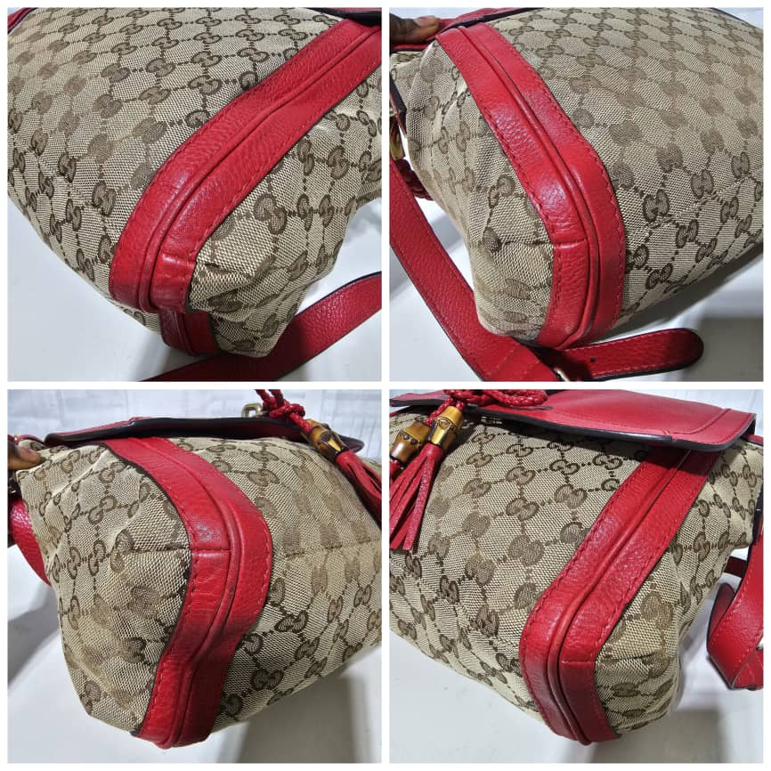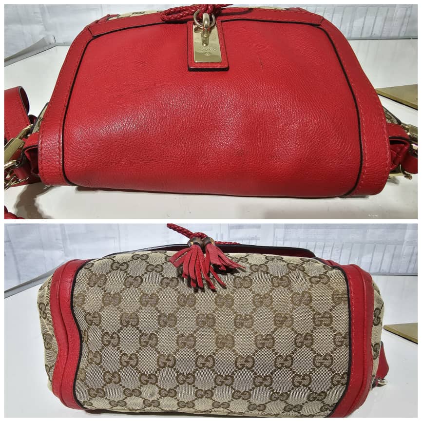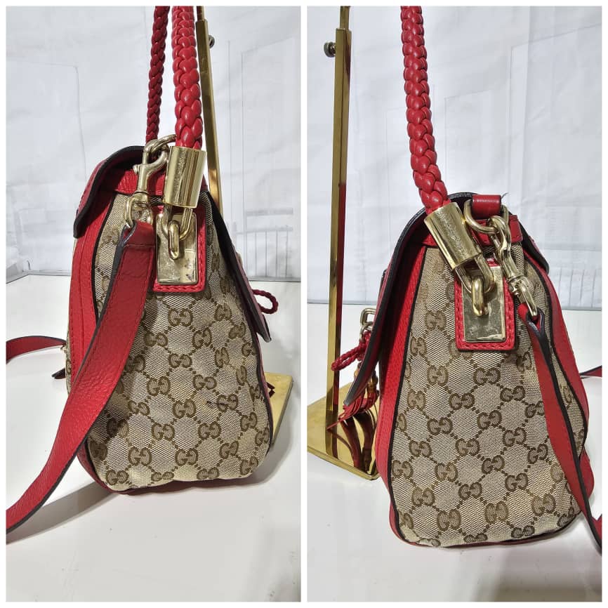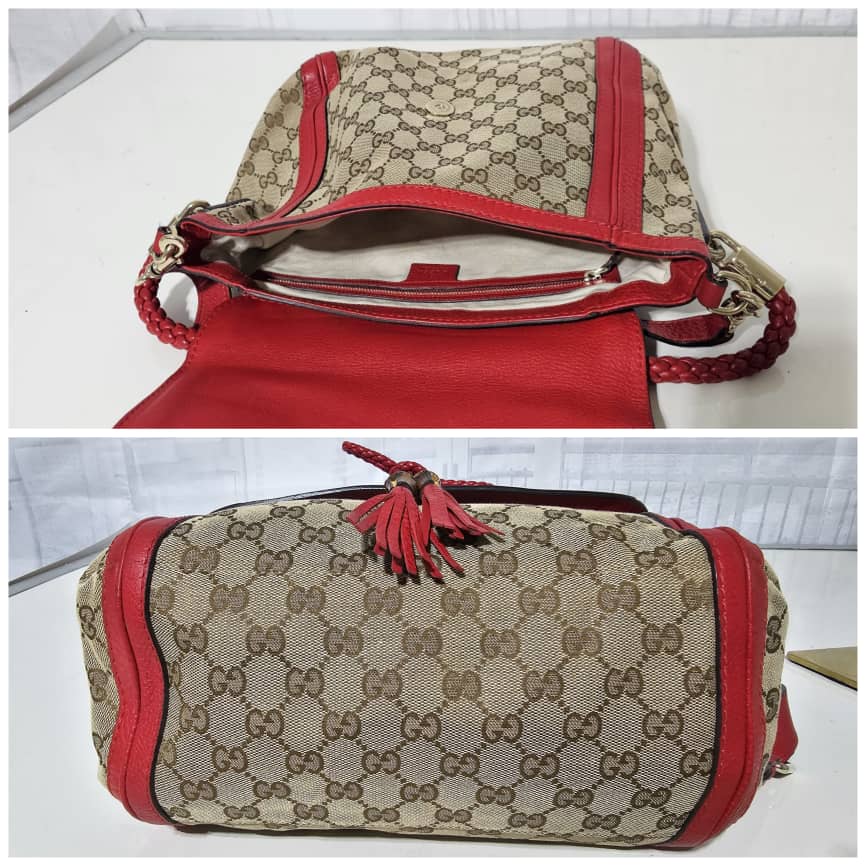 This authentic GUCCI GG Canvas Medium Bella Flap Shoulder Bag Beige/Red is in it’s good pre-owned condition. The exterior canvas and leather is clean and beautiful. The interior is clean. The exterior flap has little pen marks ( I think it can be cleaned if done properly). Kindly review pictures.