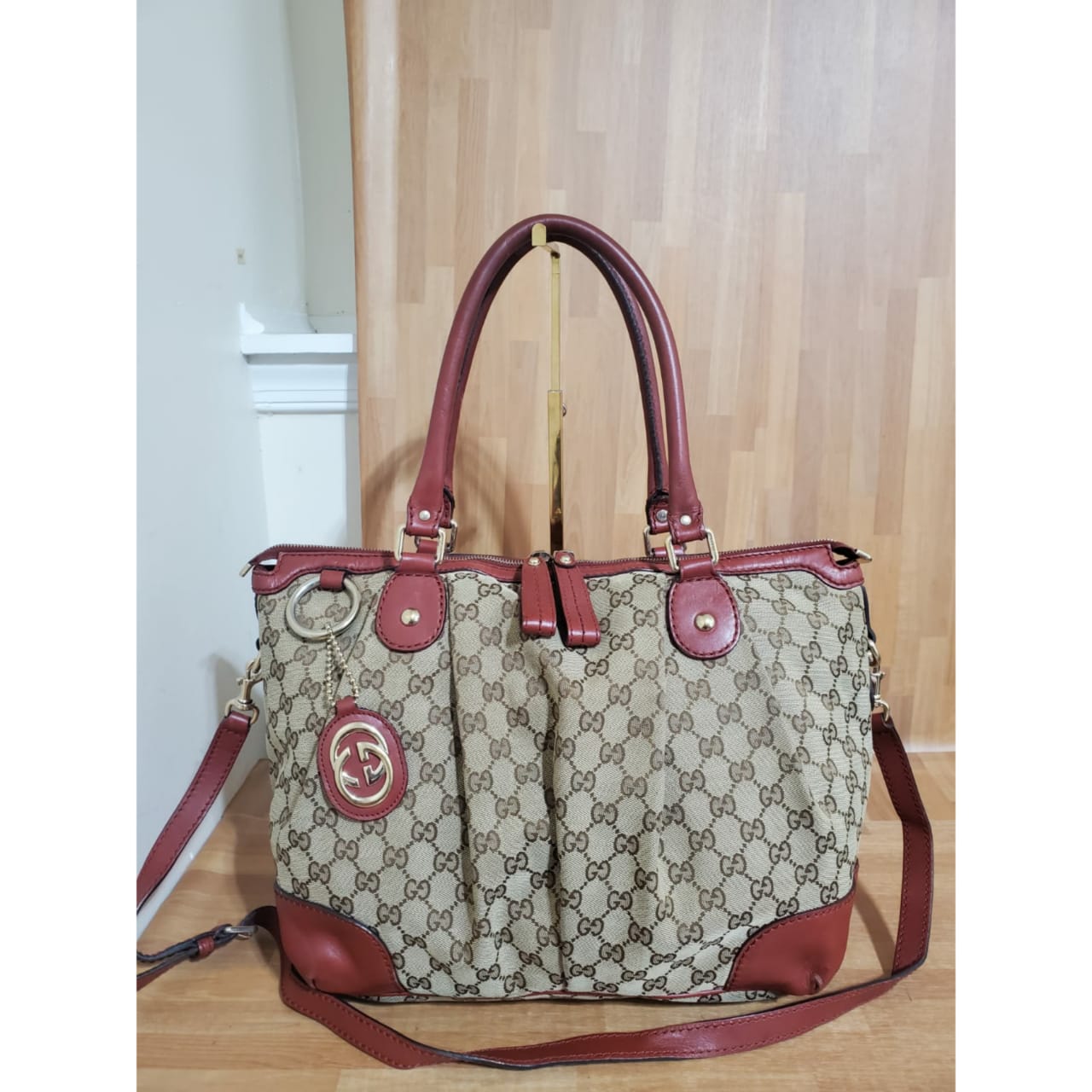 This authentic GUCCI GG Canvas Sukey Top Handle Bag is in it’s pre-owned good condition. The exterior canvas is clean and beautiful with some very minor signs of wear to the bottom corner edges. The interior lining is clean and in excellent condition. It’s a beautiful and classy bag. Can be worn 2 ways.