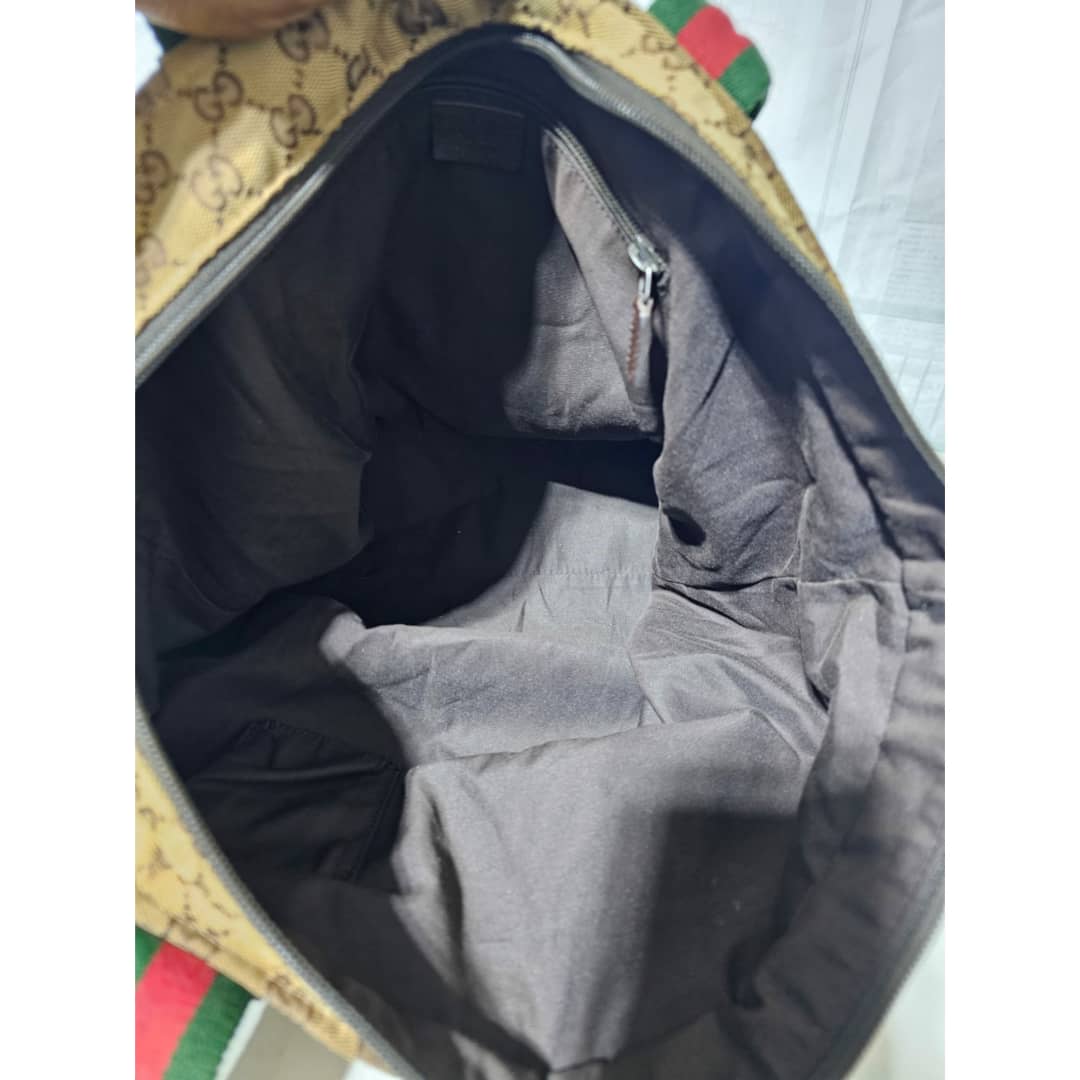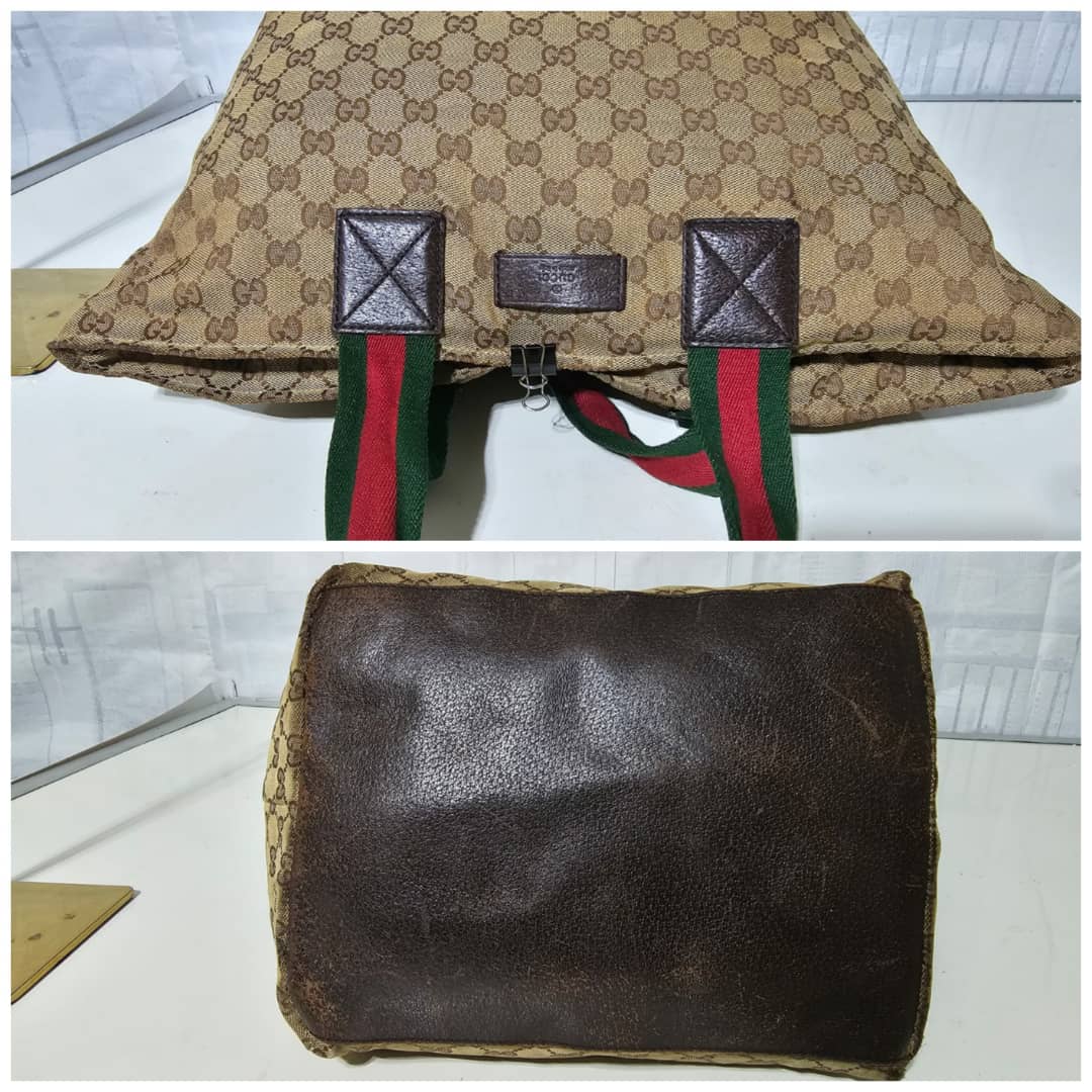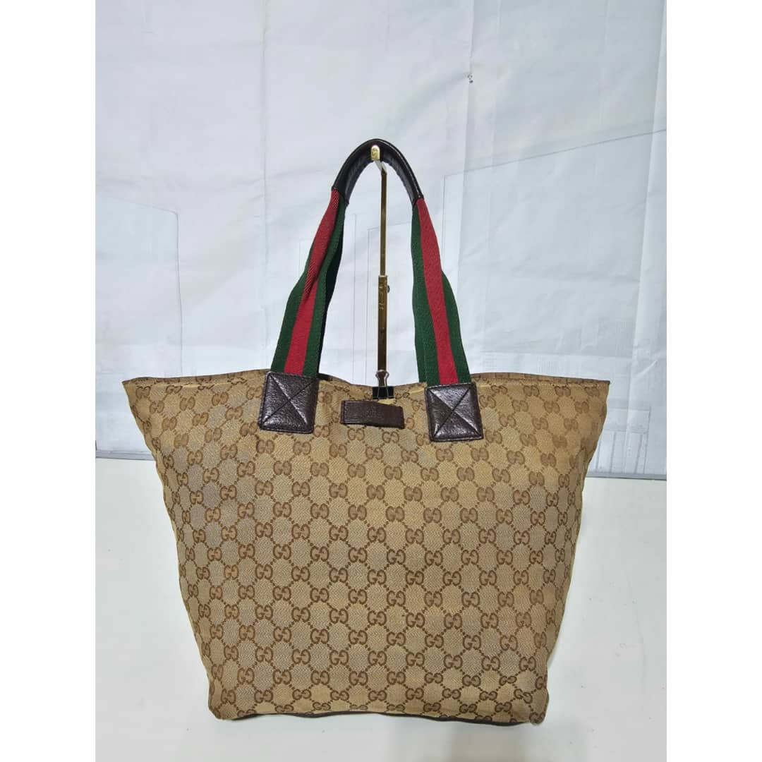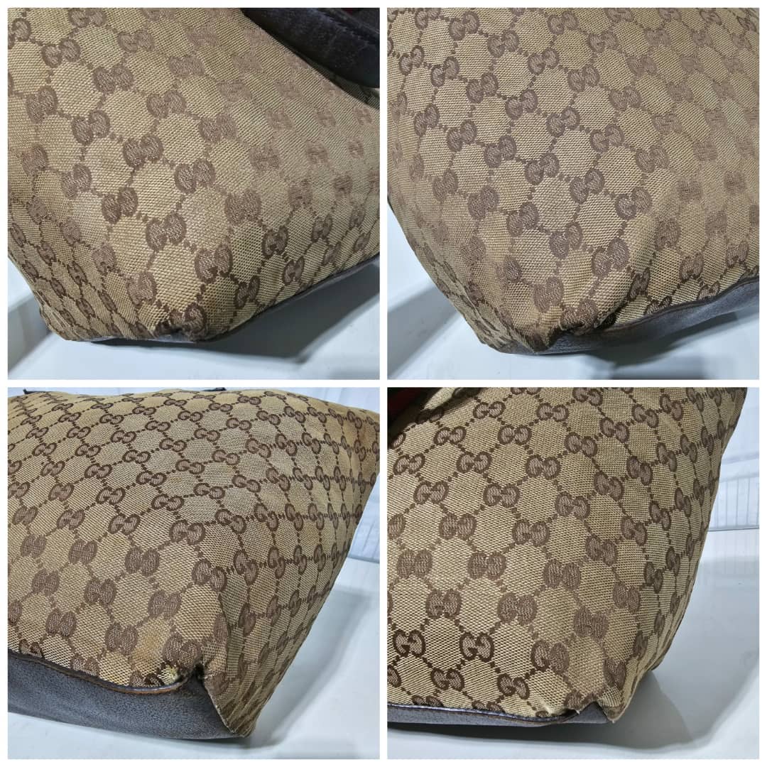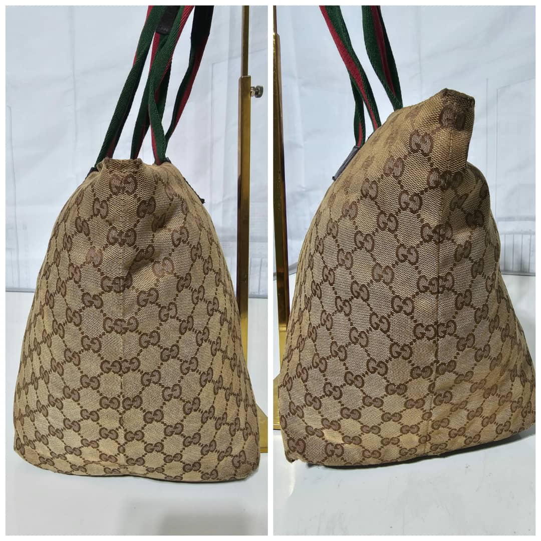 This authentic Gucci GG Canvas Web Tote Bag Brown is in it’s good pre-owned condition. The exterior canvas is clean and beautiful with little scuffing at the base edges, little scratches on the leather. Interior is clean.