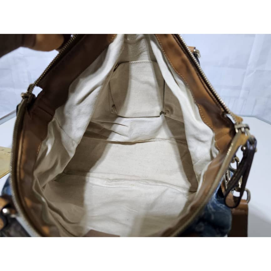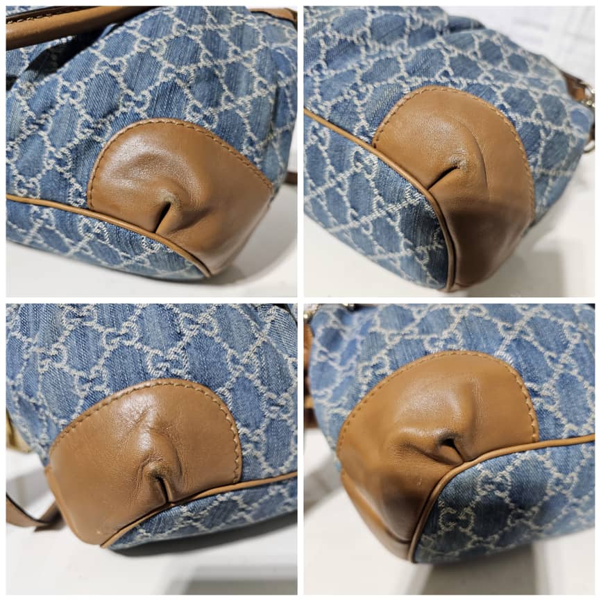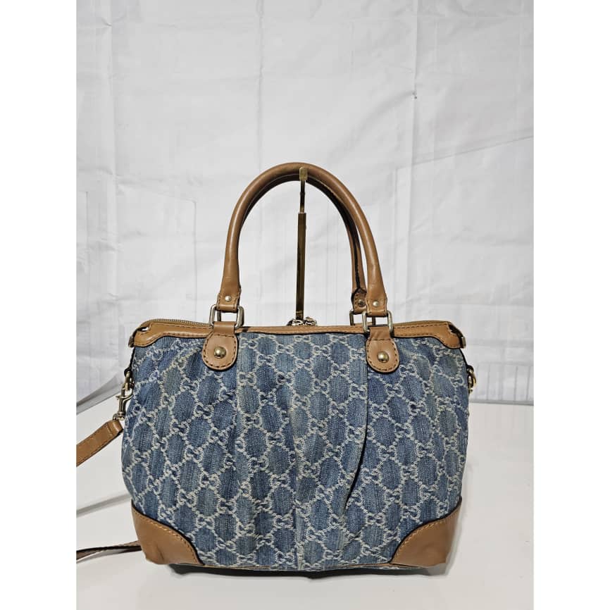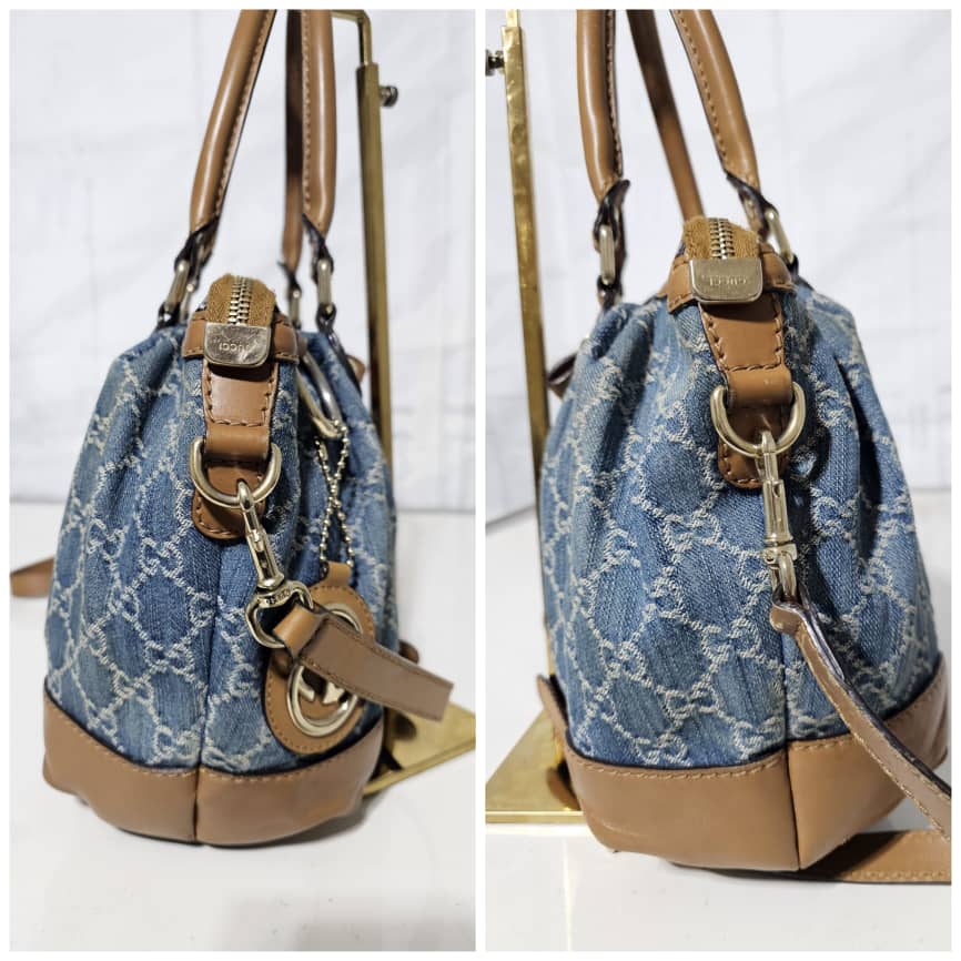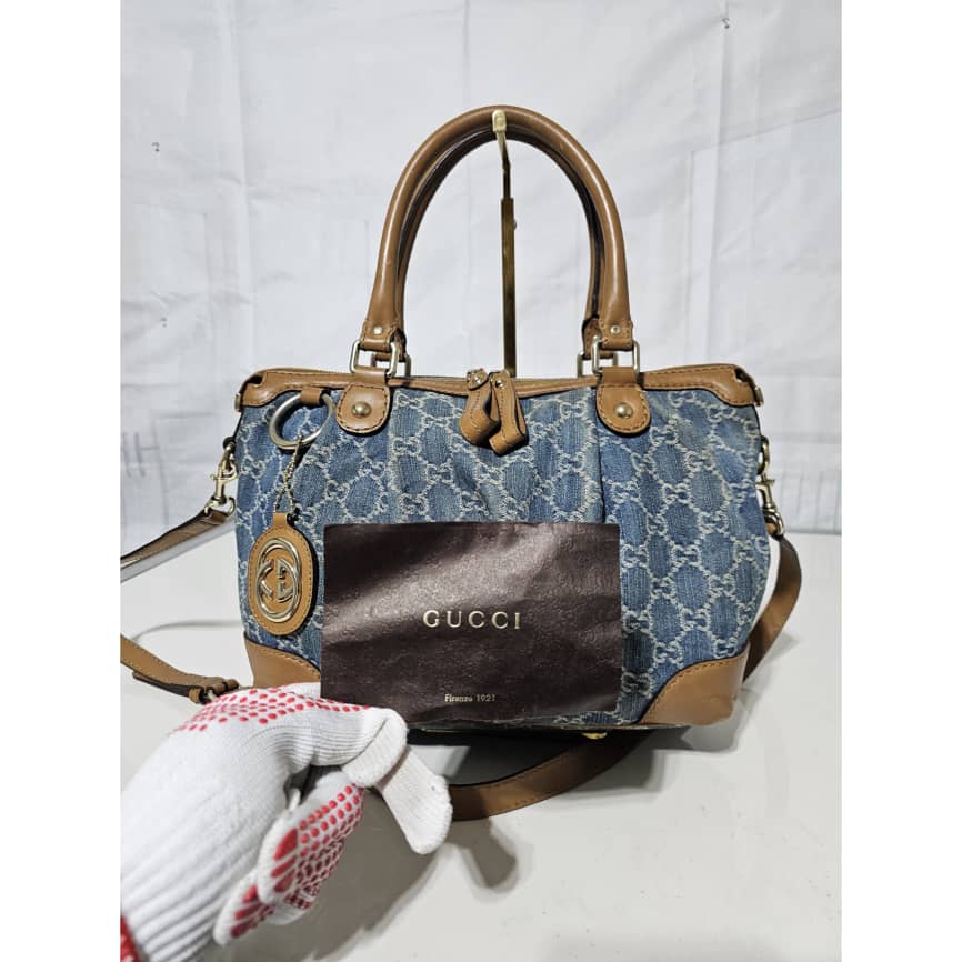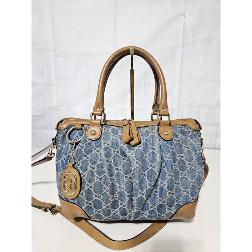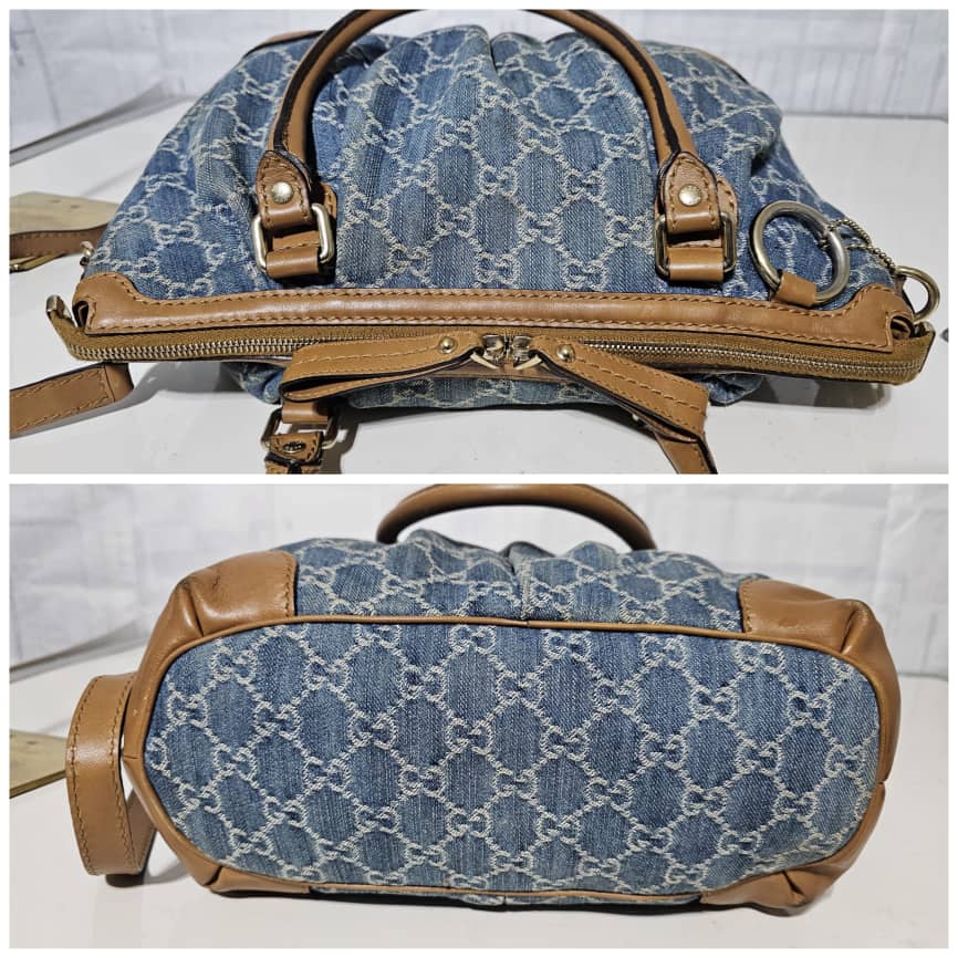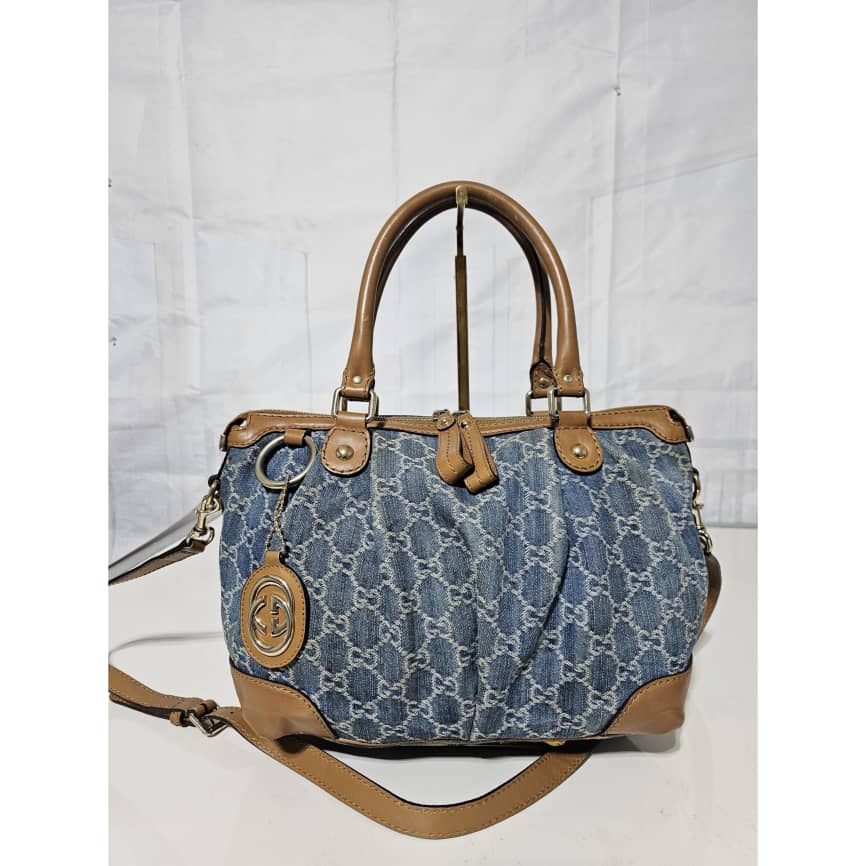 This authentic Gucci GG Denim and Leather Medium Sukey Tote Bag is in it’s good pre-owned condition. The exterior denim and brown trim leather is clean and beautiful. The interior is clean. It comes with a GG charm and an adjustable shoulder strap. Gold hardware.