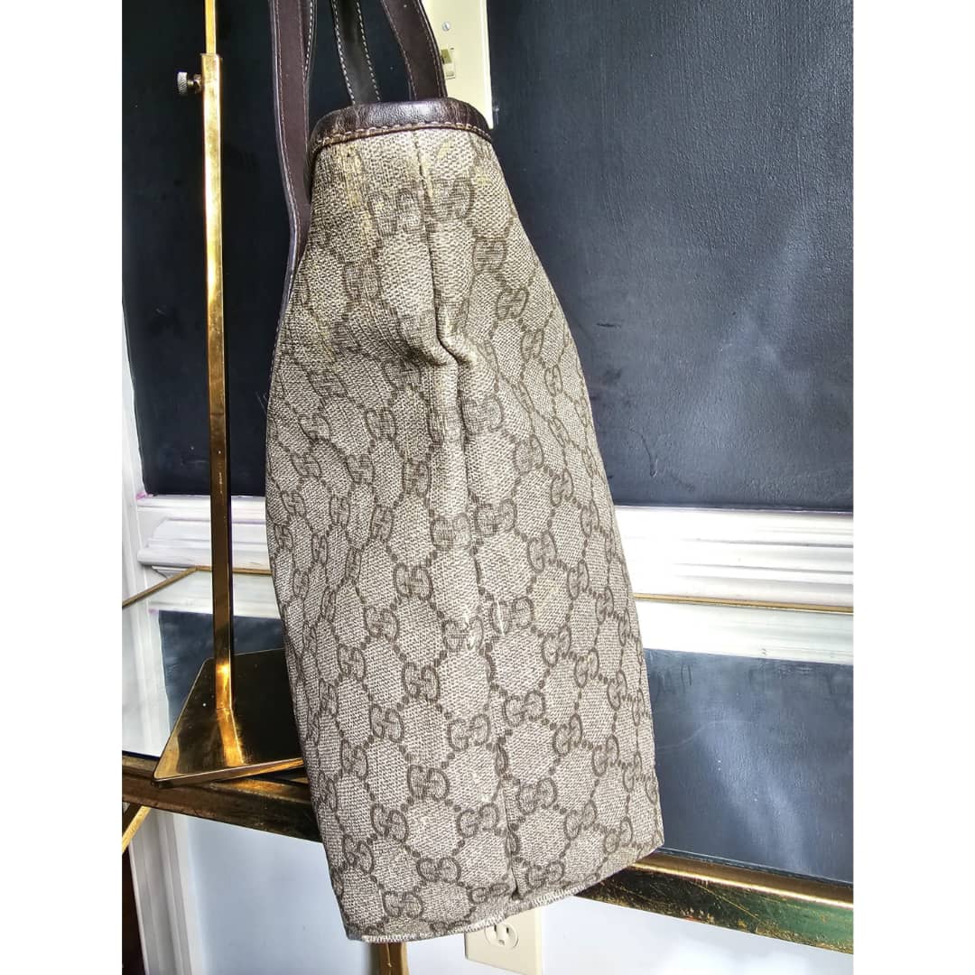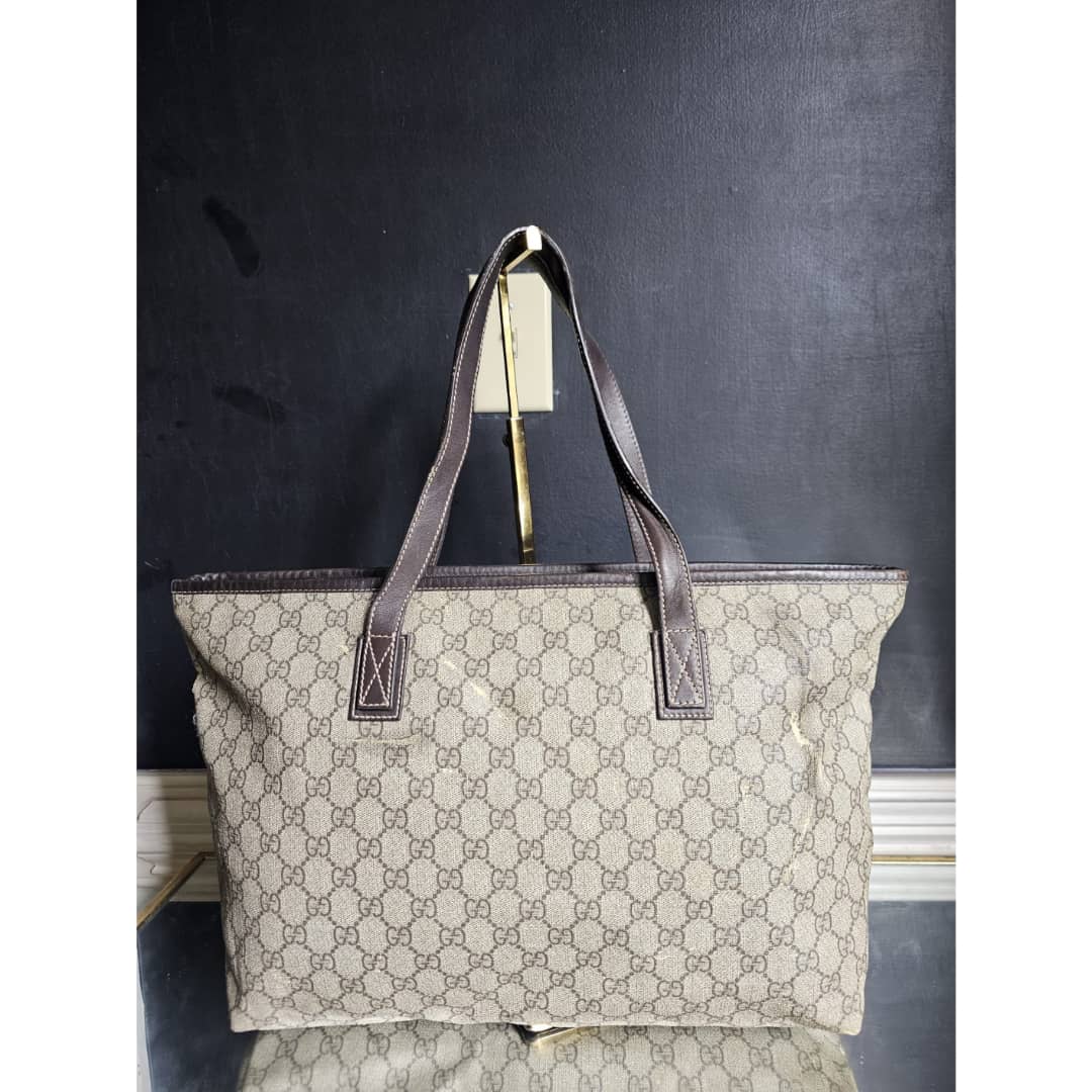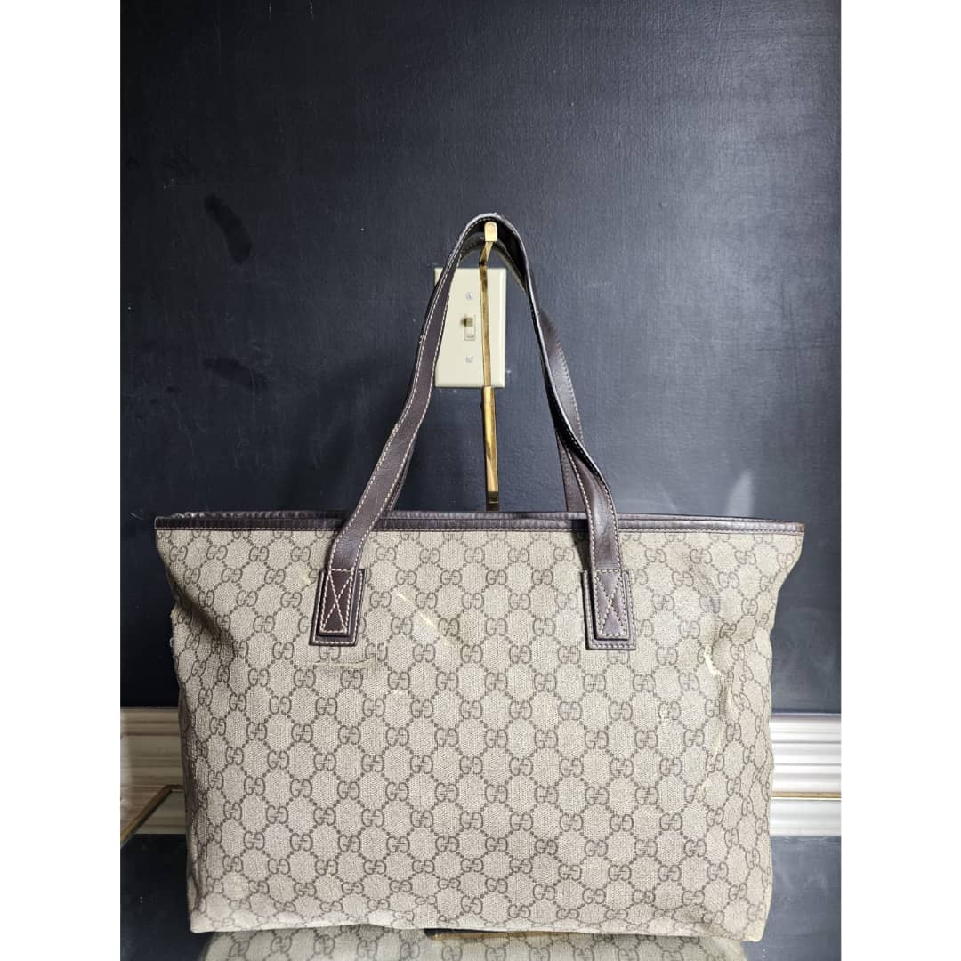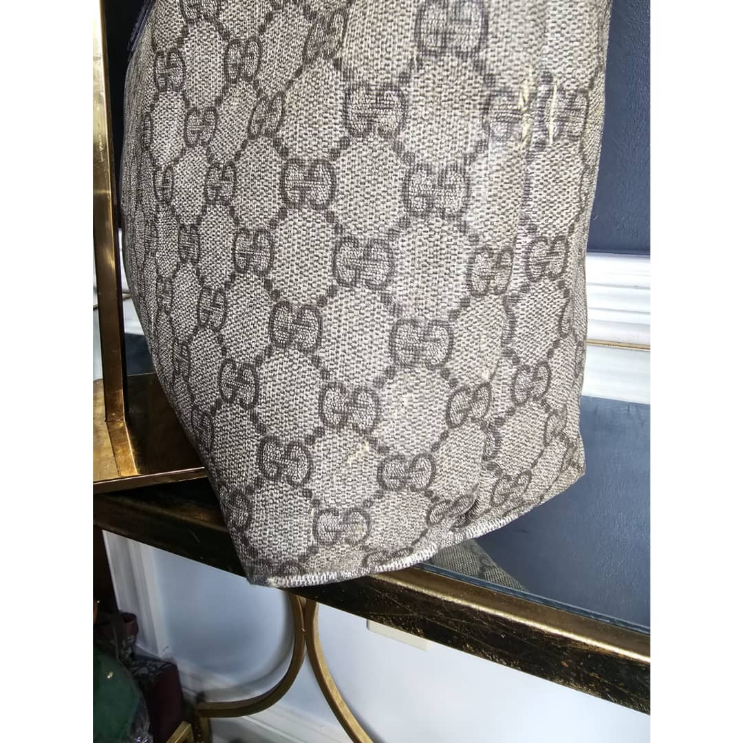 This authentic Gucci GG Imprimé Beige/Brown Bag is in it’s good pre-owned condition. The exterior coated canvas is clean and beautiful, shows sign of smudging heat wear. Brown leather trim handle is clean. Interior is clean. The front, back and corners of the bag shows sign of wear (Kindly review pictures above).