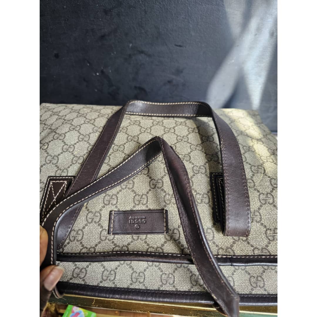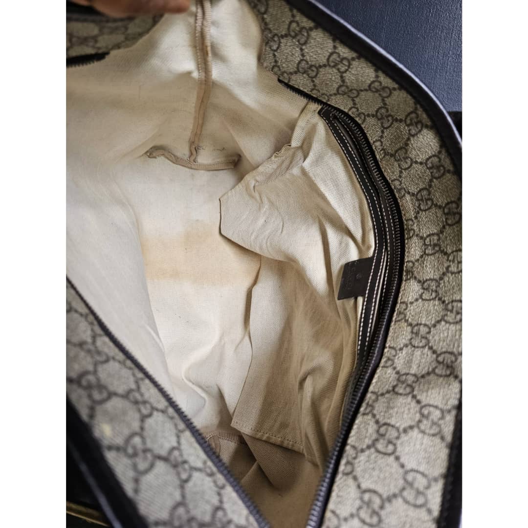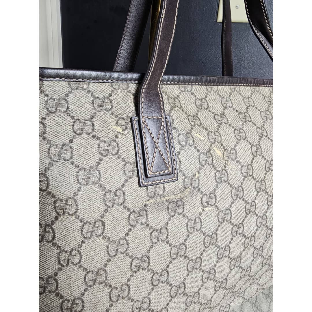 This authentic Gucci GG Imprimé Beige/Brown Bag is in it’s good pre-owned condition. The exterior coated canvas is clean and beautiful, shows sign of smudging heat wear. Brown leather trim handle is clean. Interior is clean. The front, back and corners of the bag shows sign of wear (Kindly review pictures above).