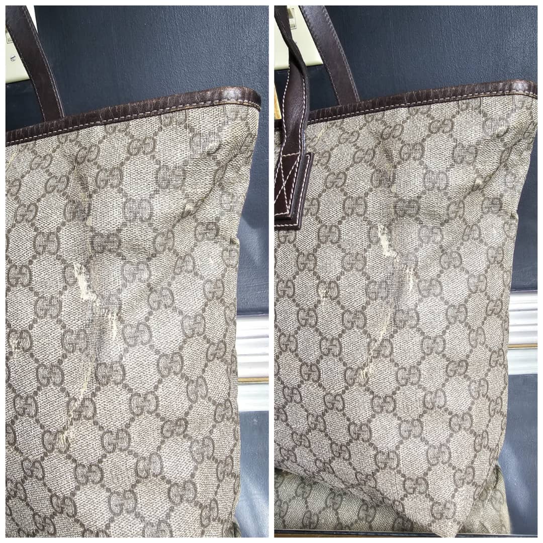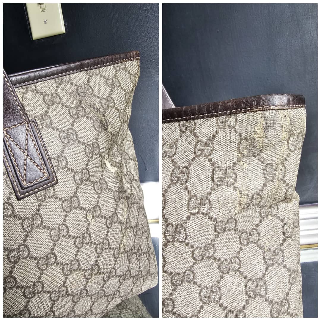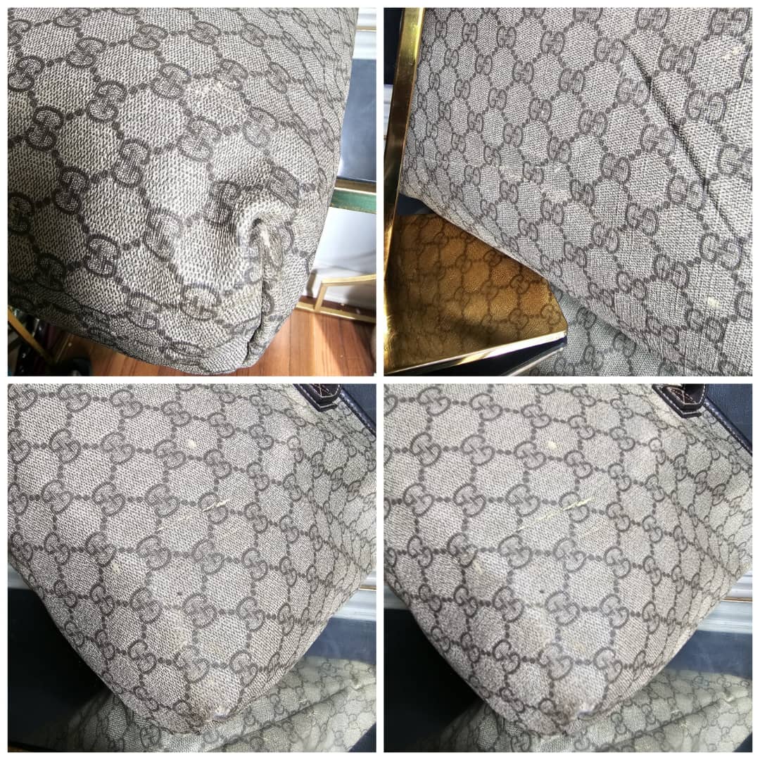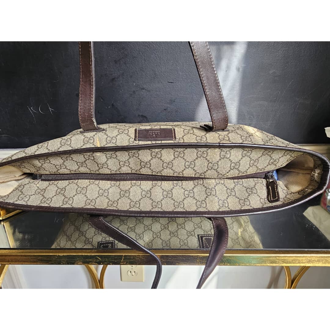 This authentic Gucci GG Imprimé Beige/Brown Bag is in it’s good pre-owned condition. The exterior coated canvas is clean and beautiful, shows sign of smudging heat wear. Brown leather trim handle is clean. Interior is clean. The front, back and corners of the bag shows sign of wear (Kindly review pictures above).