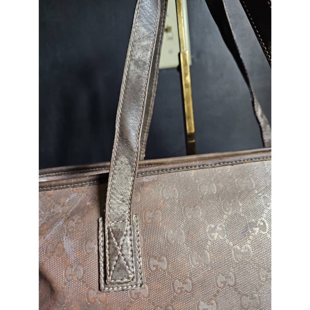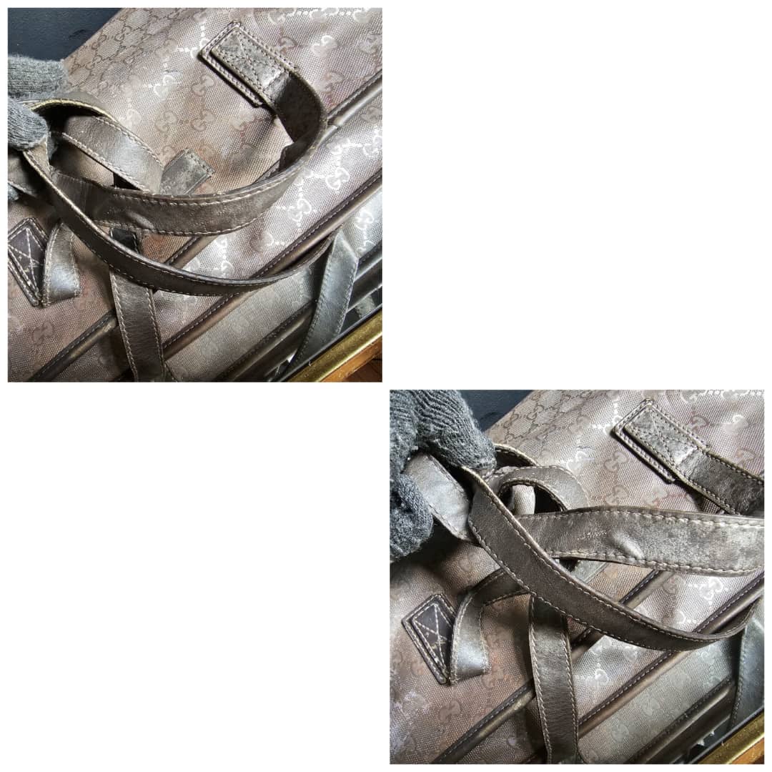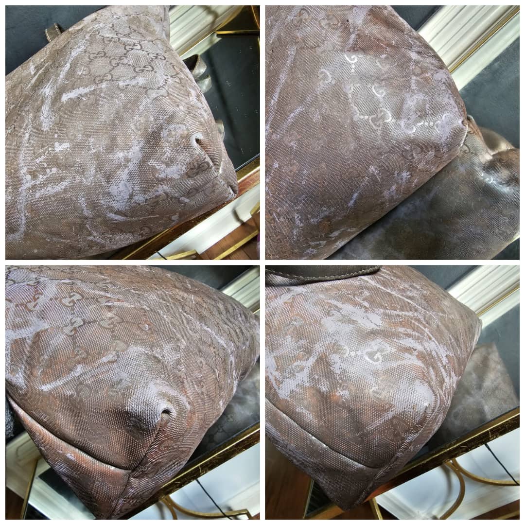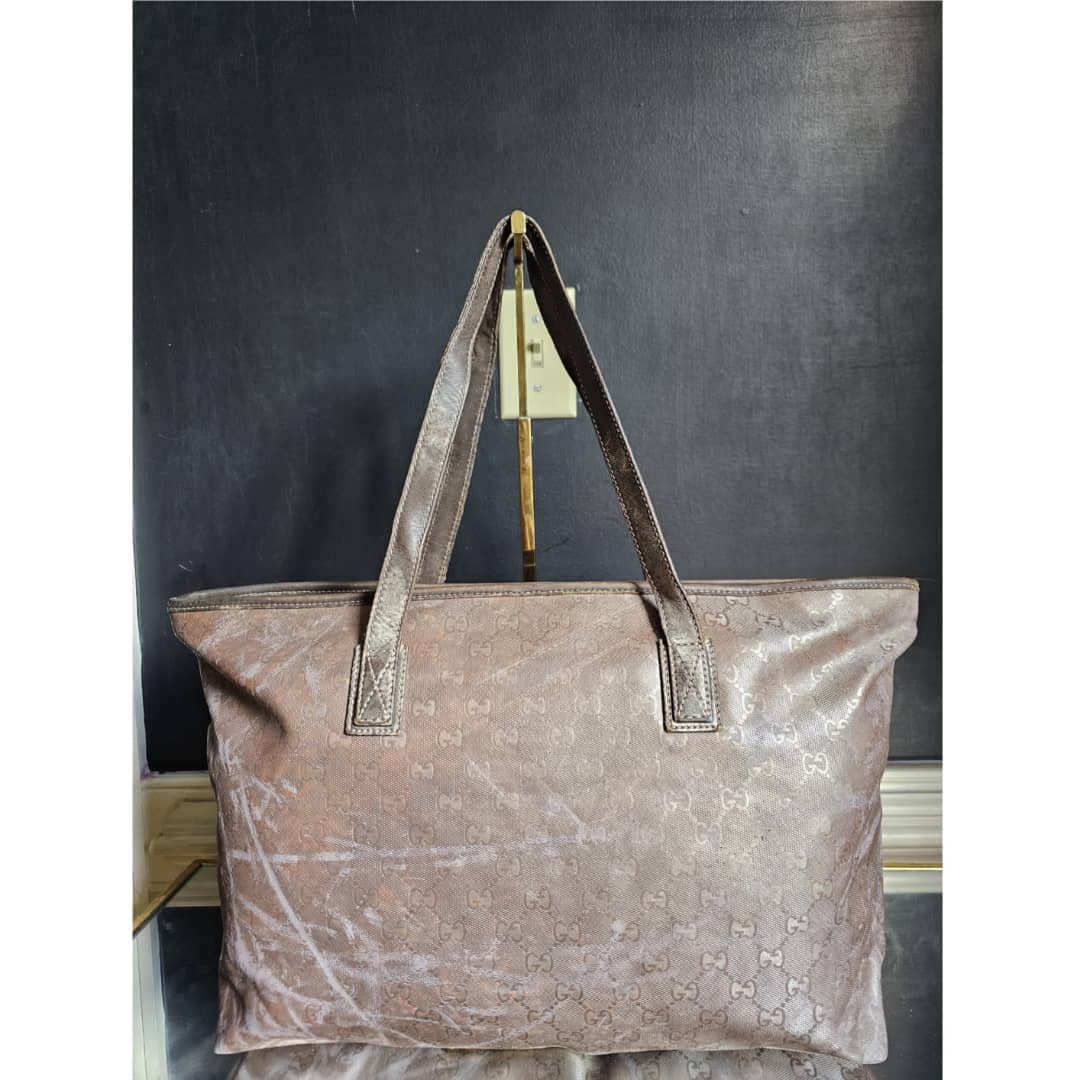 This authentic GUCCI GG Imprime Tote Bag is in it’s pre-owned condition. The exterior coated canvas is not in a good condition, shows a lot of wear, stains, discoloration on the canvas. Handle shows peeling. The overall exterior coated canvas needs revamping. Interior is in a good condition, it can also be colored completely before use.