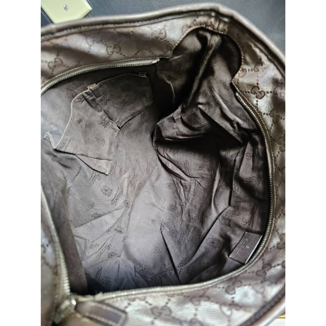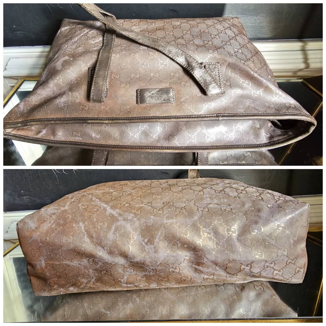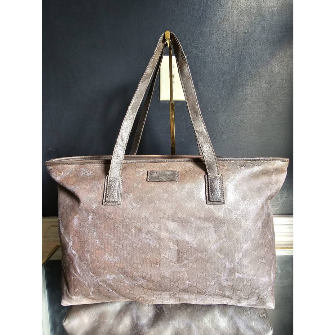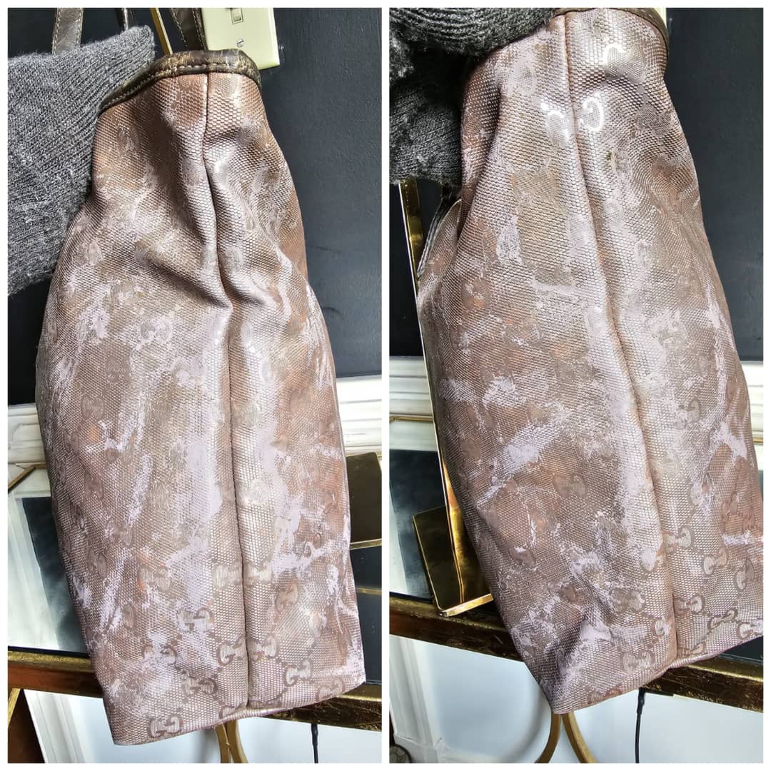 This authentic GUCCI GG Imprime Tote Bag is in it’s pre-owned condition. The exterior coated canvas is not in a good condition, shows a lot of wear, stains, discoloration on the canvas. Handle shows peeling. The overall exterior coated canvas needs revamping. Interior is in a good condition, it can also be colored completely before use.