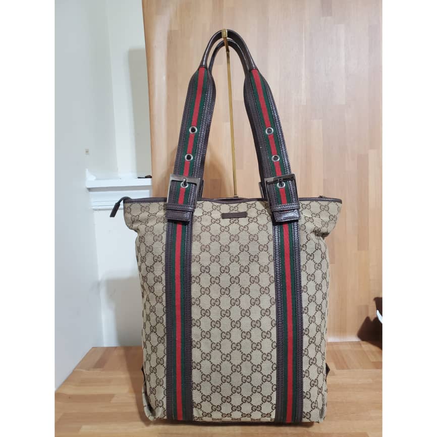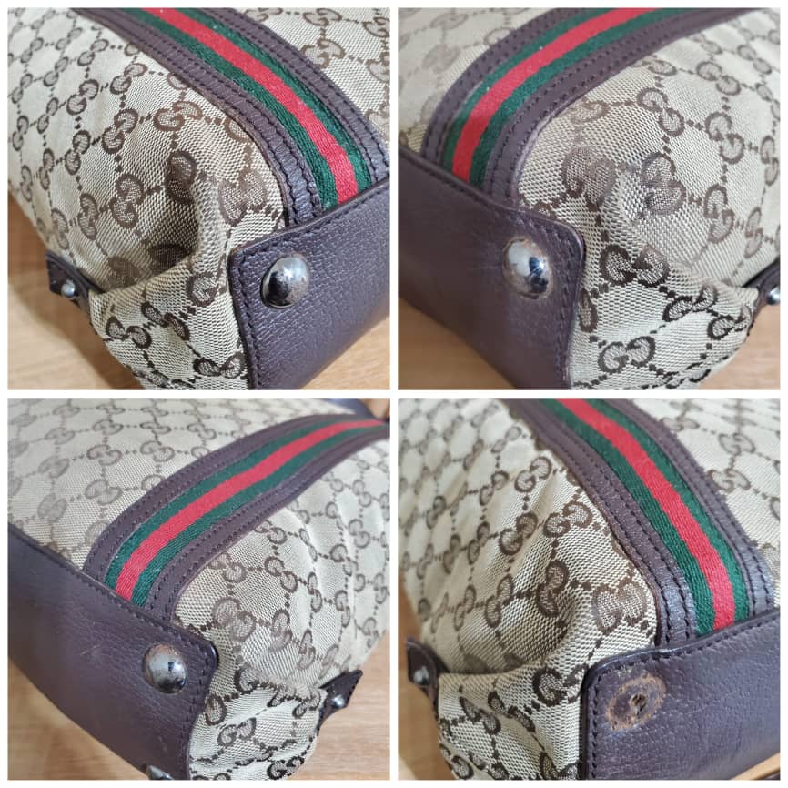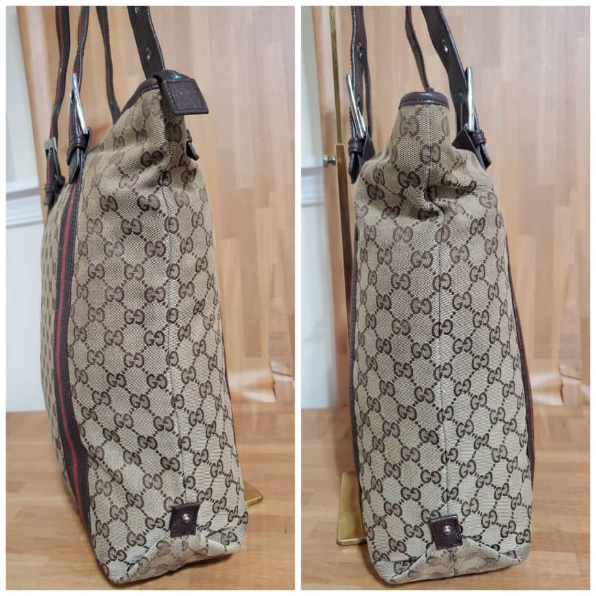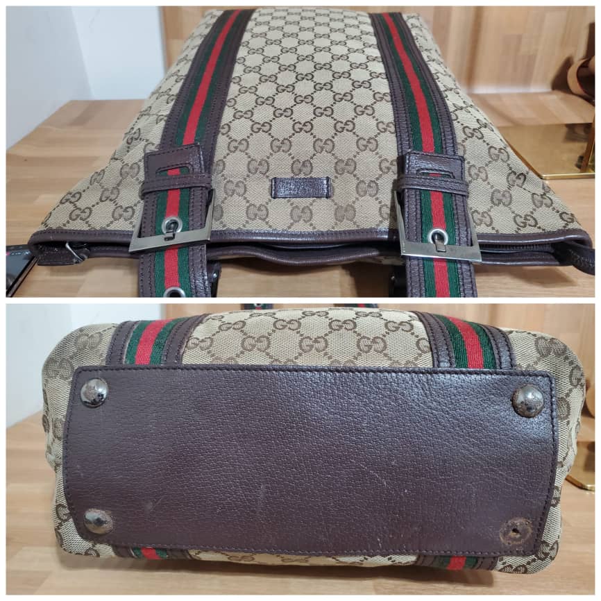 This authentic GUCCI GG Monogram Medium Web Handle Vertical Tote Bag Dark Brown is in good preowned condition . The exterior canvas is clean and beautiful. Interior is clean. This bag is gorgeous. Oboy oboy.