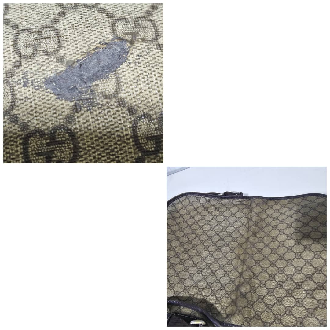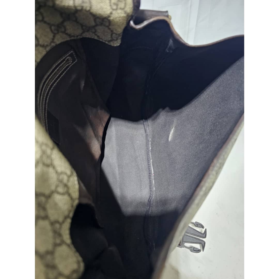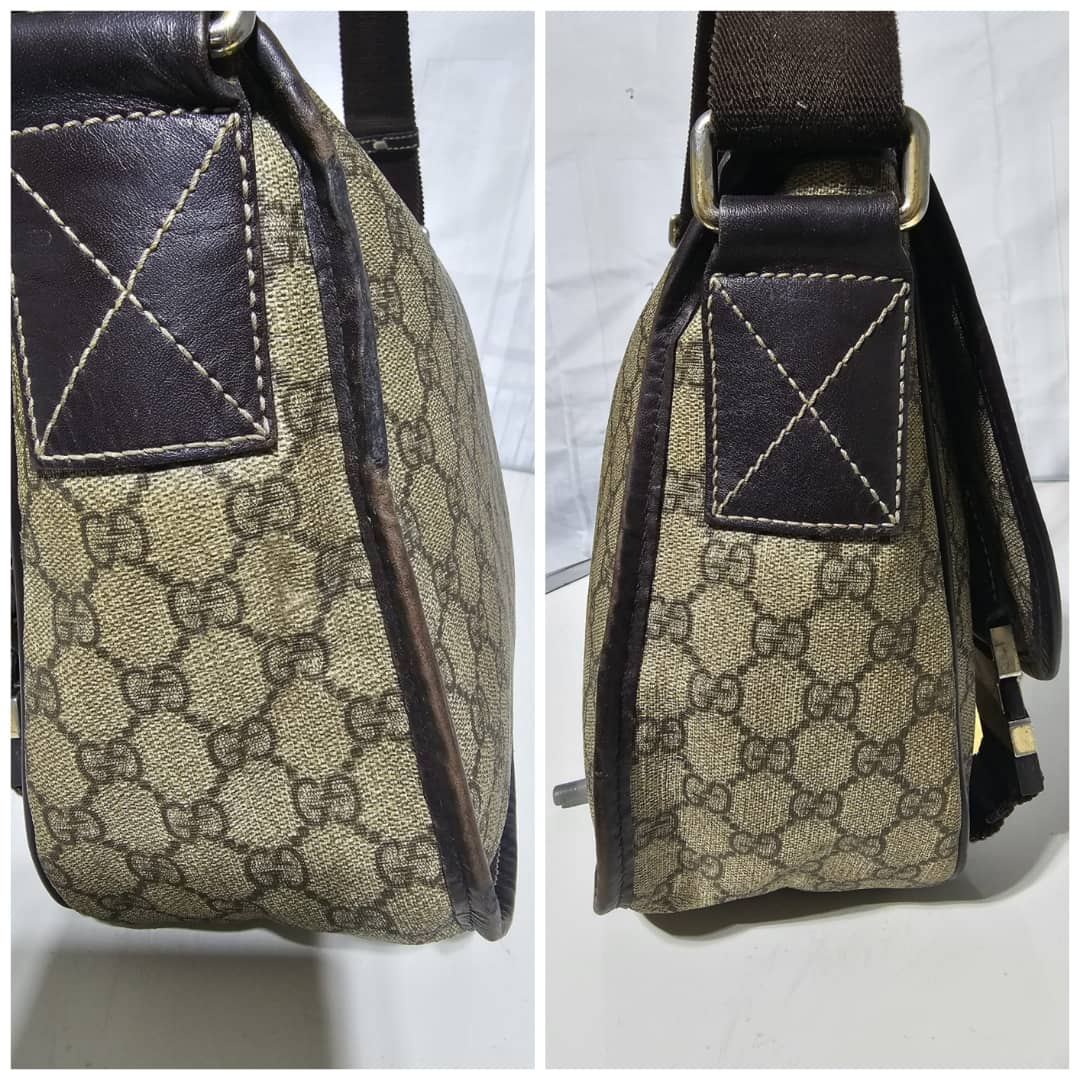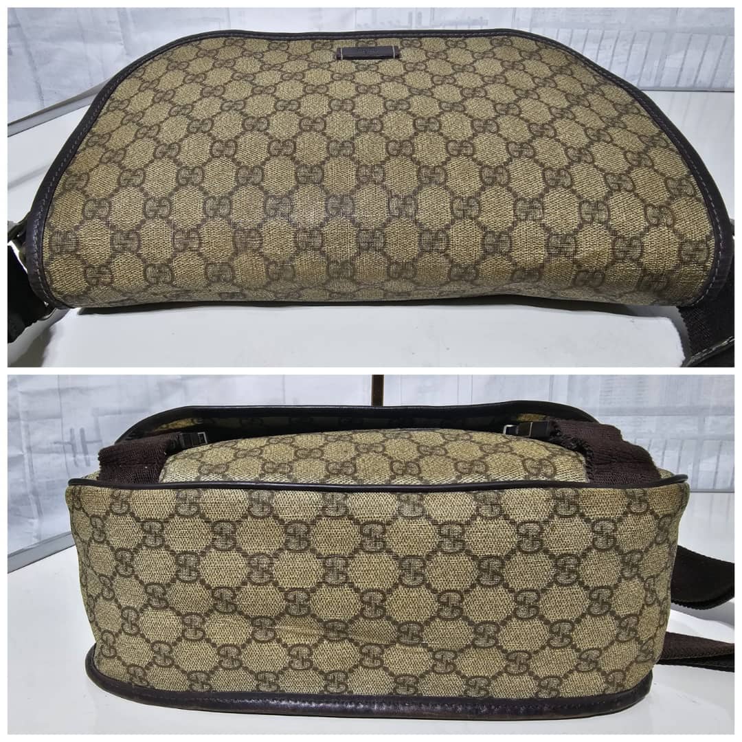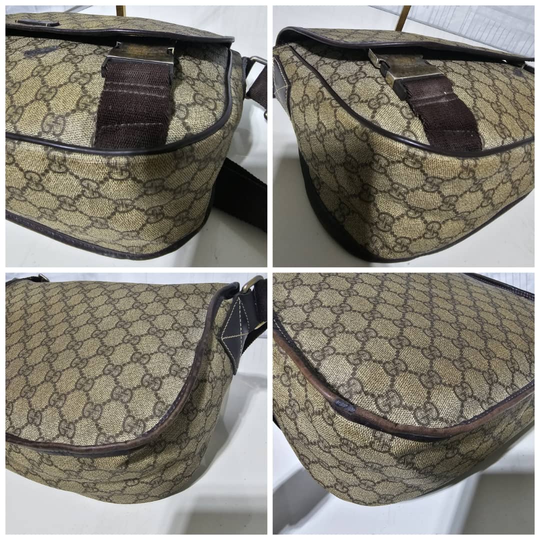 This authentic GUCCI GG Plus Monogram Medium Double Buckle Flap Messenger Bag Beige Brown is in it’s good pre-owned condition. The exterior canvas is clean and beautiful. The top flap shows sign of bubbles wear on the coated canvas, the brown leather trim that runs across the bag shows some scratches. There is a little scuffing wear when the flap is lifted up. The interior is clean. Kindly review pictures above