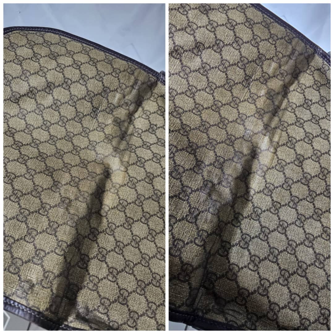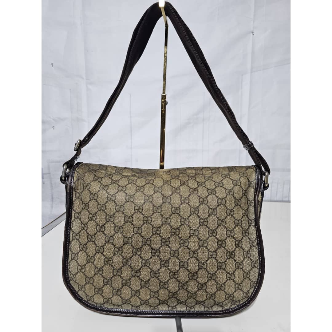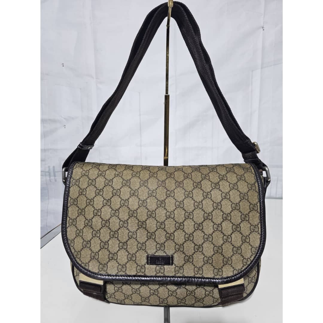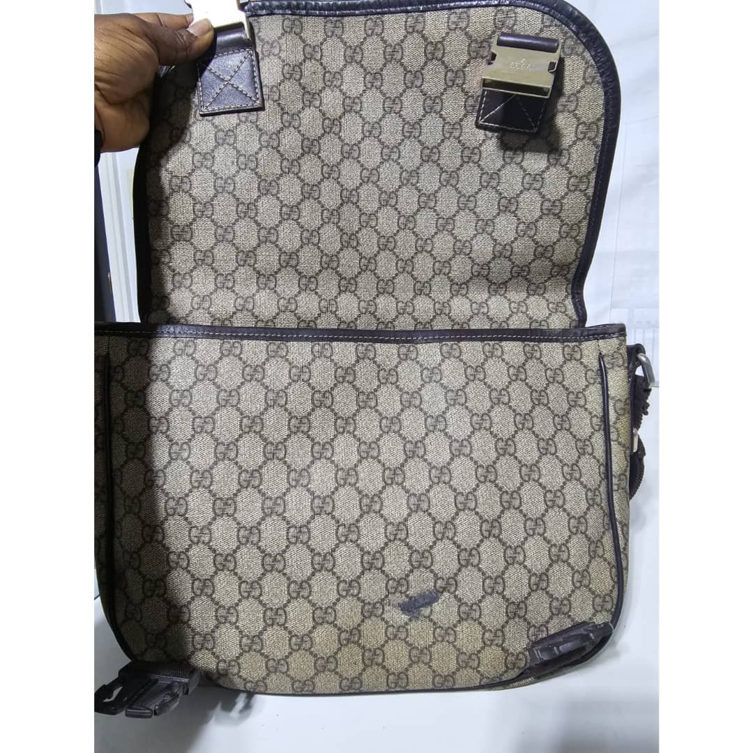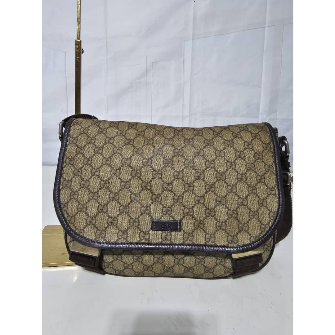 This authentic GUCCI GG Plus Monogram Medium Double Buckle Flap Messenger Bag Beige Brown is in it’s good pre-owned condition. The exterior canvas is clean and beautiful. The top flap shows sign of bubbles wear on the coated canvas, the brown leather trim that runs across the bag shows some scratches. There is a little scuffing wear when the flap is lifted up. The interior is clean. Kindly review pictures above