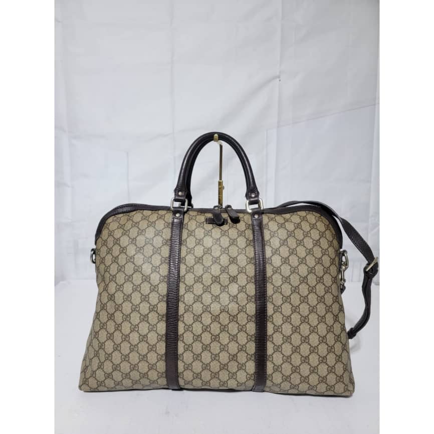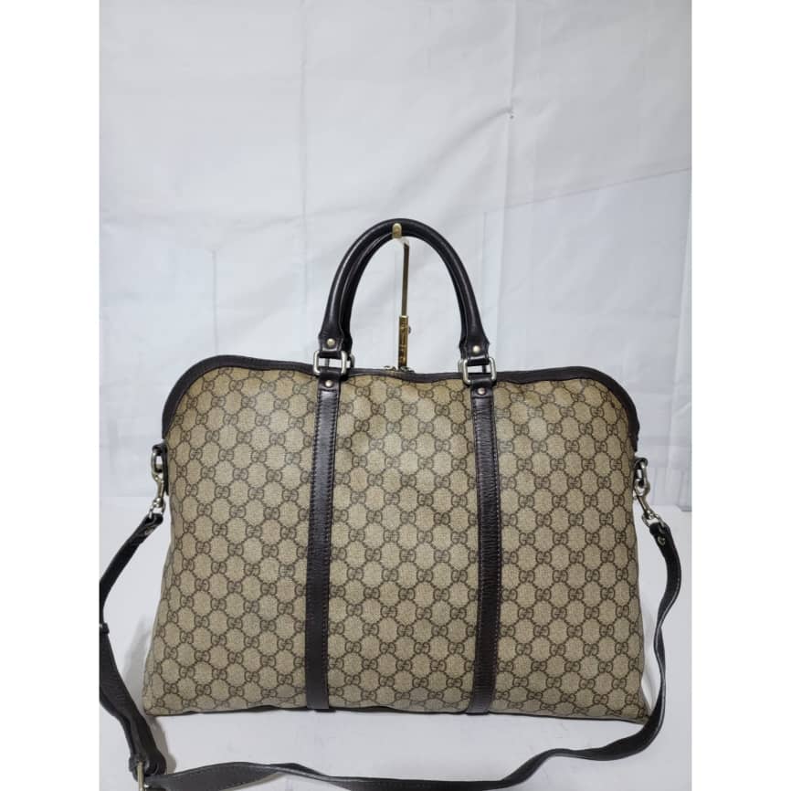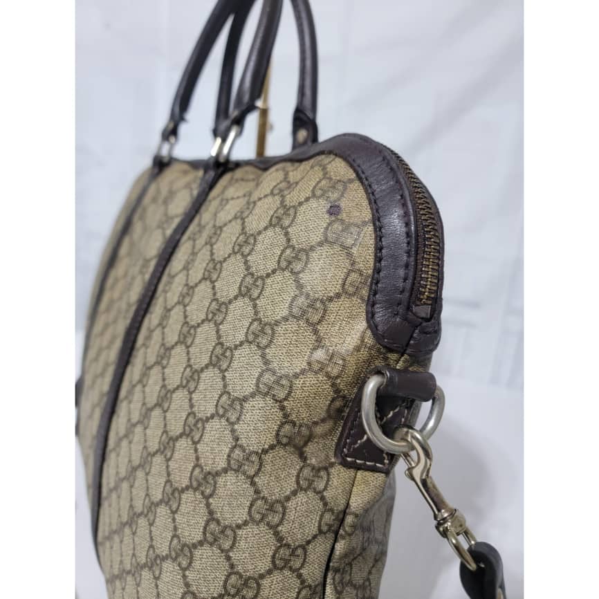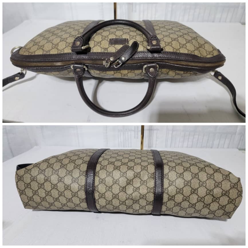 This authentic GUCCI GG Plus Monogram Double Handle Briefcase Dark Brown/Beige is in it’s pre-owned condition. The exterior coated canvas is in good condition and clean however, it shows some sign of use. Interior is clean but shows some rubbing to the top edges. Silver hardware shows scratches. It comes with a long strap. It can be worn as a weekender bag or a briefcase, it can fit a big laptop.