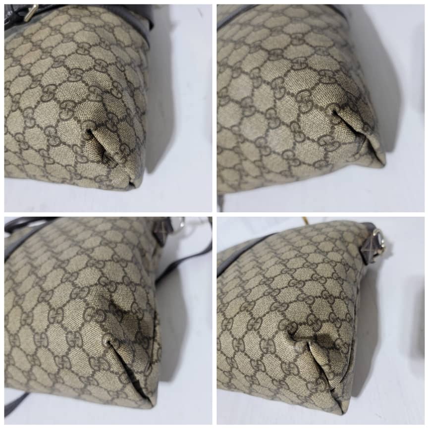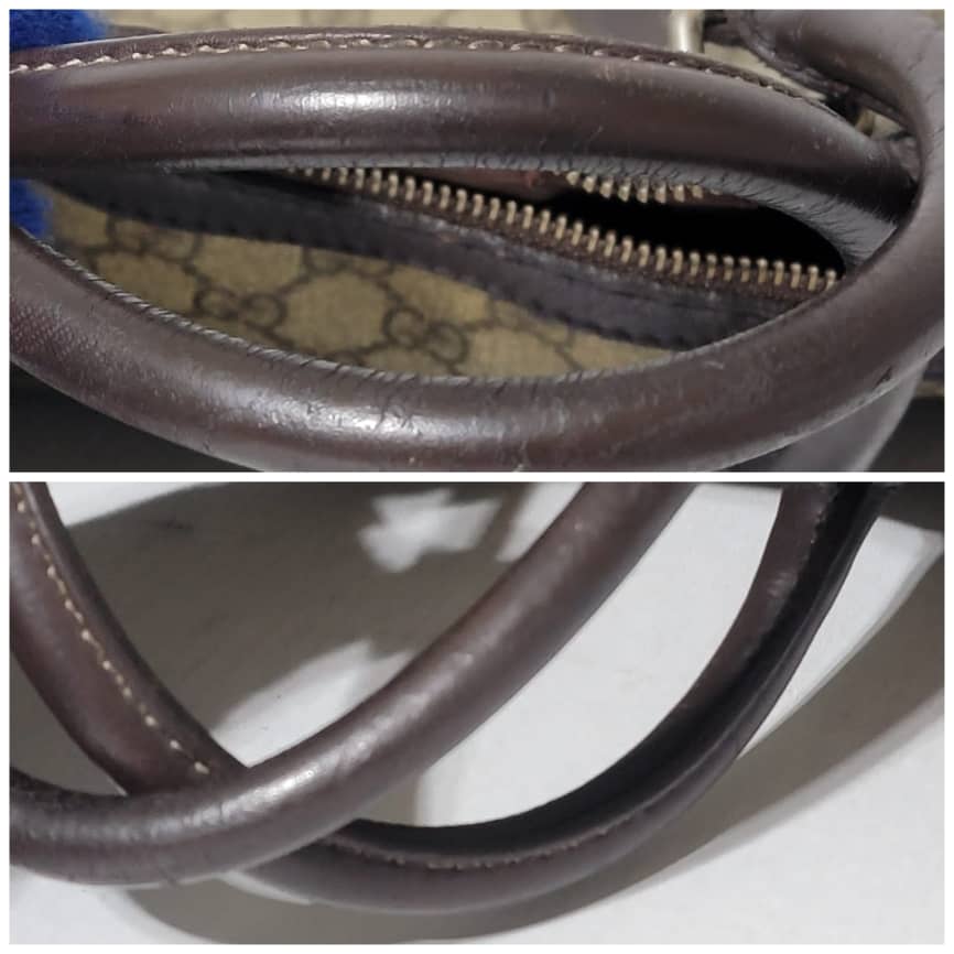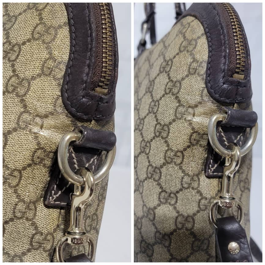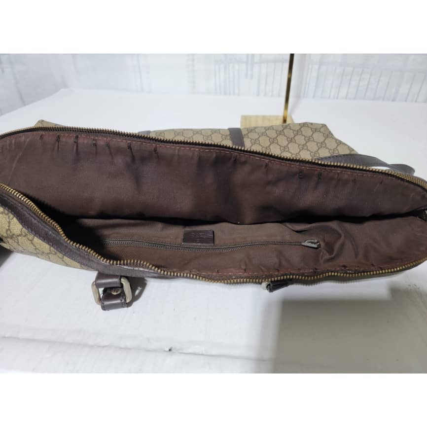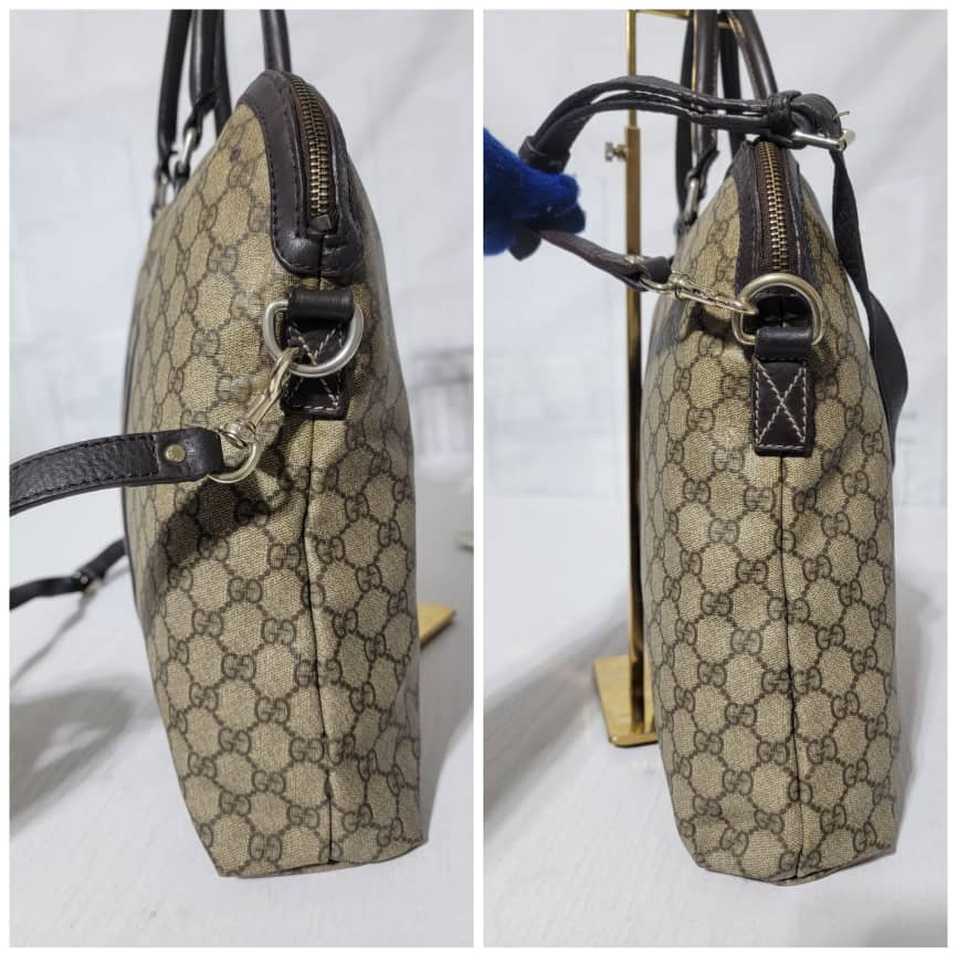 This authentic GUCCI GG Plus Monogram Double Handle Briefcase Dark Brown/Beige is in it’s pre-owned condition. The exterior coated canvas is in good condition and clean however, it shows some sign of use. Interior is clean but shows some rubbing to the top edges. Silver hardware shows scratches. It comes with a long strap. It can be worn as a weekender bag or a briefcase, it can fit a big laptop.