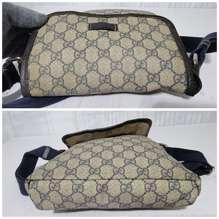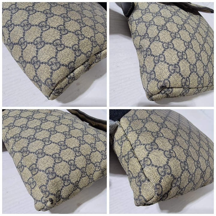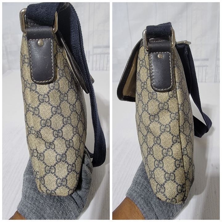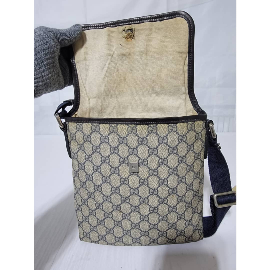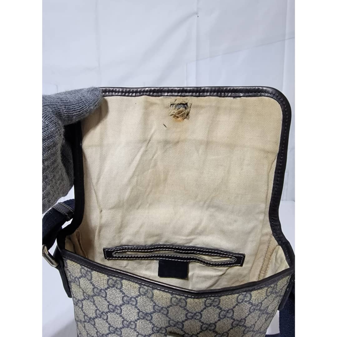 This authentic GUCCI GG Plus Monogram Sellieria Calfskin Small Flap Crossbody Bag Beige/Blue is in it’s pre-owned condition. The exterior coated canvas is clean, however it shows sign of aging wear. Interior shows sign of wear. The lock is out and shows tear. Interior is clean, however shows some stains (Kindly look at pictures above). There are some scratches by the side of the leather. Has an adjustable strap and some scuffing at the base edge.