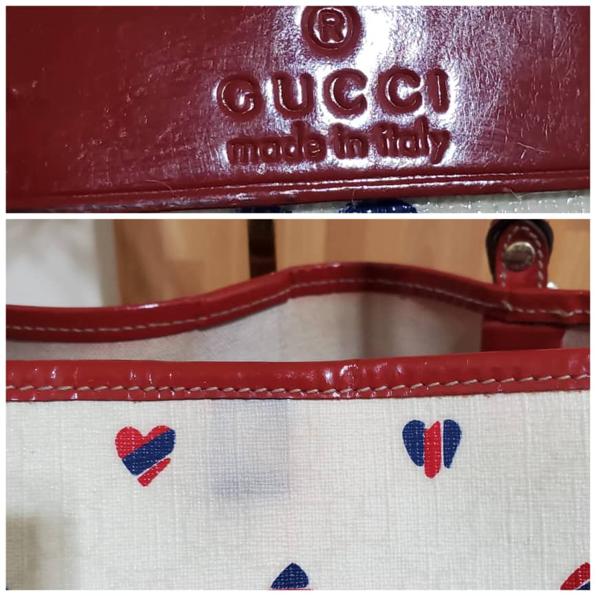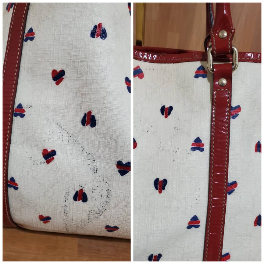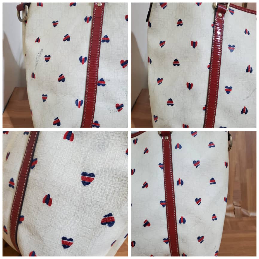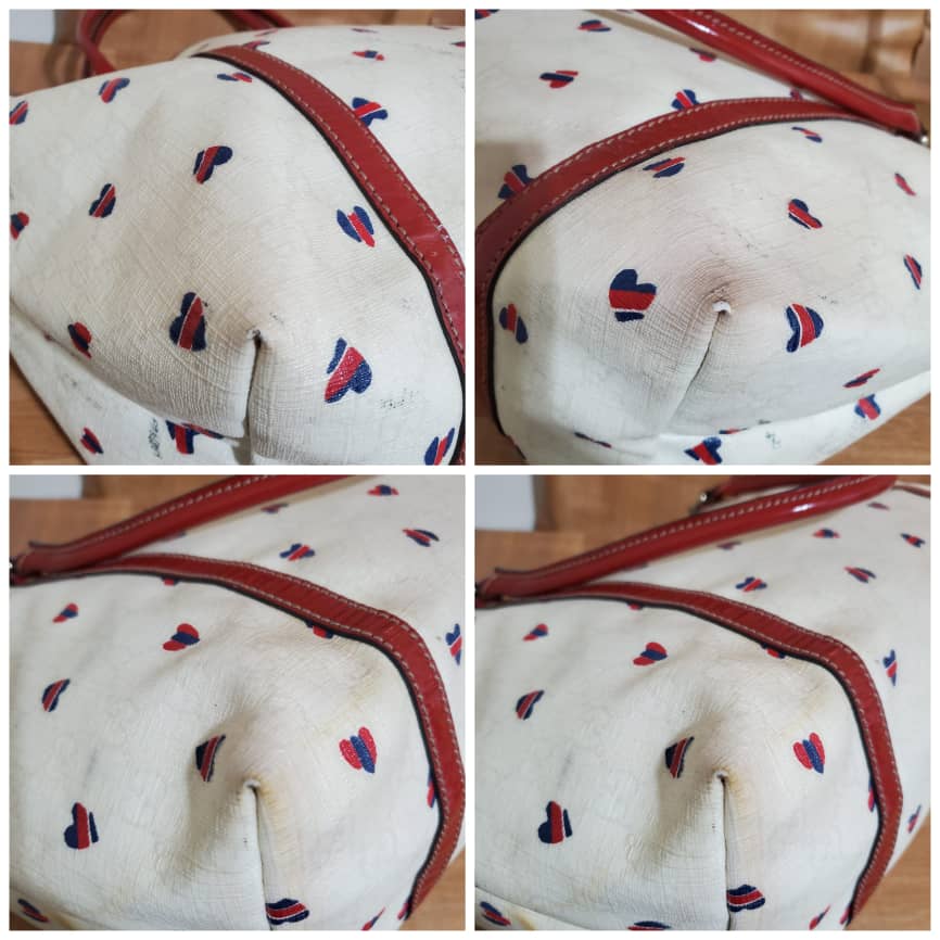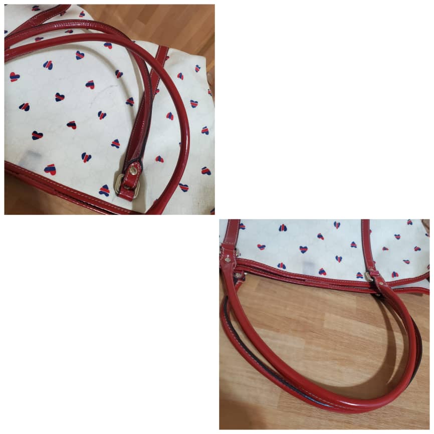 This authentic Gucci Gg Supreme heart Joy Medium Tote is in its pre-owned condition.has sign of use. The exterior coated canvas has some black dots stains. Interior is clean. Kindly refer to pictures above. Handles is clean.