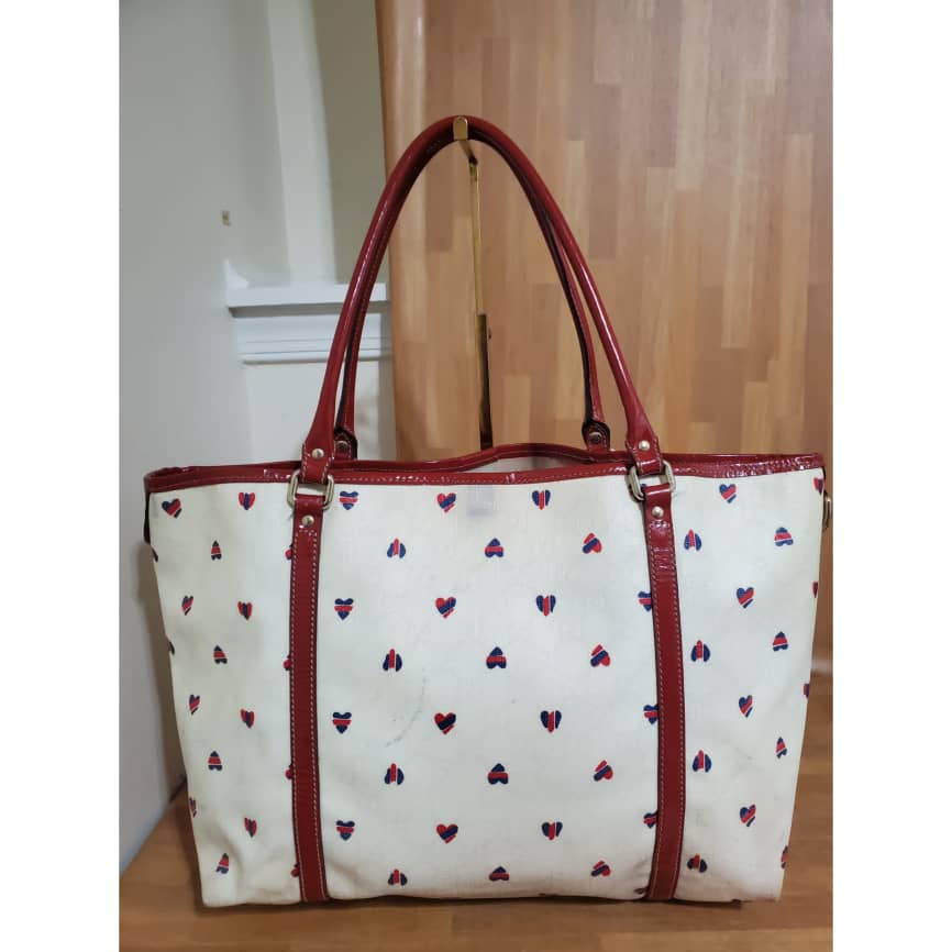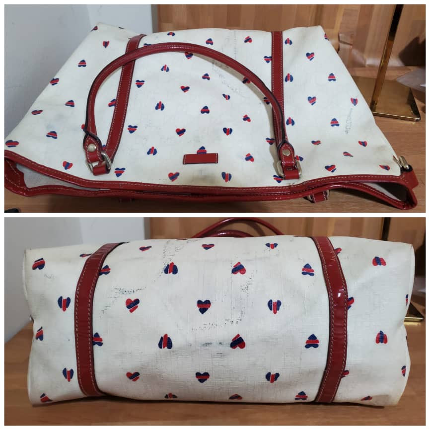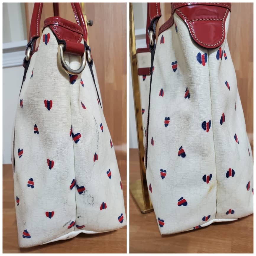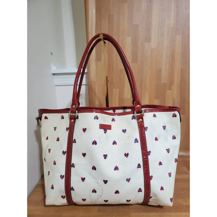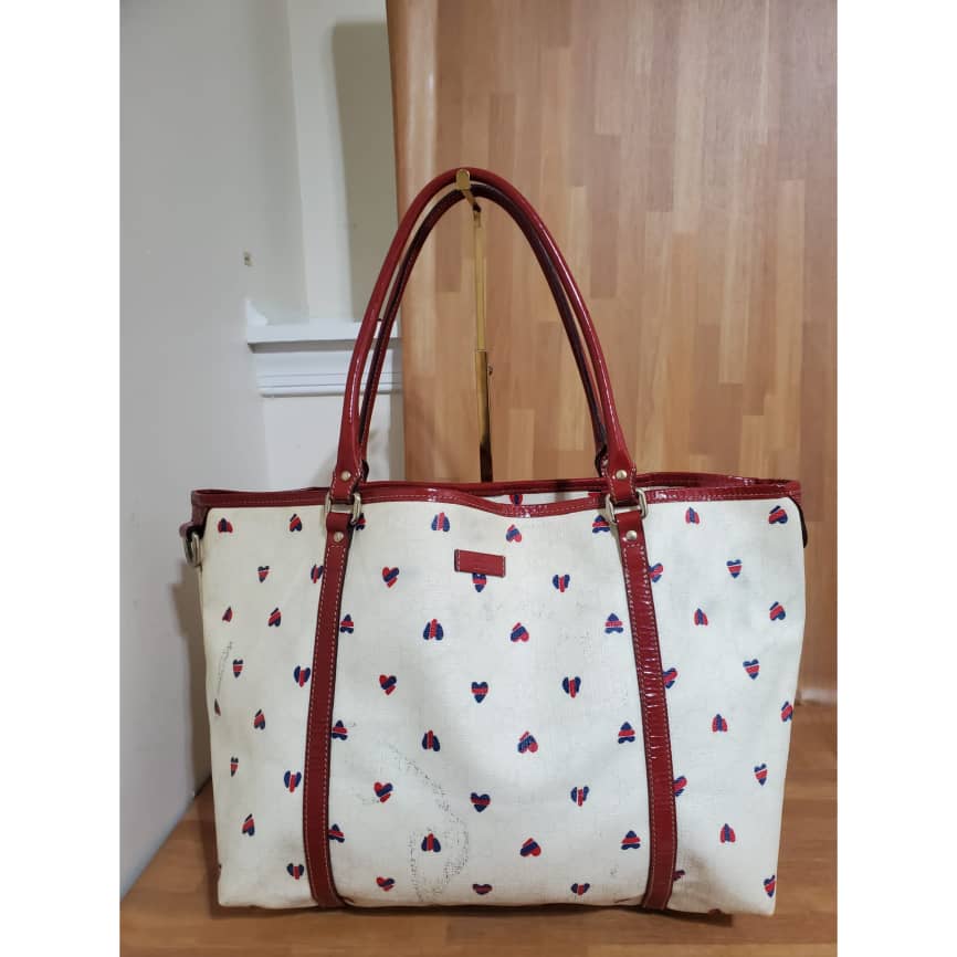 This authentic Gucci Gg Supreme heart Joy Medium Tote is in its pre-owned condition.has sign of use. The exterior coated canvas has some black dots stains. Interior is clean. Kindly refer to pictures above. Handles is clean.