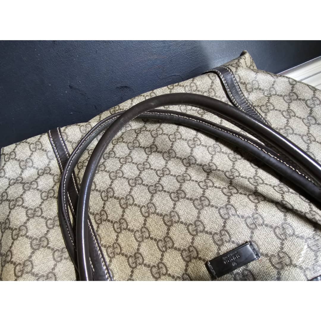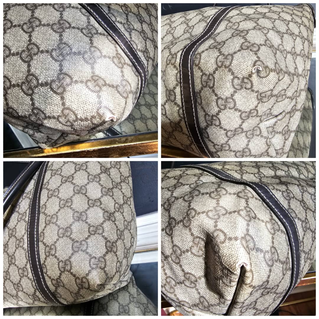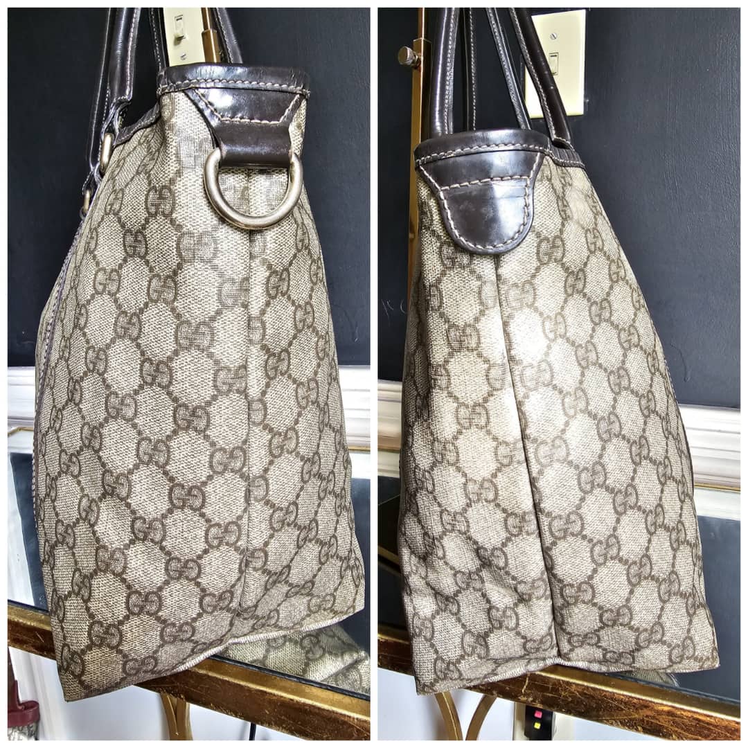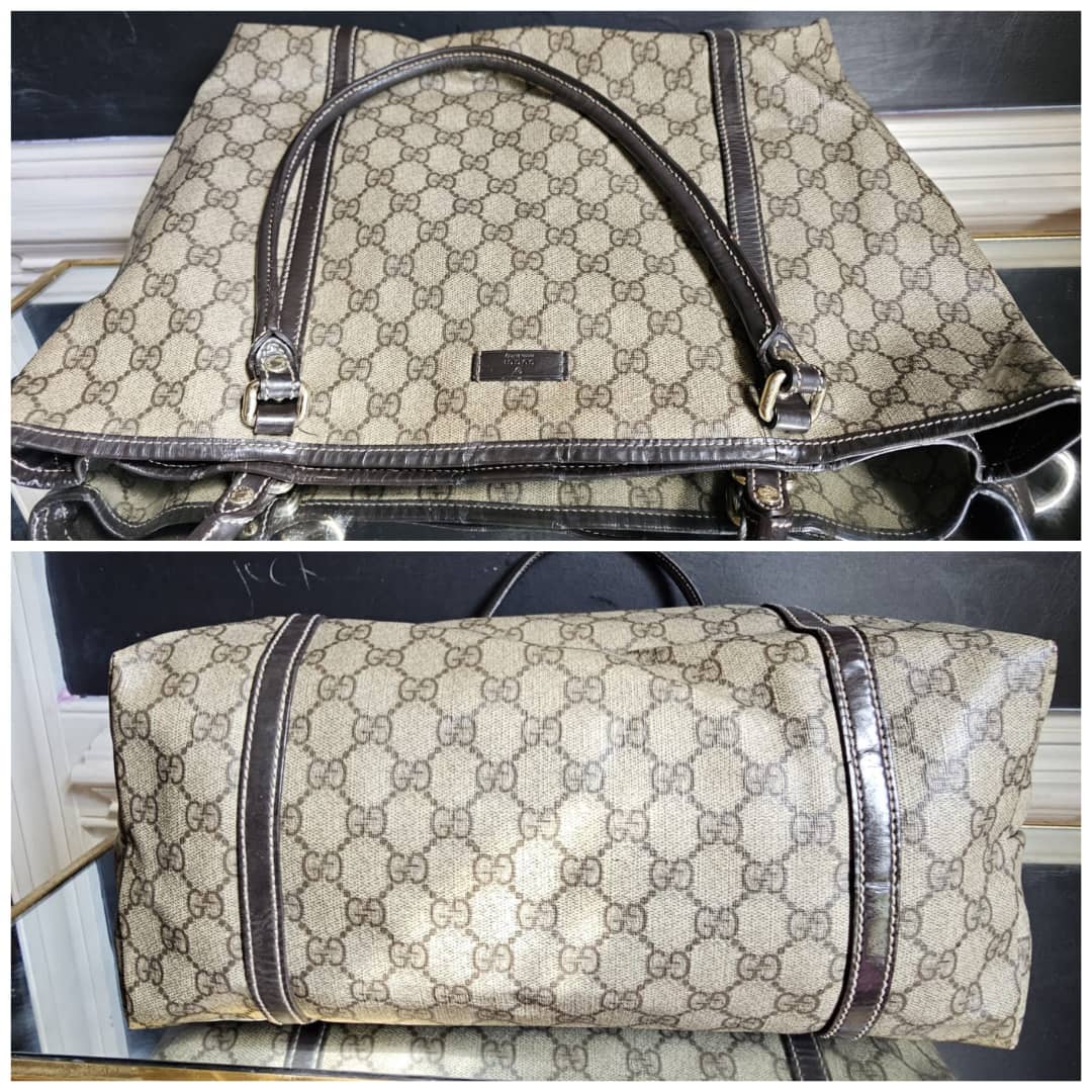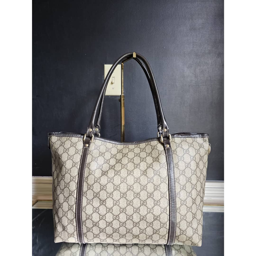 This authentic Gucci GG Supreme Joy Tote Bag Beige/Brown is in it’s good pre-owned condition. The exterior canvas is clean and beautiful. The brown leather trim and handle is clean. Interior is clean shows sign of use. The base edges corners shows little scuffing.